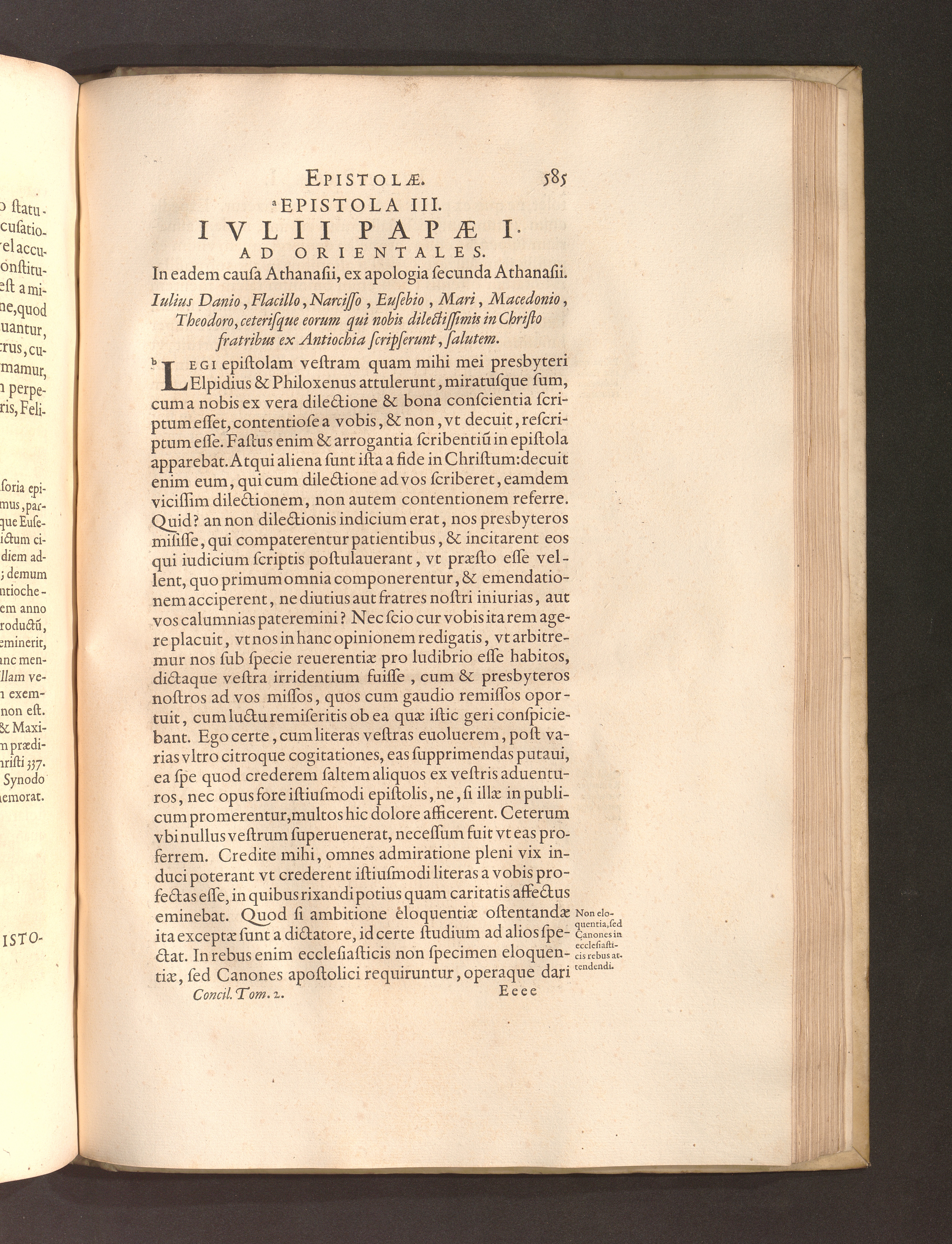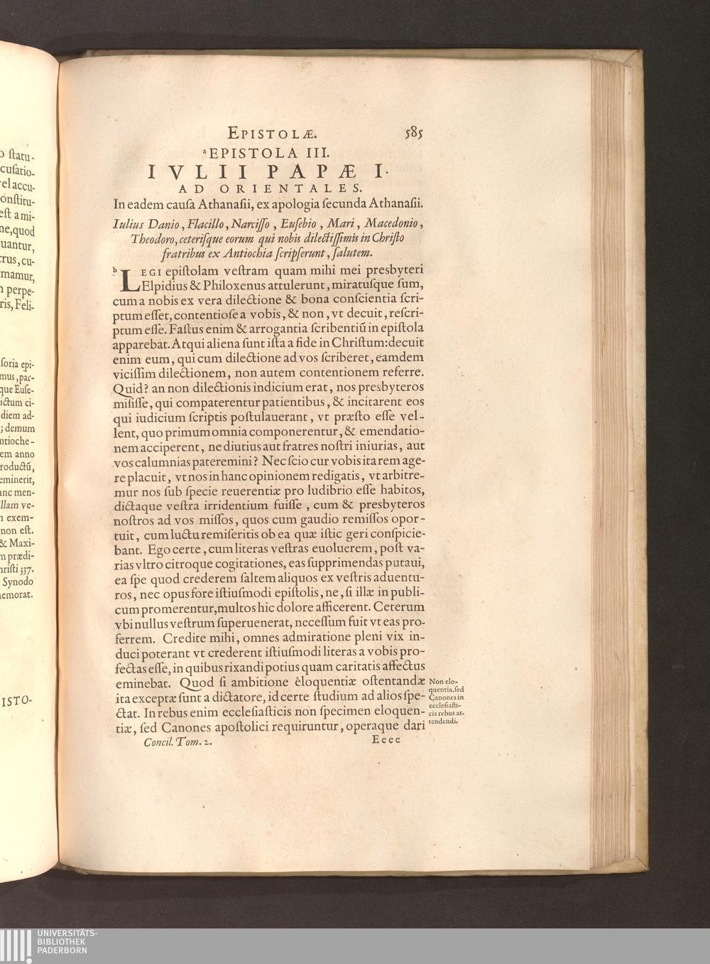 Epistola III. Ivlii Papae I. Ad Orientales. In eadem causa Athanasii, ex apologia[...]