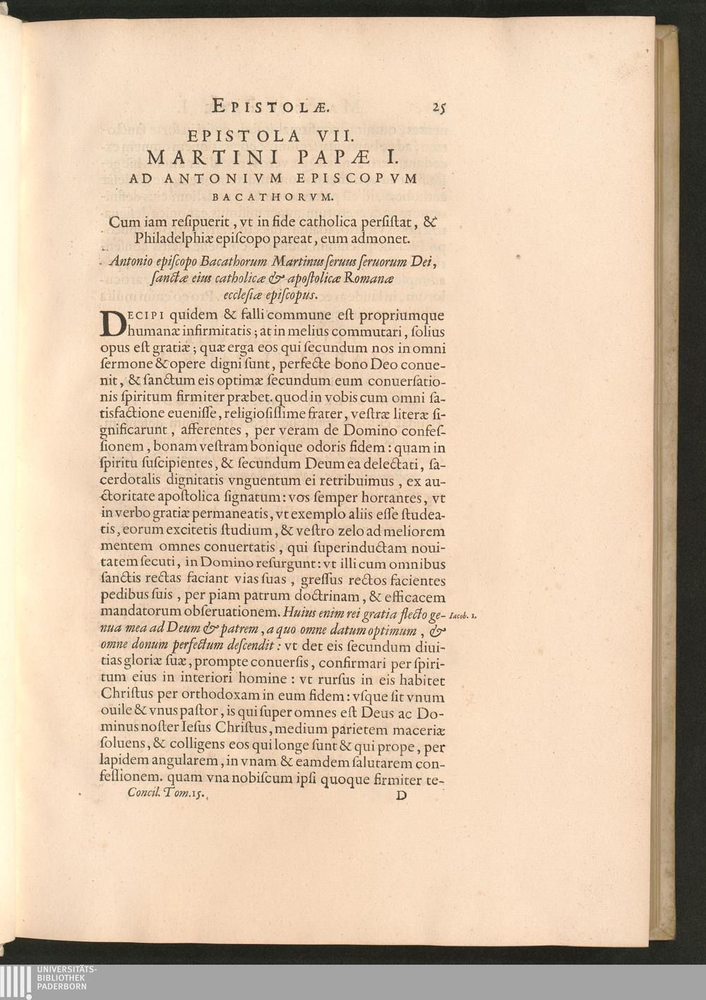 Epistola VII. Martini Papae I. Ad Antonivm Episcopvm Bacathorvm. Cum iam resipuerit,[...]