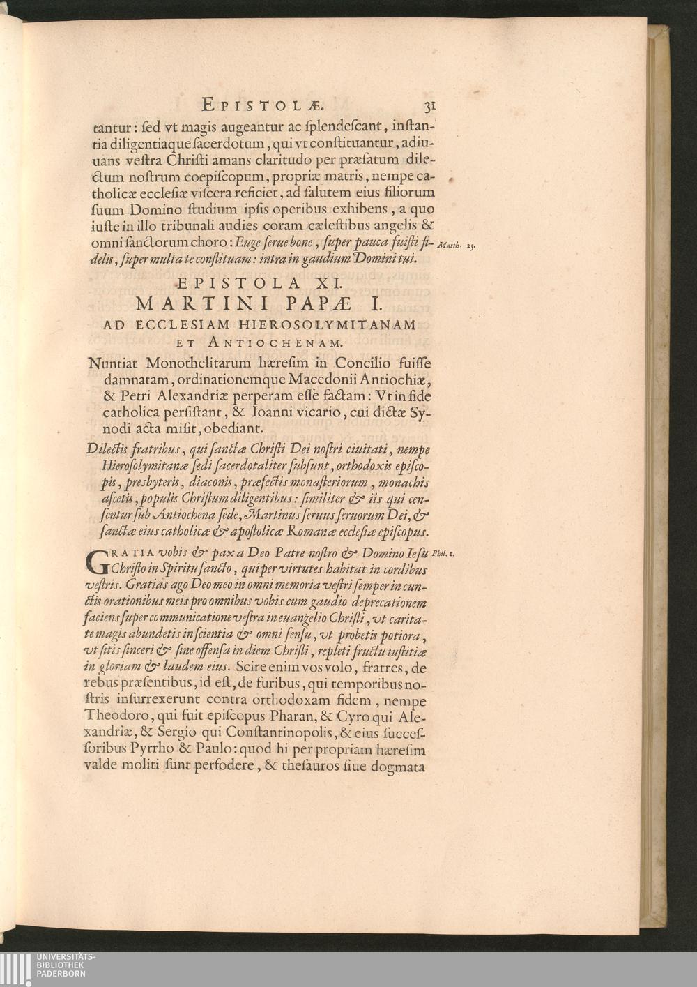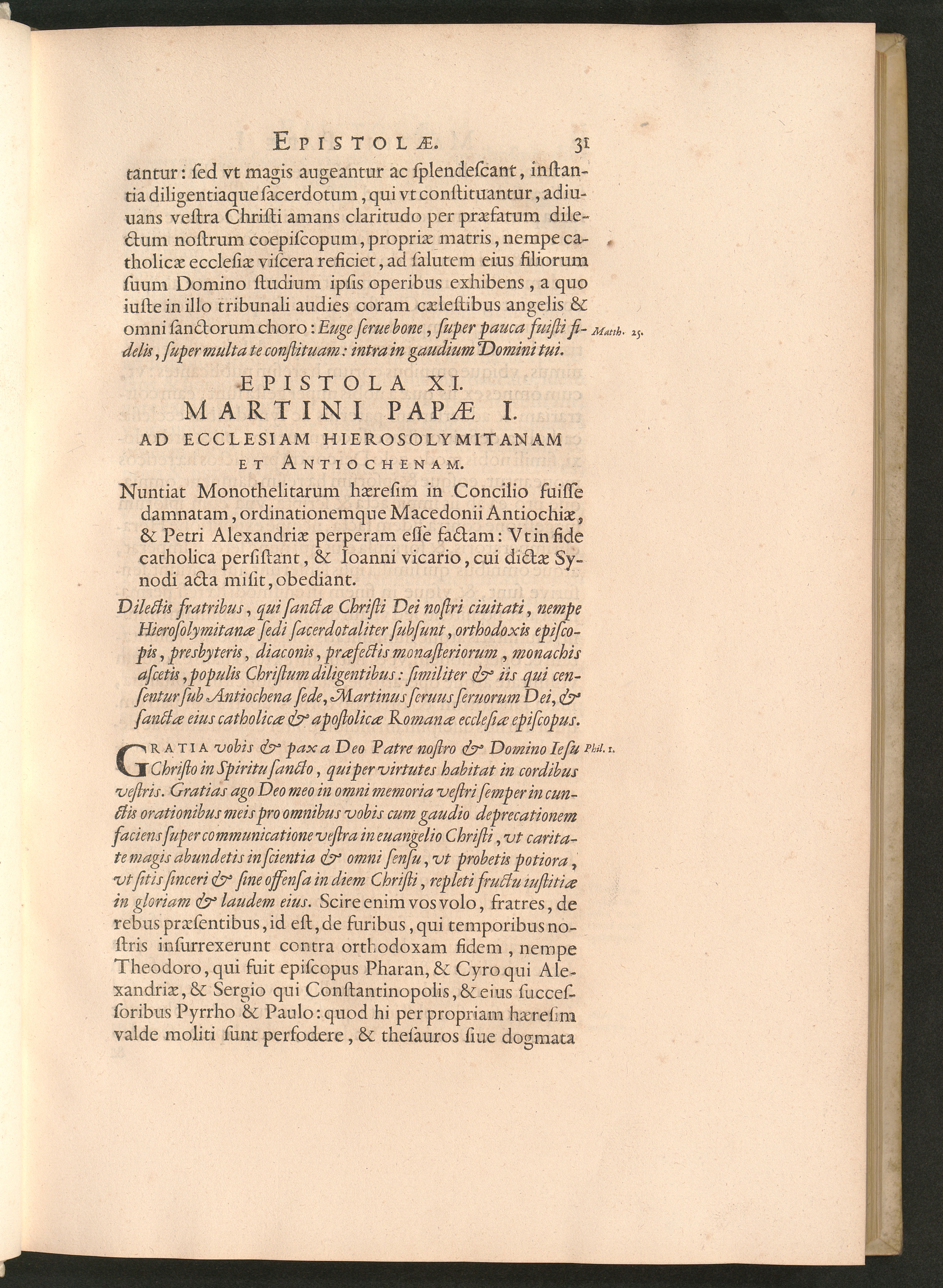Epistola XI. Martini Papae I. Ad Ecclesiam Hierosolymitanam Et Antiochenam. Nuntiat[...]