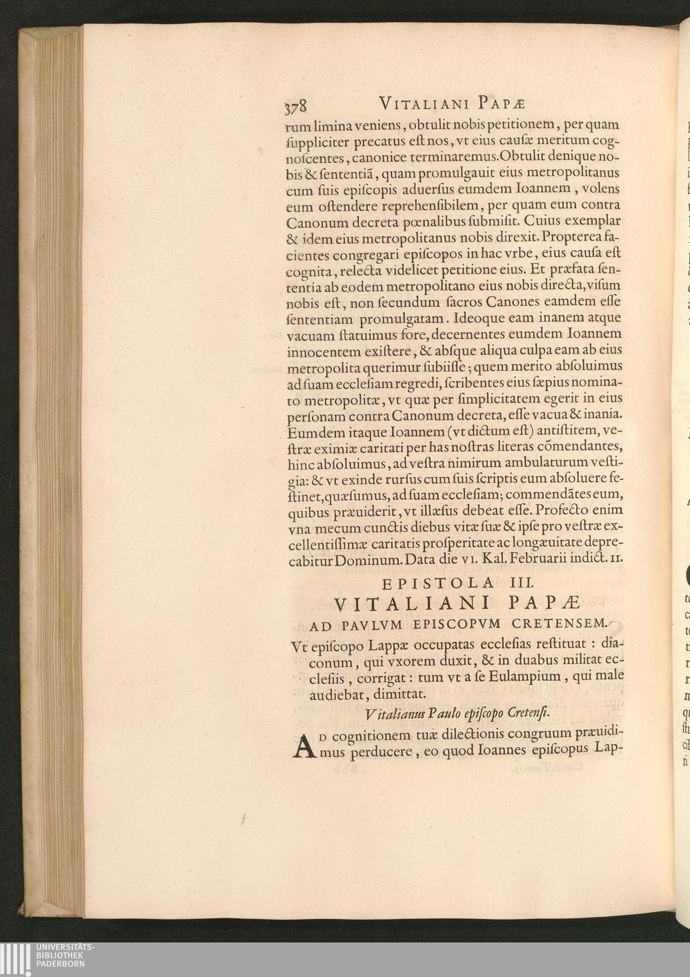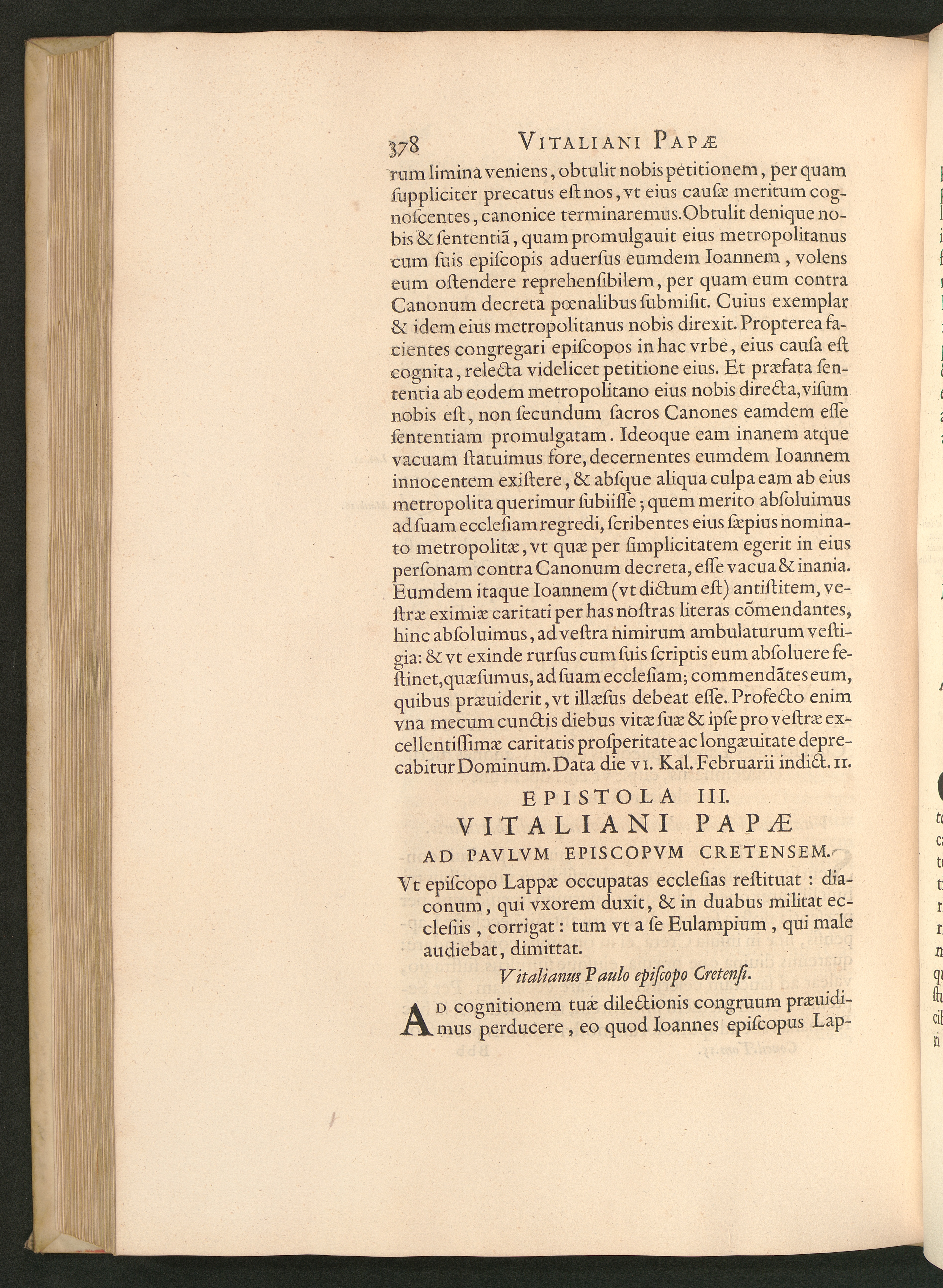 Epistola III. Vitaliani Papae Ad Pavlvm Episcopvm Cretensem. Vt episcopo Lappae occupatas[...]