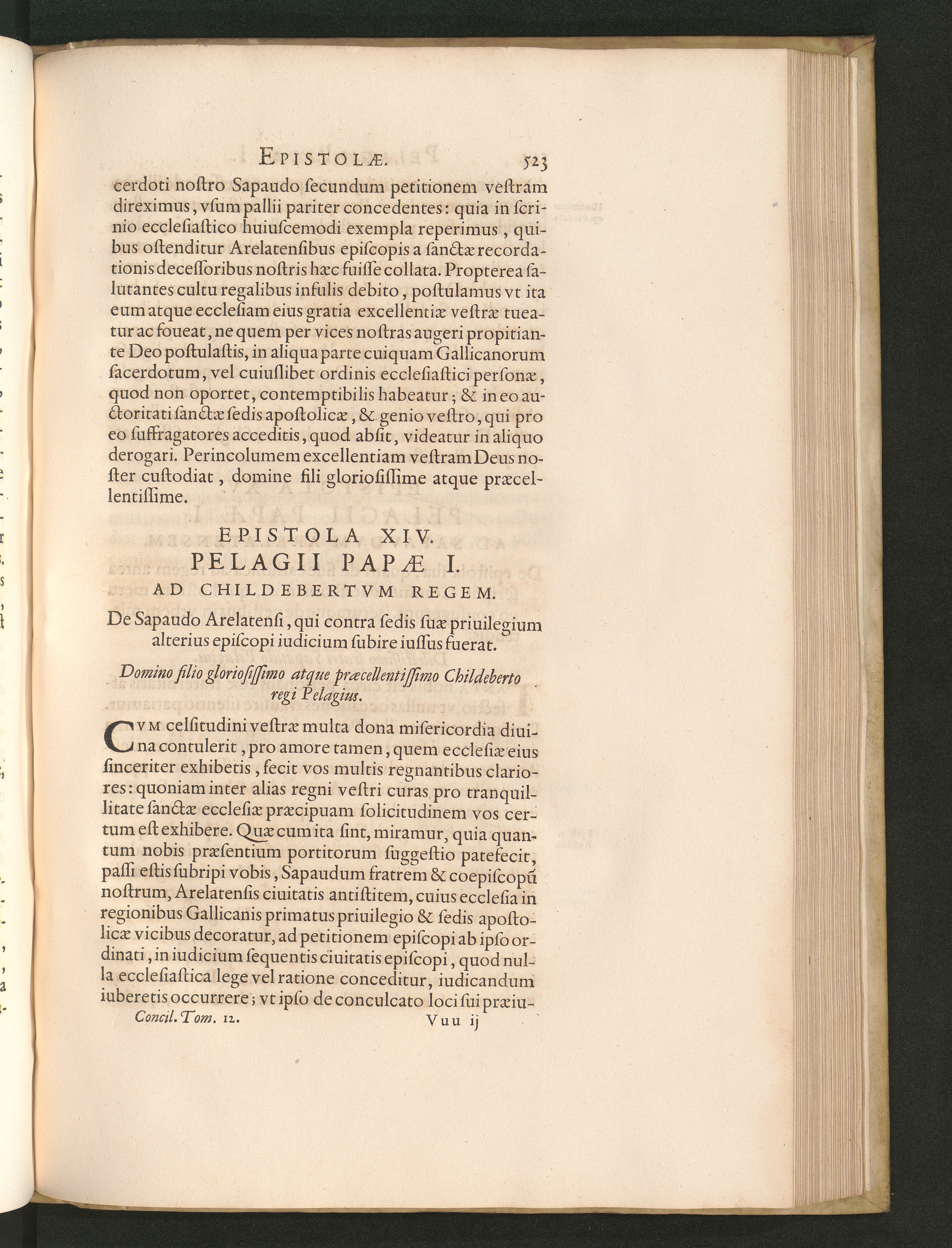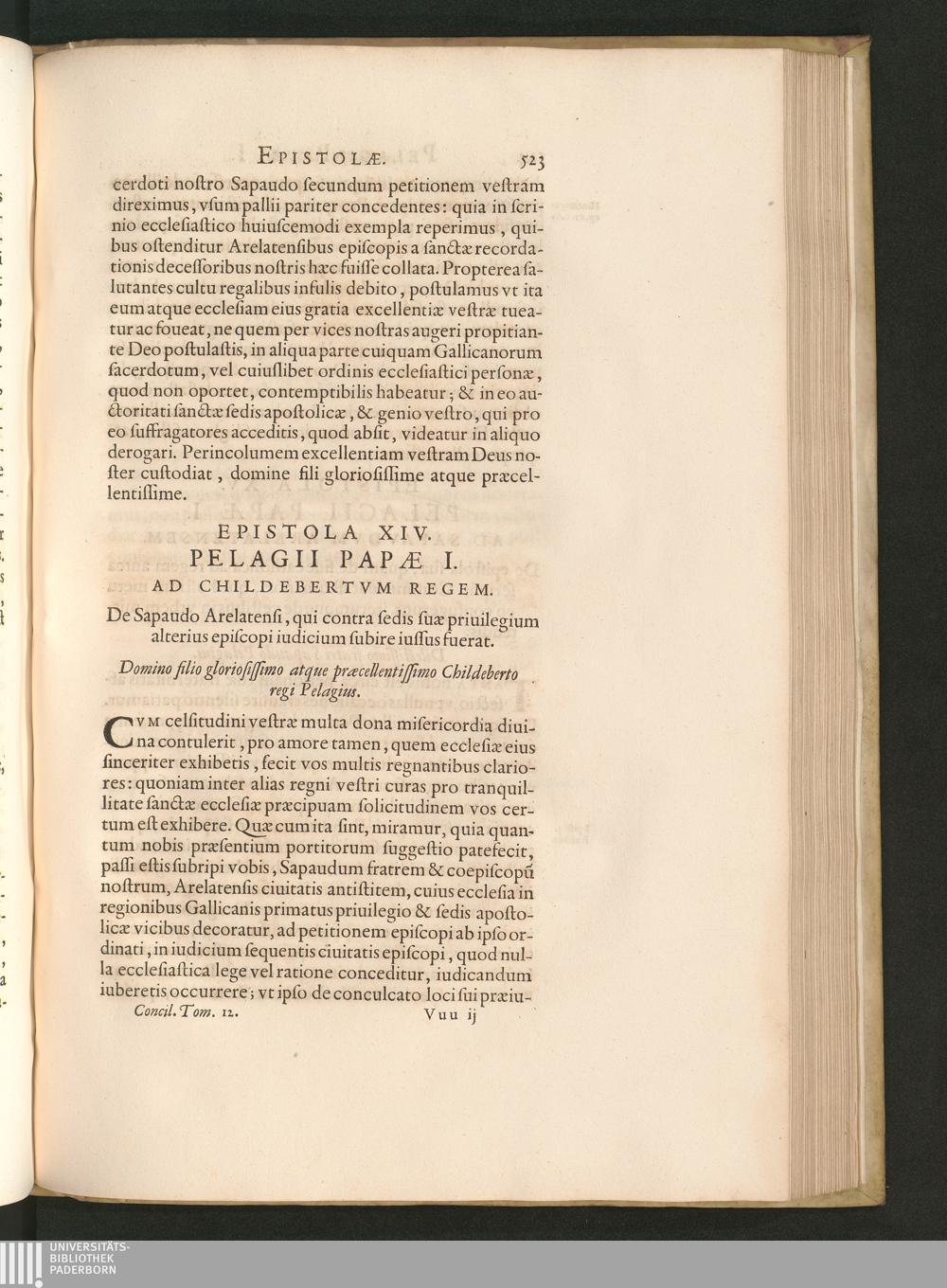 Epistola XIV. Pelagii Papae I. Ad Childebertvm Regem. De Sapaudo Arelatensi, qui[...]