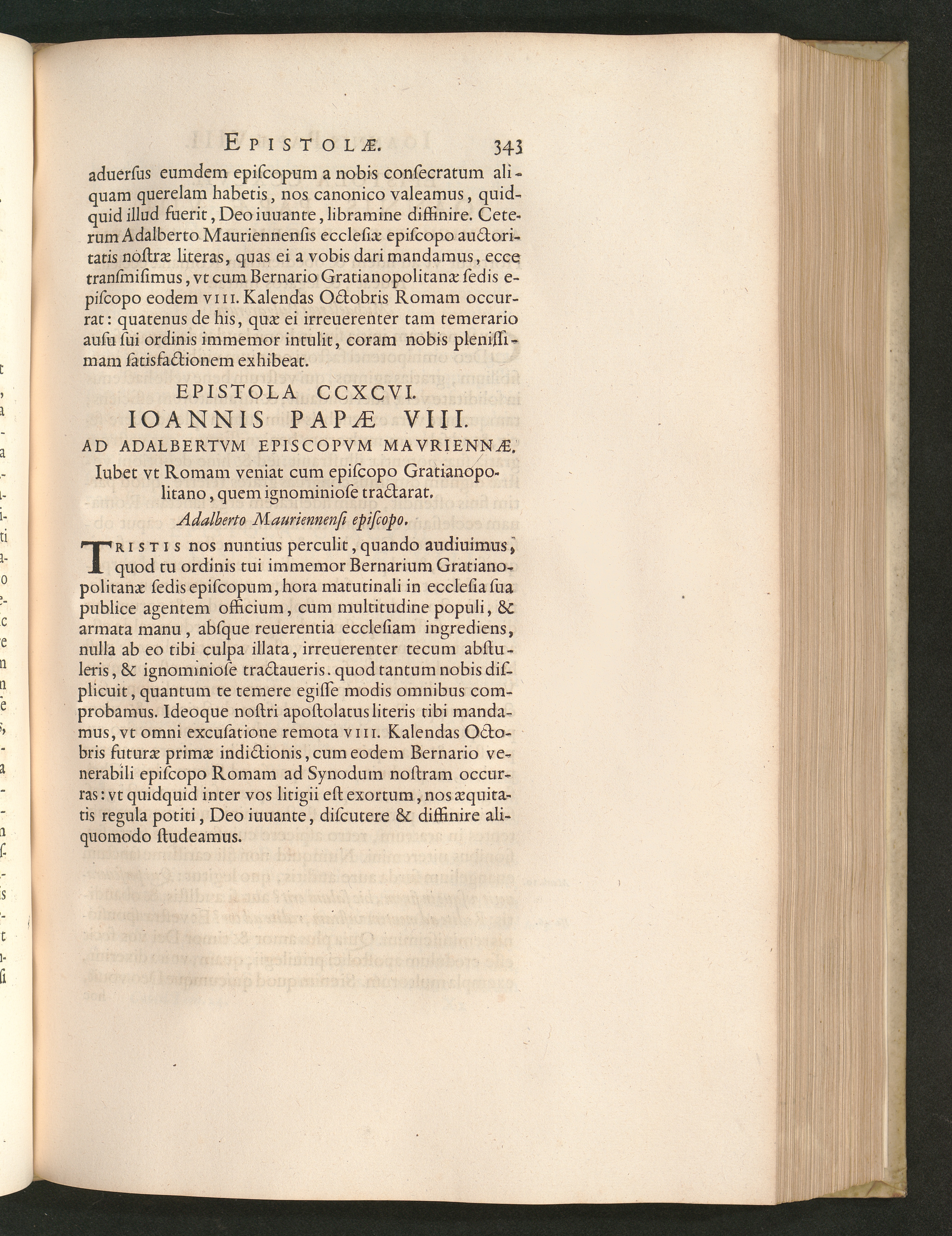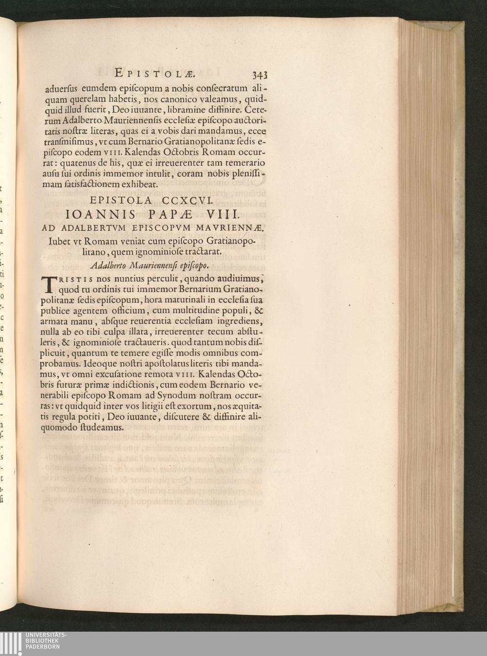 Epistola CCXCVI. Ioannis Papae VIII. Ad Adalbertvm Episcopvm Mavriennae. Iubet vt[...]