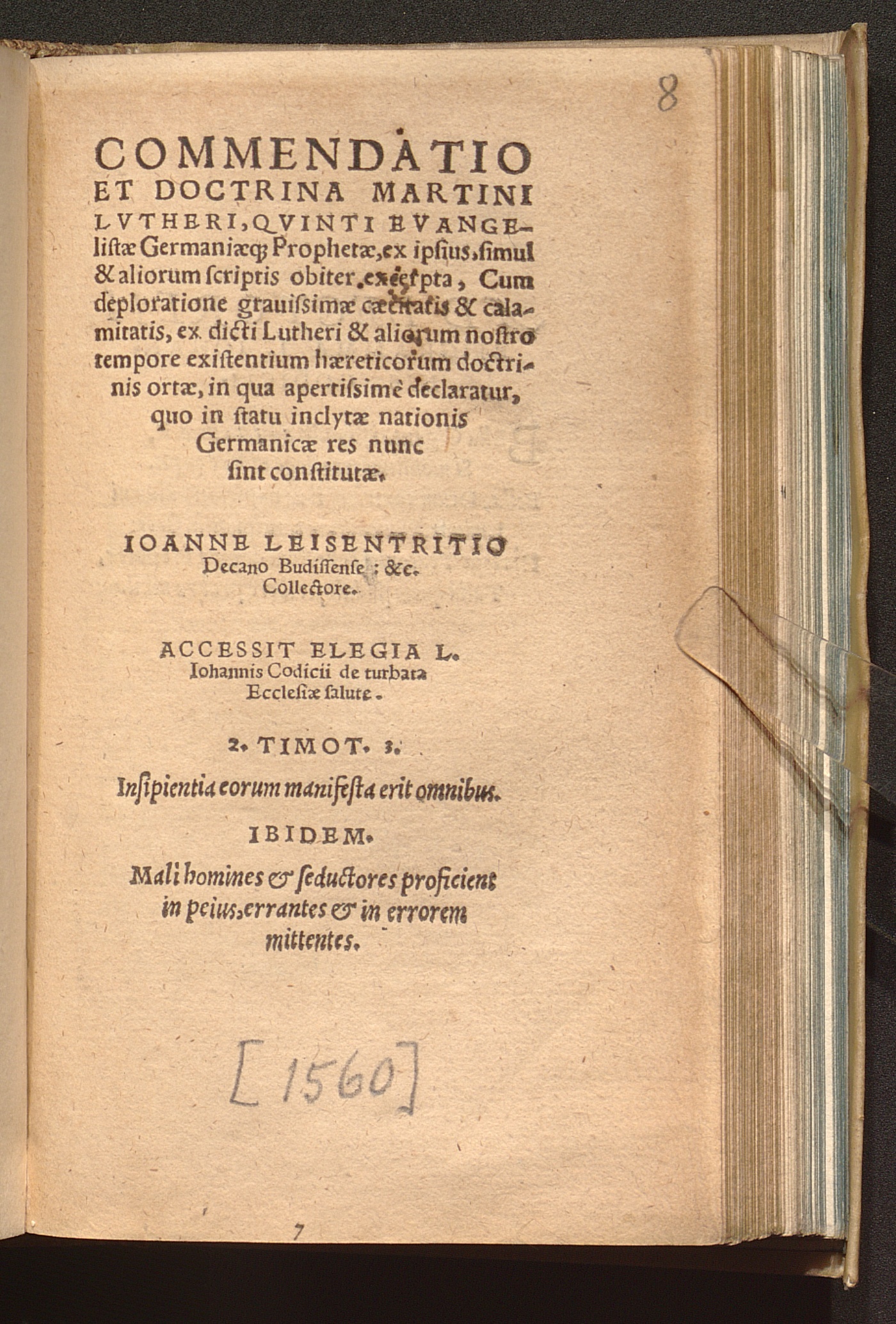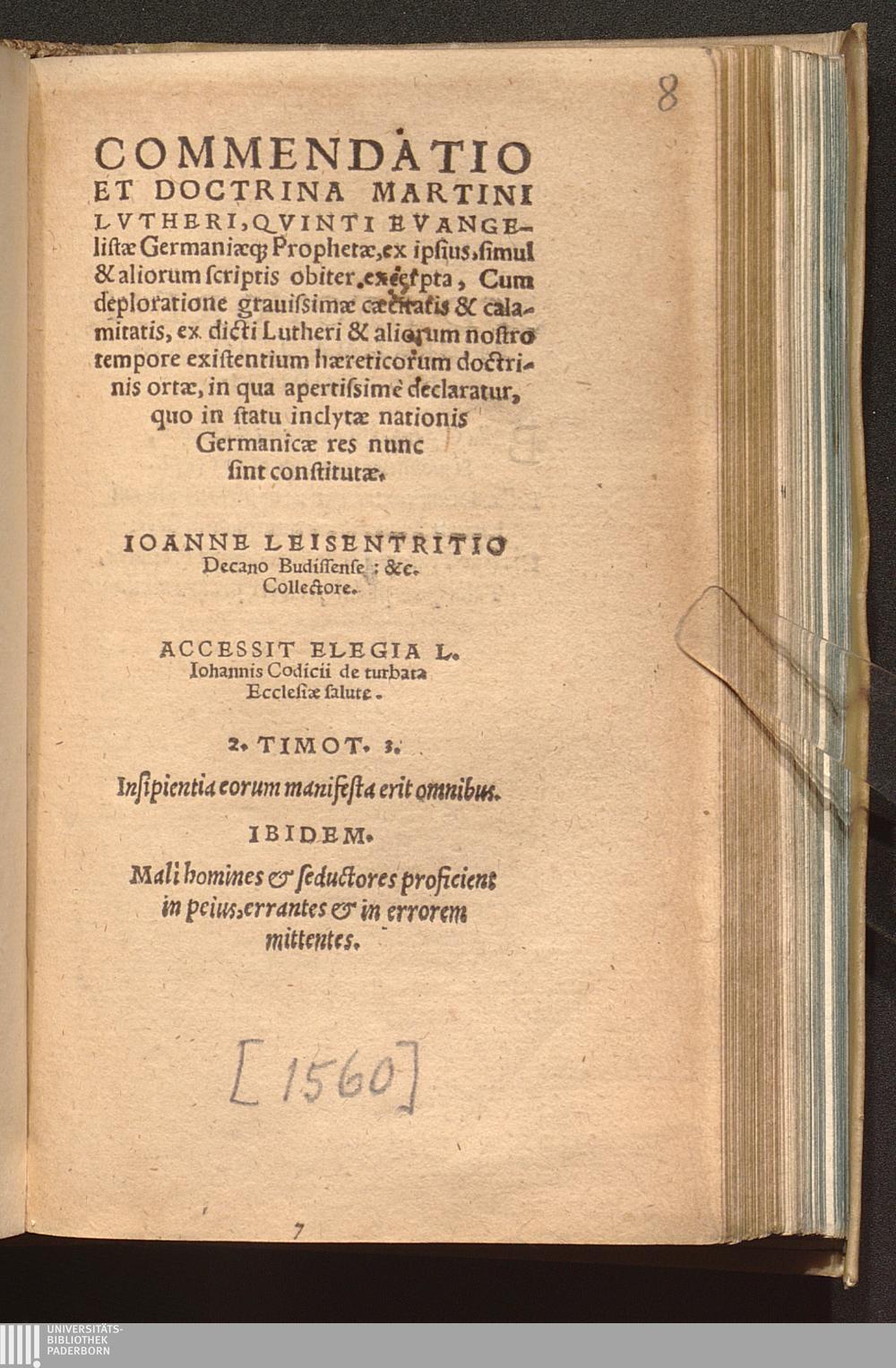 Commendatio Et Doctrina Martini Lvtheri, Qvinti Evangelistæ Germaniæq[ue] Prophetæ, ex ipsius, simul & aliorum scriptis obiter excerpta : Cum deploratione grauissimæ cæcitatis & calamitatis, ex dicti Lutheri & aliorum nostro tempore existentium hæreticorum doctrinis ortæ, in qua apertissimè declaratur, quo in statu inclytæ nationis Germanicæ res nunc sint constitutæ / Ioanne Leisentritio Decano Budissense: &c. Collectore