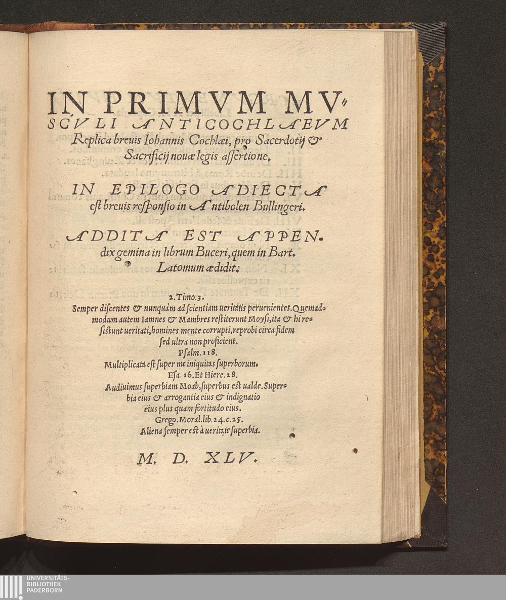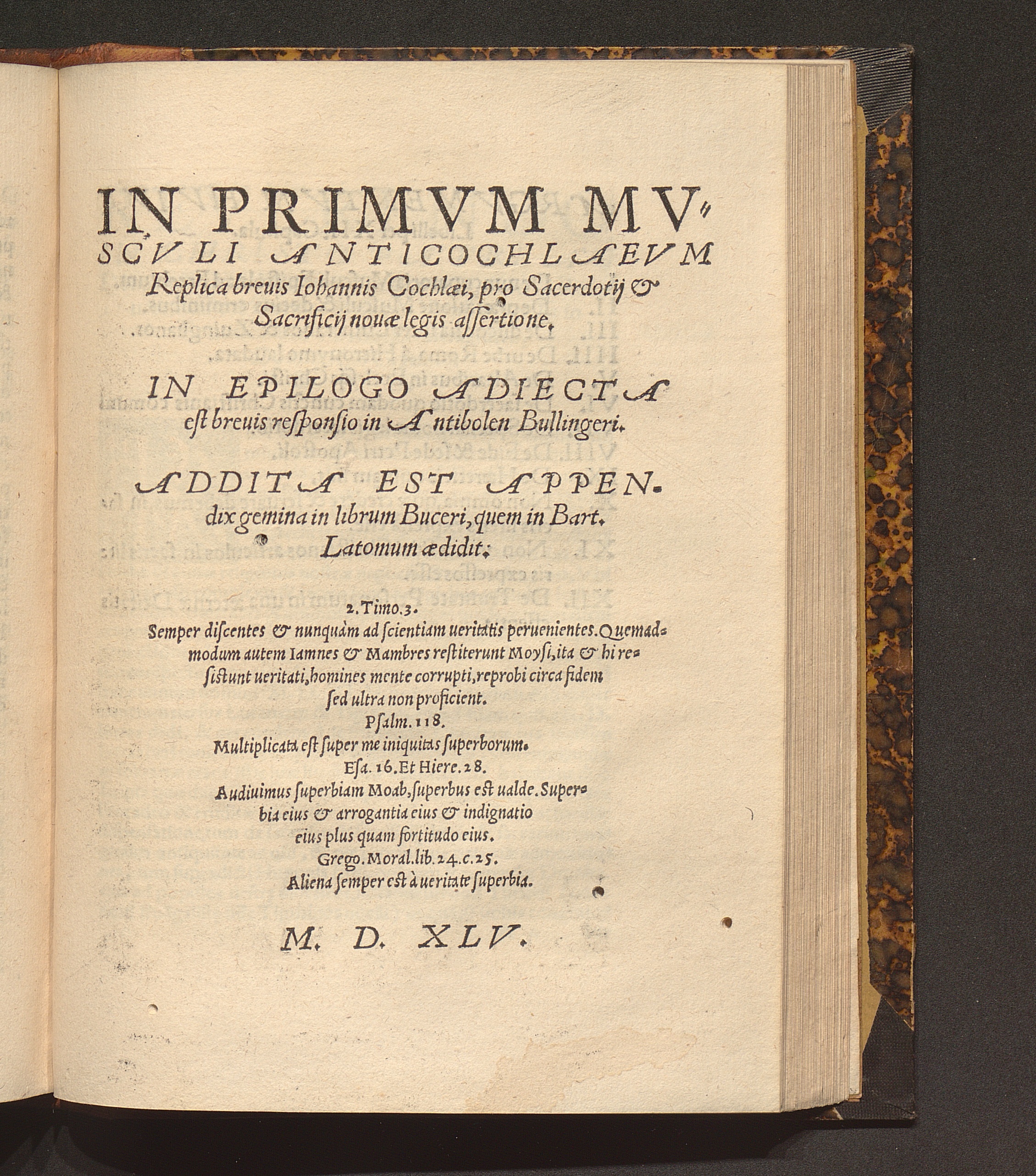 IN PRIMVM MV=||SCVLI ANTICOCHLAEVM || Replica breuis Iohannis Cochlæi, pro Sacerdotij & || Sacrificij nouæ legis assertione.|| IN EPILOGO ADIECTA || est breuis responsio in Antibolen Bullingeri.|| ADDITA EST APPEN=||dix gemina in librum Buceri, quem in Bart.|| Latomum ædidit.|| ... ||