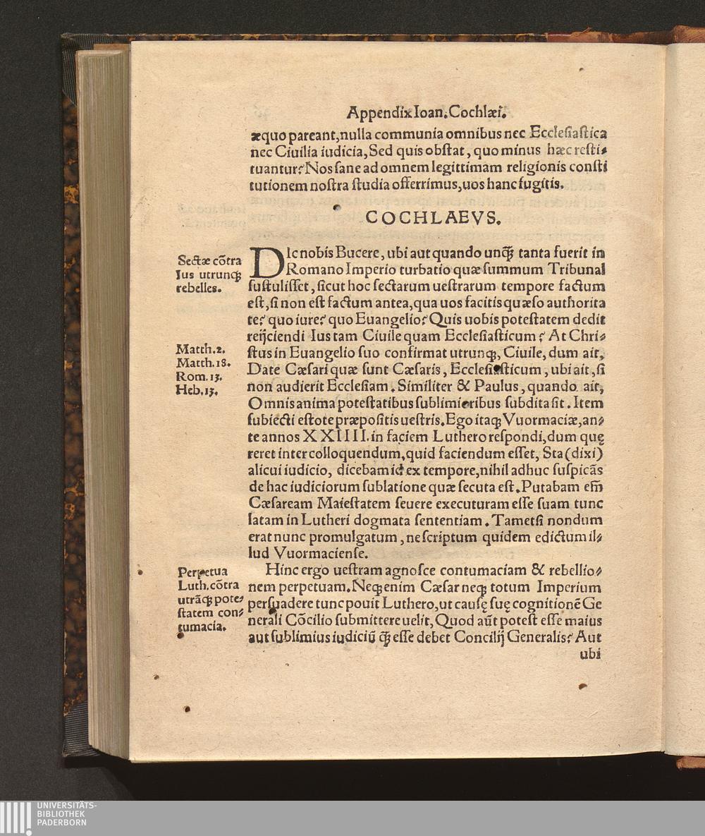 IN PRIMVM MV=||SCVLI ANTICOCHLAEVM || Replica breuis Iohannis Cochlæi, pro Sacerdotij & || Sacrificij nouæ legis assertione.|| IN EPILOGO ADIECTA || est breuis responsio in Antibolen Bullingeri.|| ADDITA EST APPEN=||dix gemina in librum Buceri, quem in Bart.|| Latomum ædidit.|| ... ||