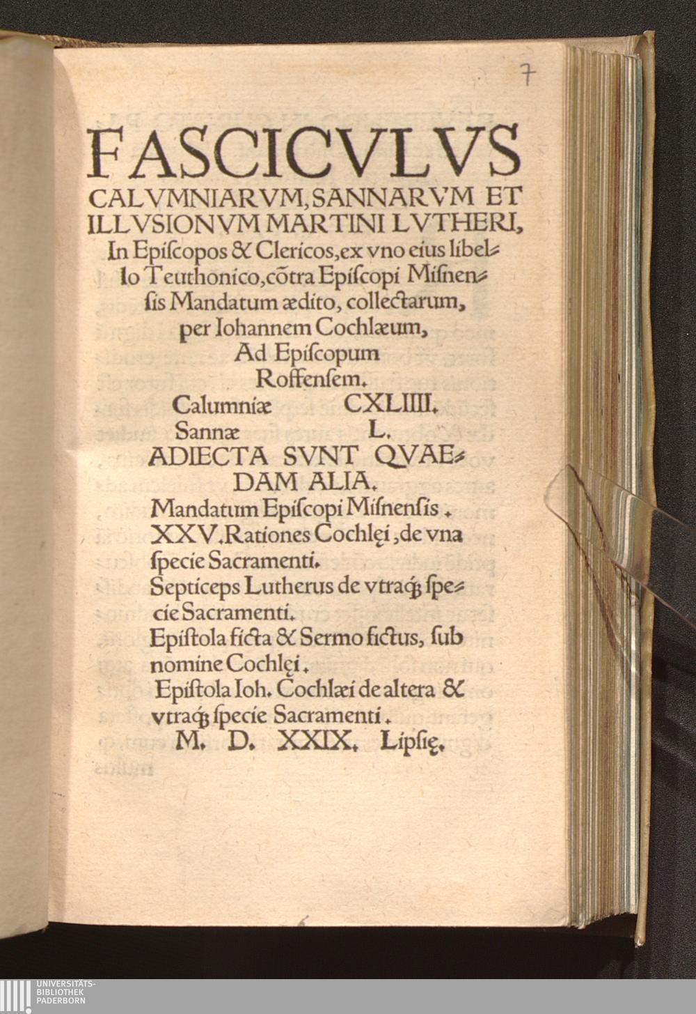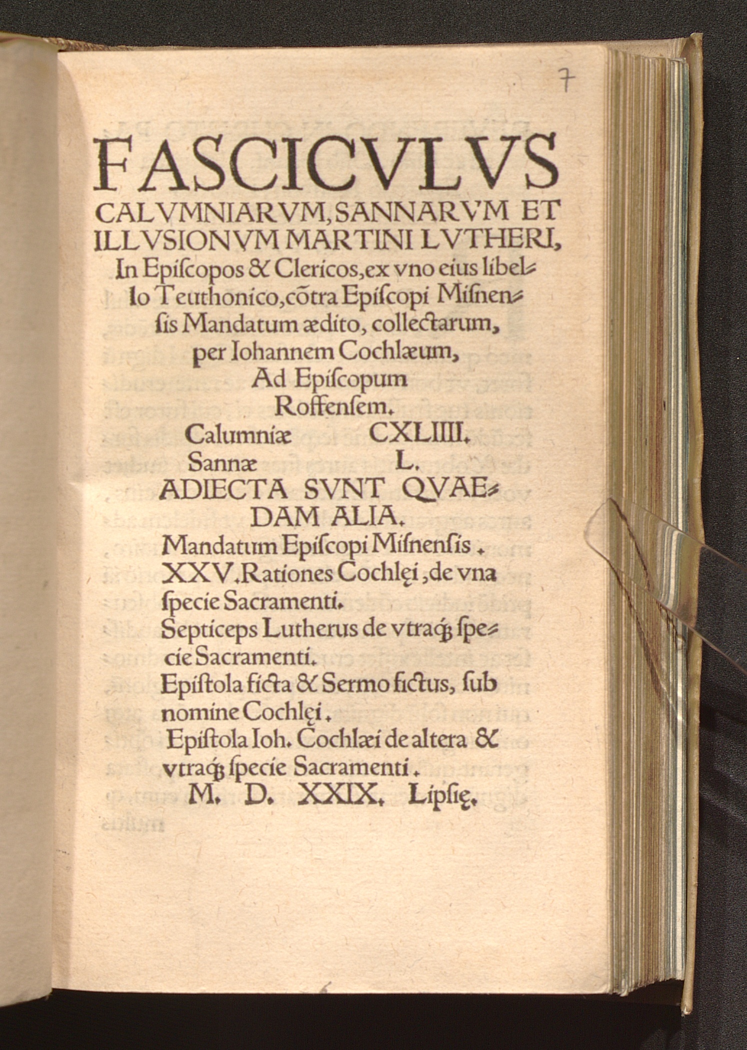 Fascicvlvs Calvmniarvm, Sannarvm Et Illvsionvm Martini Lvtheri, In Episcopos & Clericos, ex vno eius libello Teuthonico, co[n]tra Episcopi Misnensis Mandatum ædito / collectarum, per Iohannem Cochlæum, Ad Episcopum Roffensem