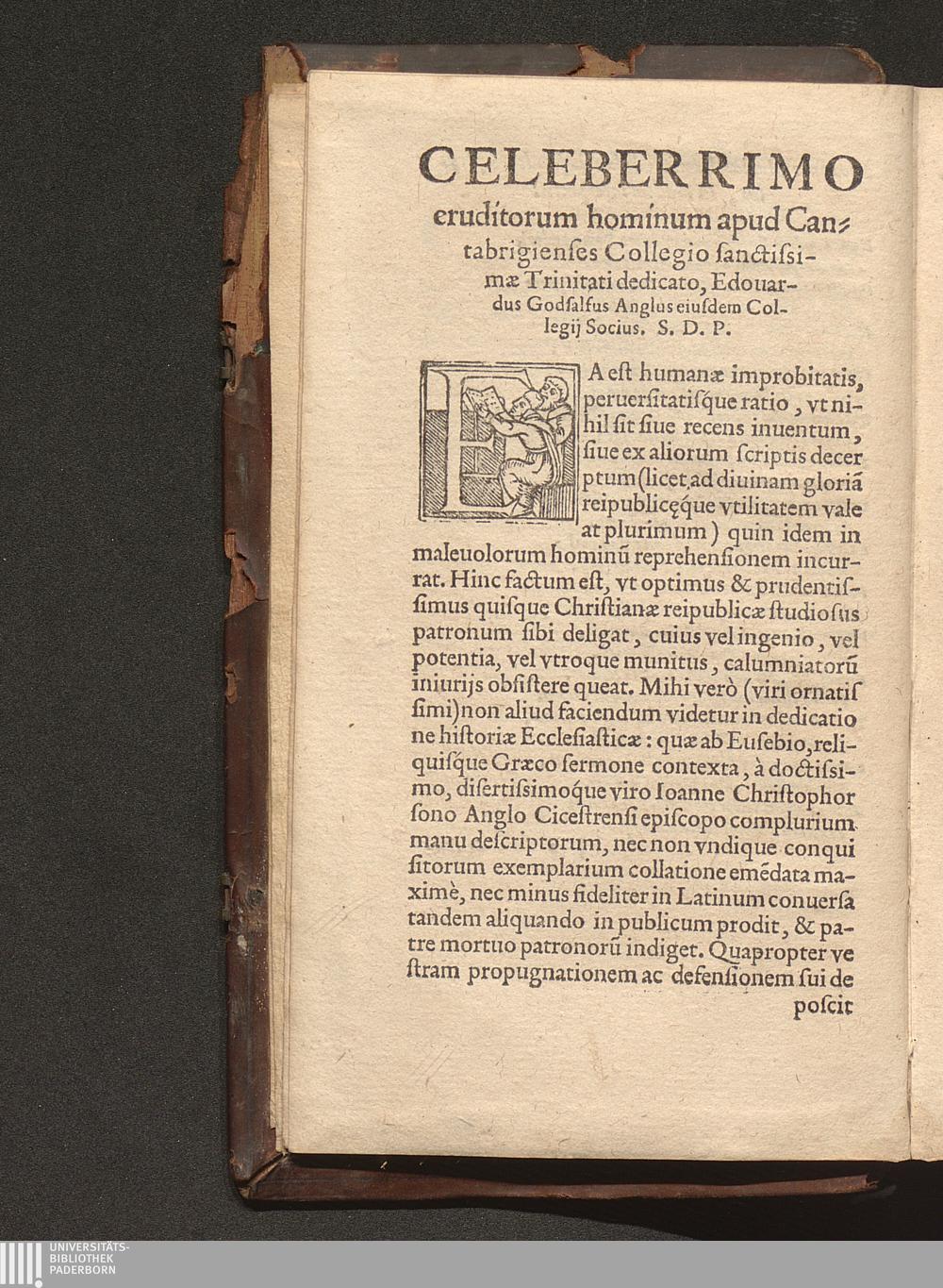 Prima (1569) HISTORIAE EC||CLESIASTICAE PARS || PRIMA, QVA CONTI-||NENTVR || Eusebij cognomento Pamphili Cæsareæ Palæ-||stinæ Episcopi lib. 10.|| Eiusdem de vita Constantini magni lib. 4.|| Oratio Constantini magni ad sanctoru[m] cœtu[m].|| Oratio eiusdem Eusebij in laudem Constanti-||ni magni ad trigesimum illius imperij an-||num, ... ||