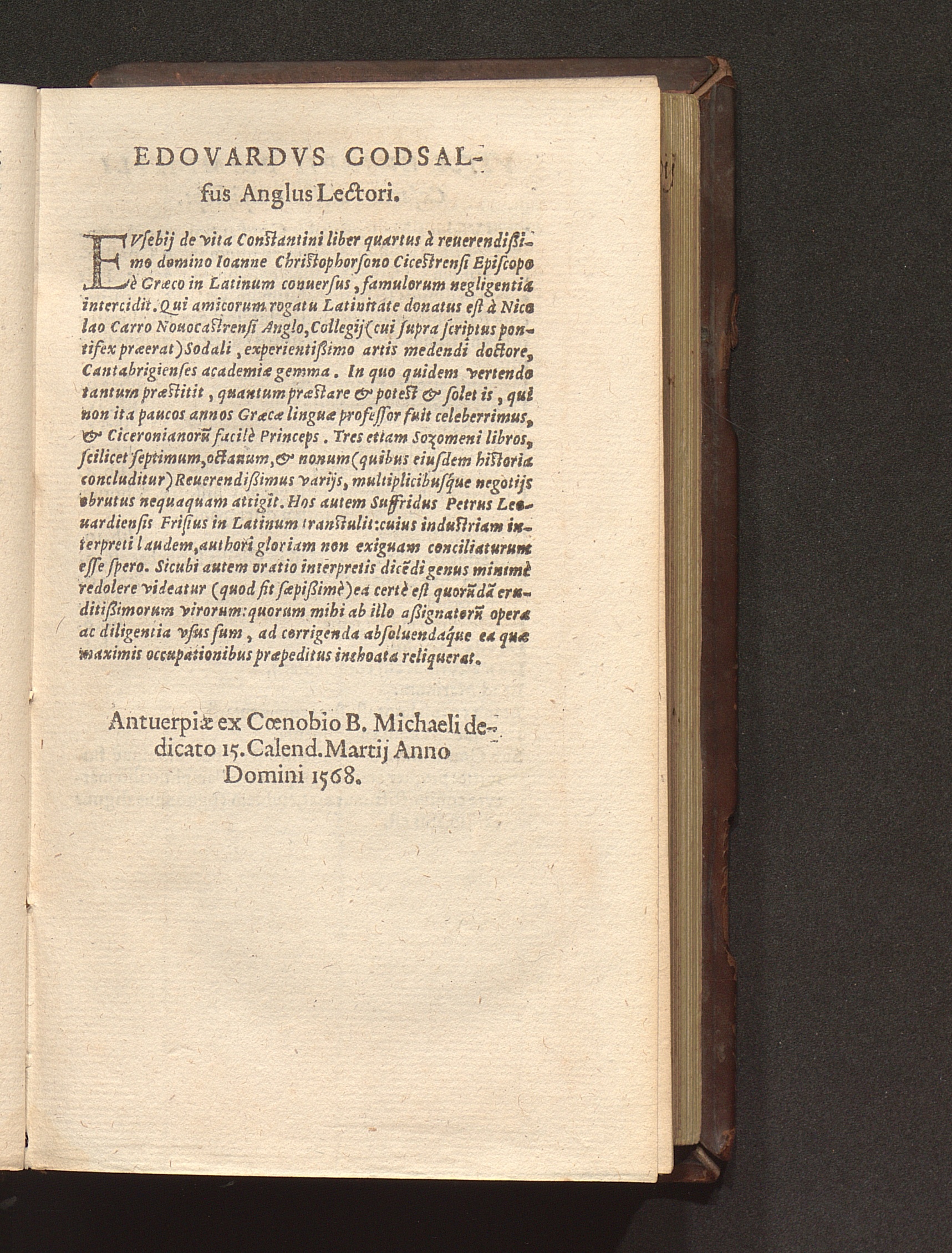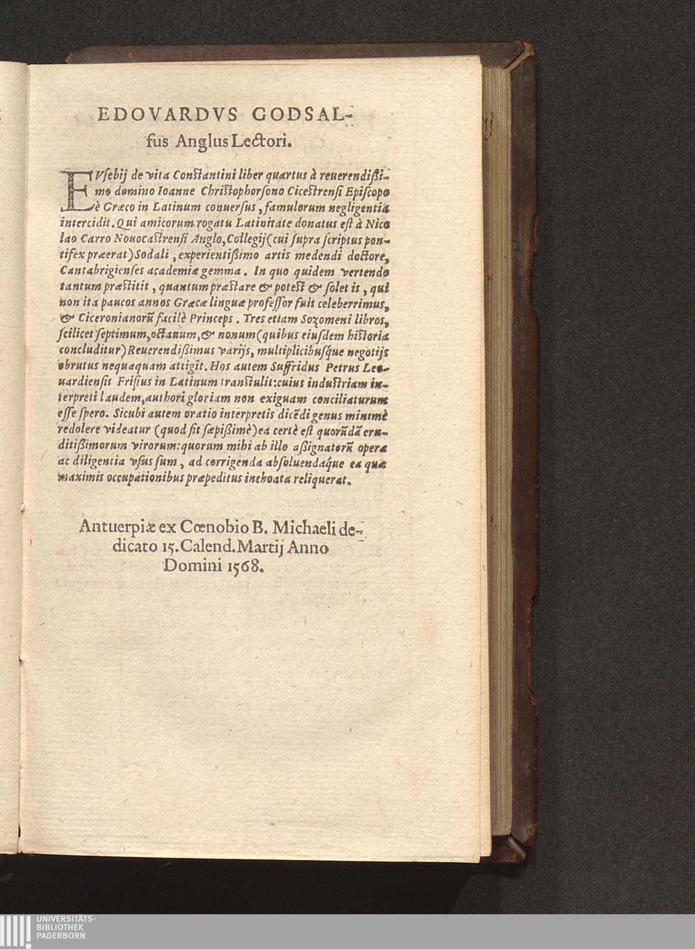 Prima (1569) HISTORIAE EC||CLESIASTICAE PARS || PRIMA, QVA CONTI-||NENTVR || Eusebij cognomento Pamphili Cæsareæ Palæ-||stinæ Episcopi lib. 10.|| Eiusdem de vita Constantini magni lib. 4.|| Oratio Constantini magni ad sanctoru[m] cœtu[m].|| Oratio eiusdem Eusebij in laudem Constanti-||ni magni ad trigesimum illius imperij an-||num, ... ||