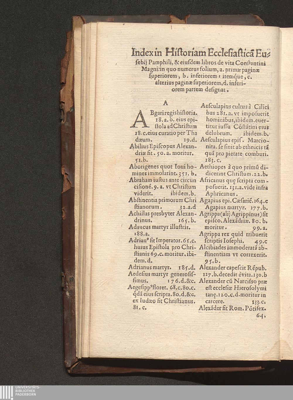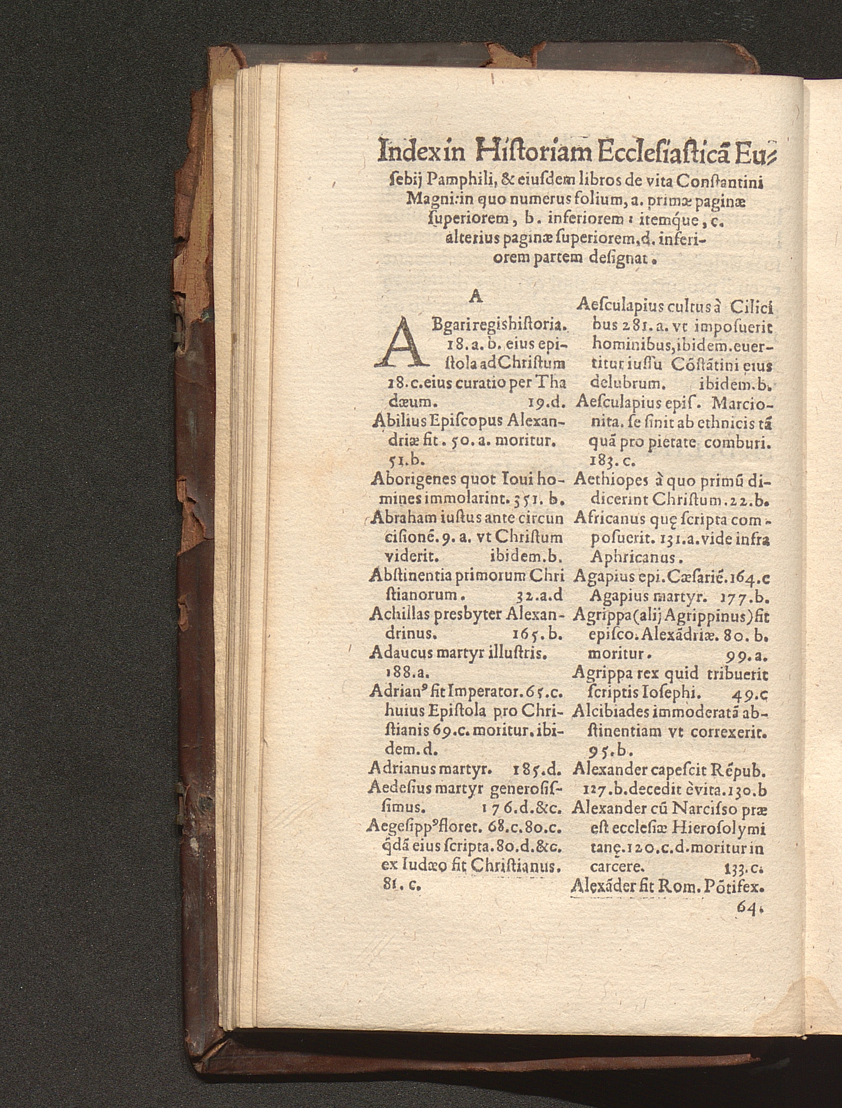 Prima (1569) HISTORIAE EC||CLESIASTICAE PARS || PRIMA, QVA CONTI-||NENTVR || Eusebij cognomento Pamphili Cæsareæ Palæ-||stinæ Episcopi lib. 10.|| Eiusdem de vita Constantini magni lib. 4.|| Oratio Constantini magni ad sanctoru[m] cœtu[m].|| Oratio eiusdem Eusebij in laudem Constanti-||ni magni ad trigesimum illius imperij an-||num, ... ||