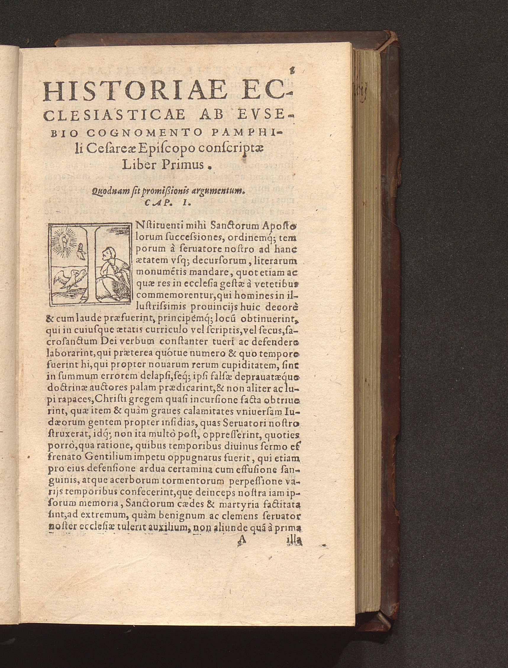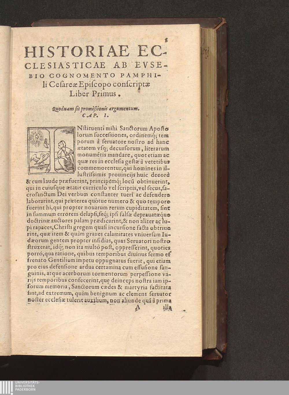 Prima (1569) HISTORIAE EC||CLESIASTICAE PARS || PRIMA, QVA CONTI-||NENTVR || Eusebij cognomento Pamphili Cæsareæ Palæ-||stinæ Episcopi lib. 10.|| Eiusdem de vita Constantini magni lib. 4.|| Oratio Constantini magni ad sanctoru[m] cœtu[m].|| Oratio eiusdem Eusebij in laudem Constanti-||ni magni ad trigesimum illius imperij an-||num, ... ||