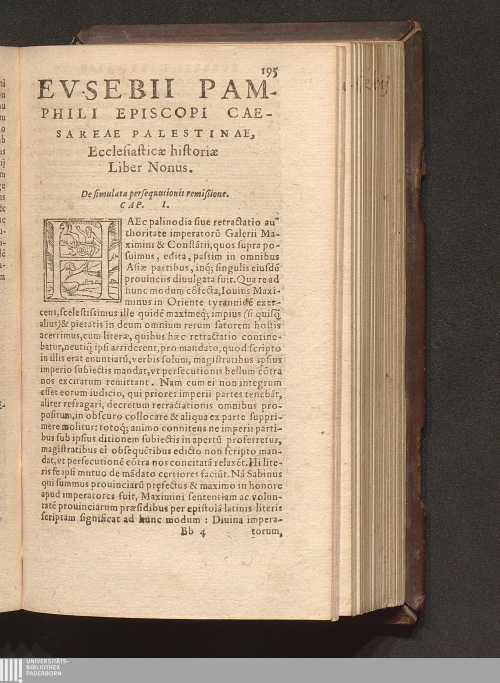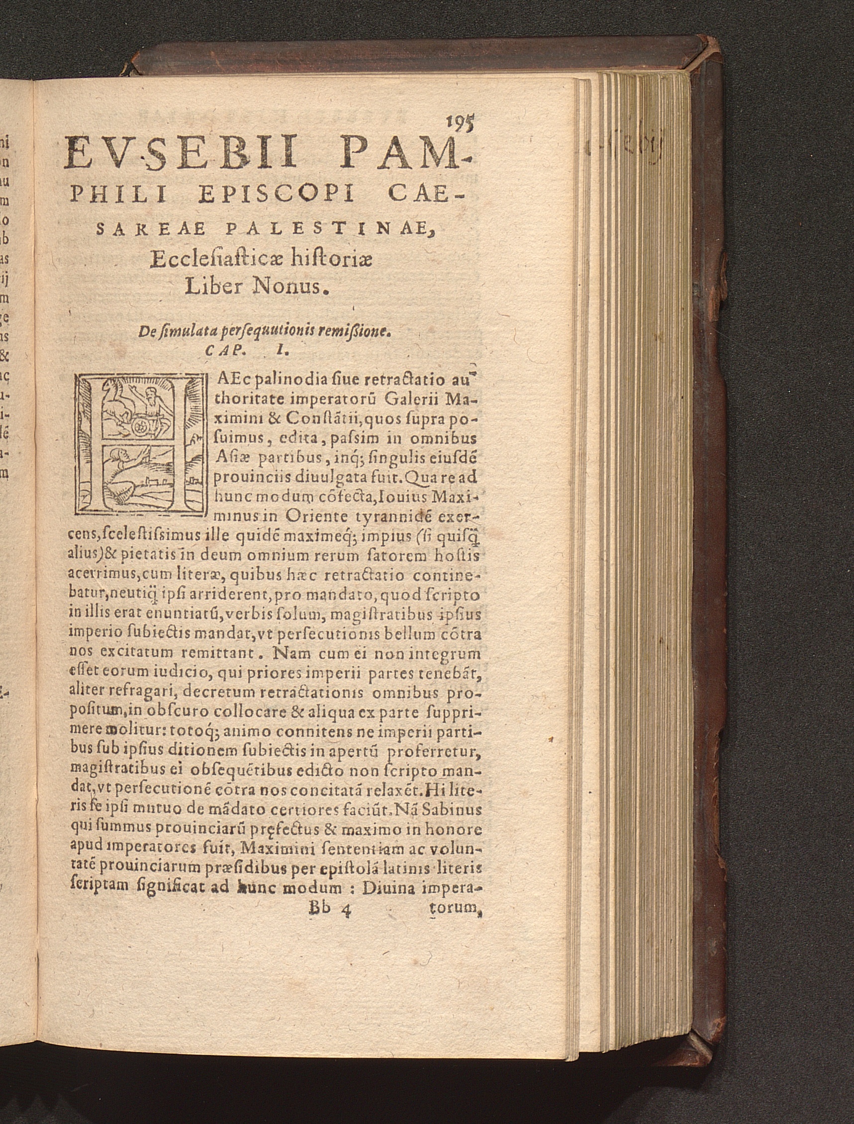 Prima (1569) HISTORIAE EC||CLESIASTICAE PARS || PRIMA, QVA CONTI-||NENTVR || Eusebij cognomento Pamphili Cæsareæ Palæ-||stinæ Episcopi lib. 10.|| Eiusdem de vita Constantini magni lib. 4.|| Oratio Constantini magni ad sanctoru[m] cœtu[m].|| Oratio eiusdem Eusebij in laudem Constanti-||ni magni ad trigesimum illius imperij an-||num, ... ||