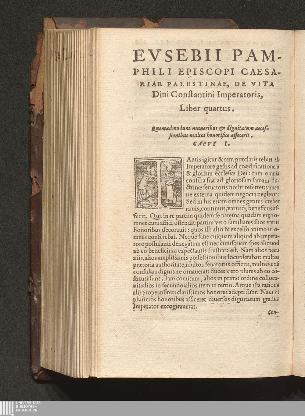 Prima (1569) HISTORIAE EC||CLESIASTICAE PARS || PRIMA, QVA CONTI-||NENTVR || Eusebij cognomento Pamphili Cæsareæ Palæ-||stinæ Episcopi lib. 10.|| Eiusdem de vita Constantini magni lib. 4.|| Oratio Constantini magni ad sanctoru[m] cœtu[m].|| Oratio eiusdem Eusebij in laudem Constanti-||ni magni ad trigesimum illius imperij an-||num, ... ||