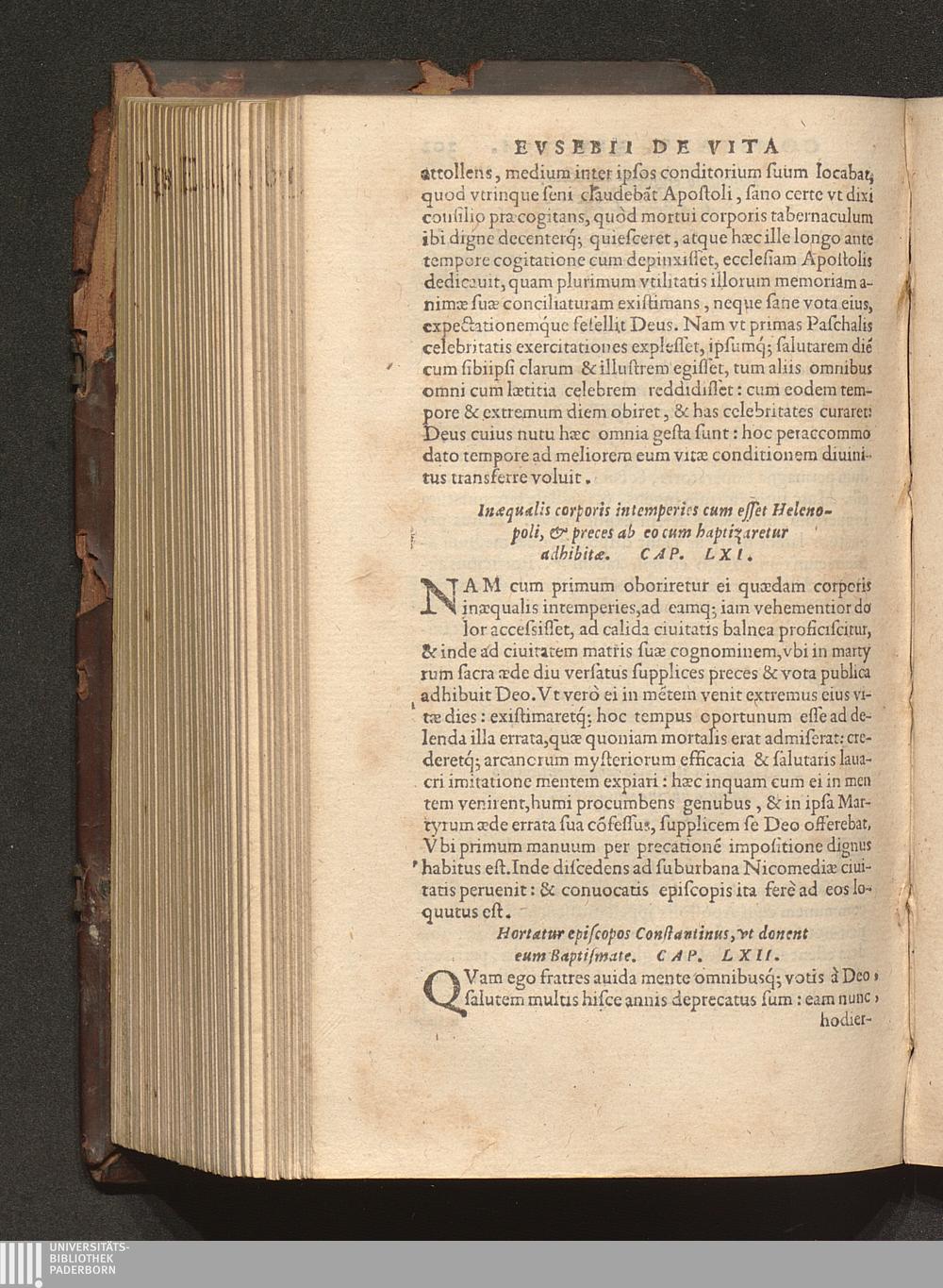 Prima (1569) HISTORIAE EC||CLESIASTICAE PARS || PRIMA, QVA CONTI-||NENTVR || Eusebij cognomento Pamphili Cæsareæ Palæ-||stinæ Episcopi lib. 10.|| Eiusdem de vita Constantini magni lib. 4.|| Oratio Constantini magni ad sanctoru[m] cœtu[m].|| Oratio eiusdem Eusebij in laudem Constanti-||ni magni ad trigesimum illius imperij an-||num, ... ||