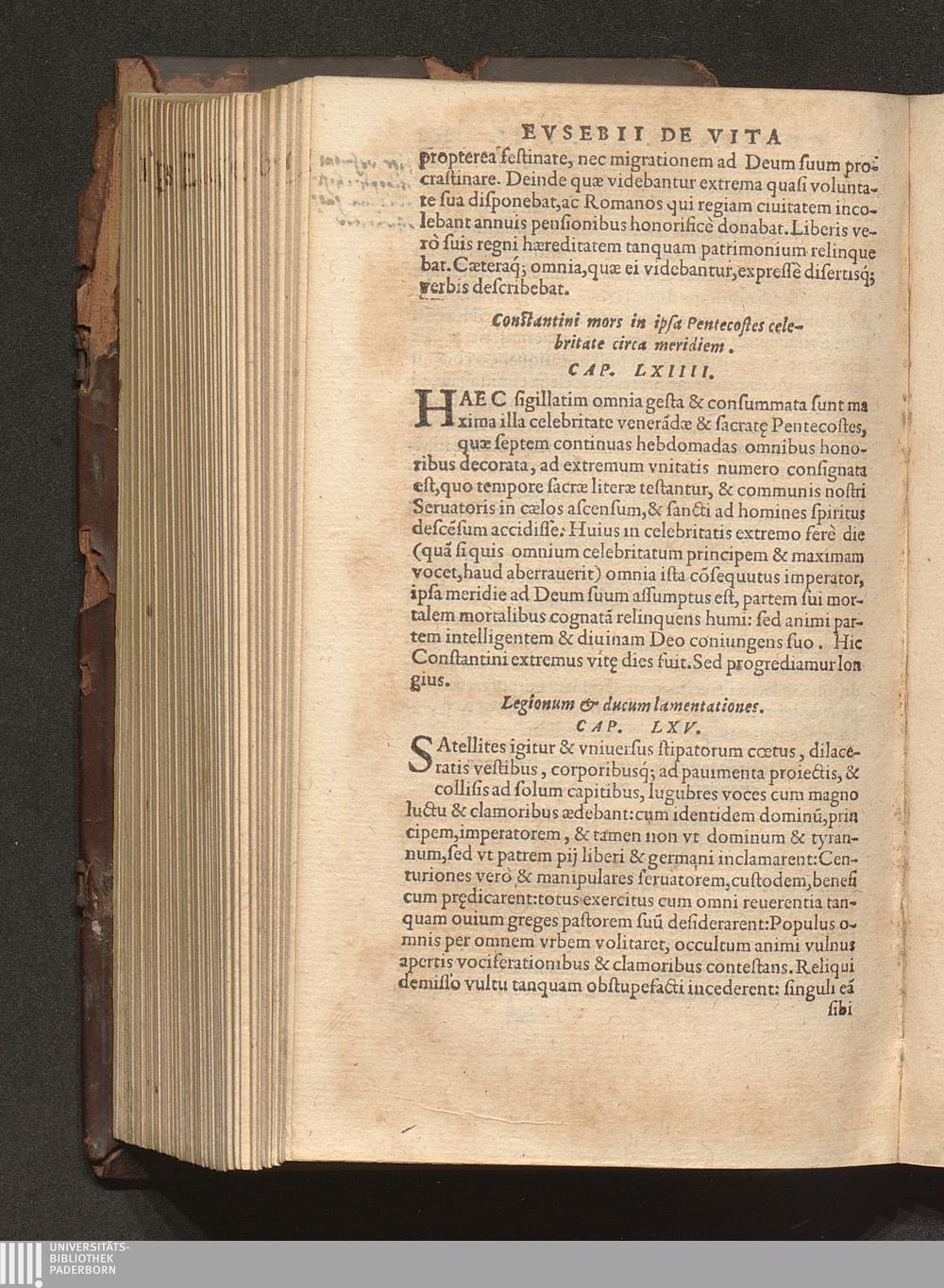 Prima (1569) HISTORIAE EC||CLESIASTICAE PARS || PRIMA, QVA CONTI-||NENTVR || Eusebij cognomento Pamphili Cæsareæ Palæ-||stinæ Episcopi lib. 10.|| Eiusdem de vita Constantini magni lib. 4.|| Oratio Constantini magni ad sanctoru[m] cœtu[m].|| Oratio eiusdem Eusebij in laudem Constanti-||ni magni ad trigesimum illius imperij an-||num, ... ||