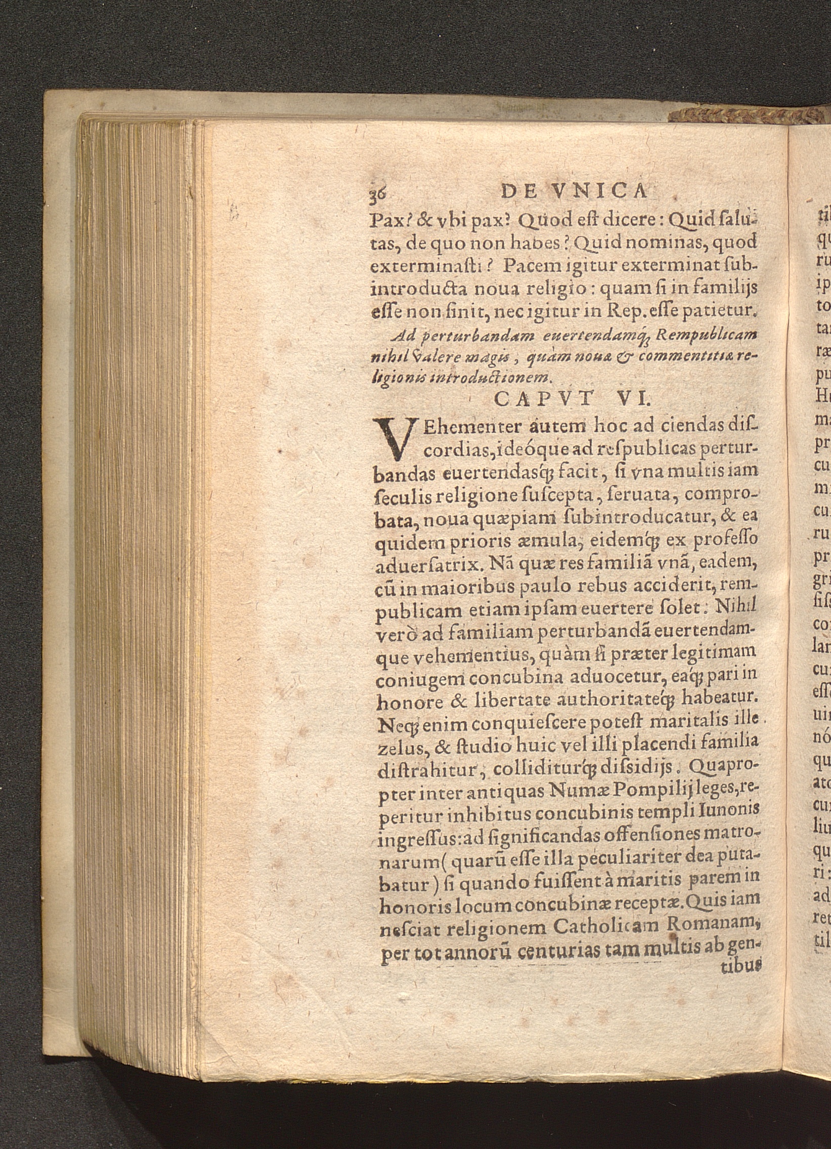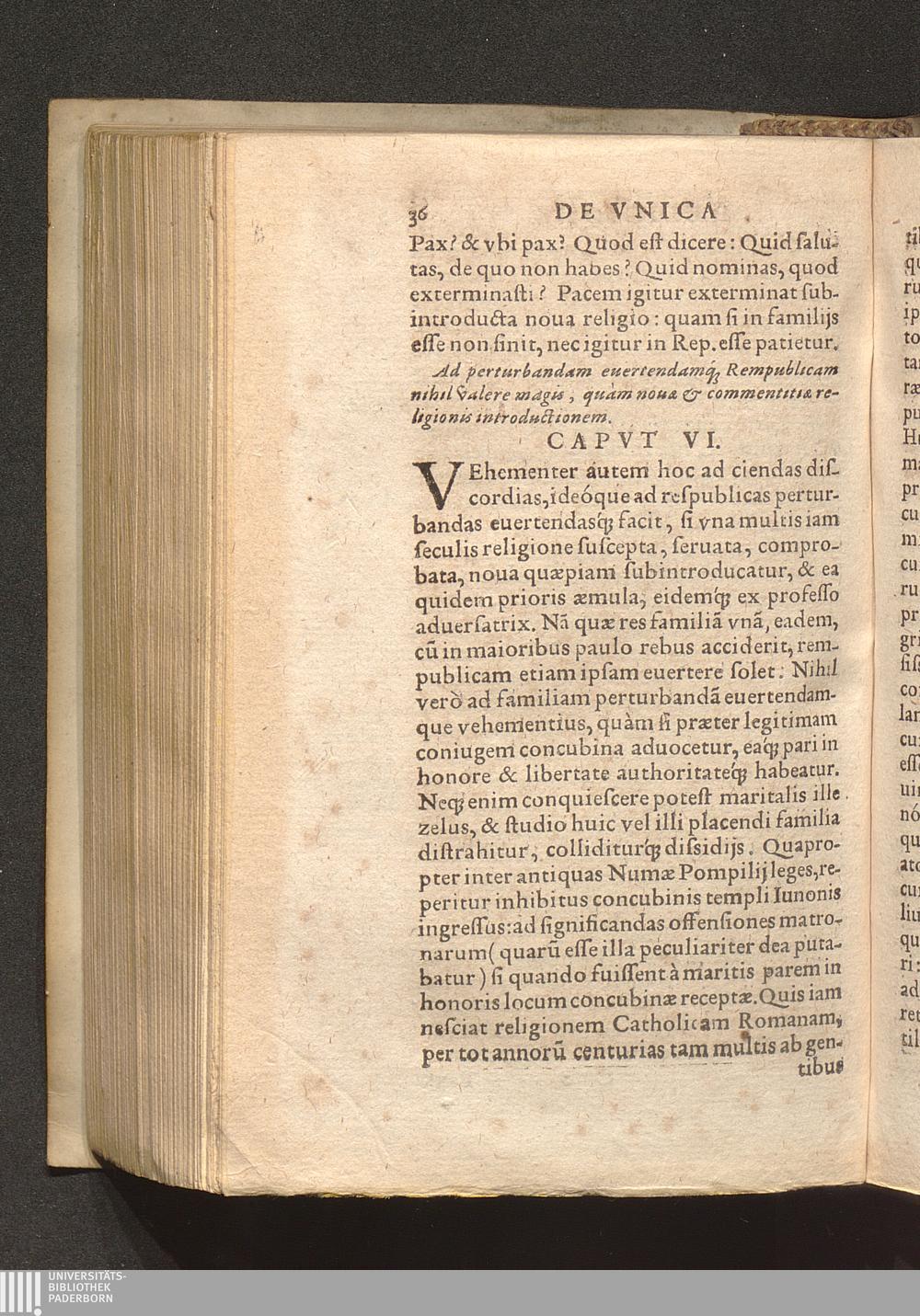 In vnica religione Catholica concordiae pacisq[ue] publicae vinculum praecipuè consistere, eoque soluto grauißimè perturbari. Cap. IIII.