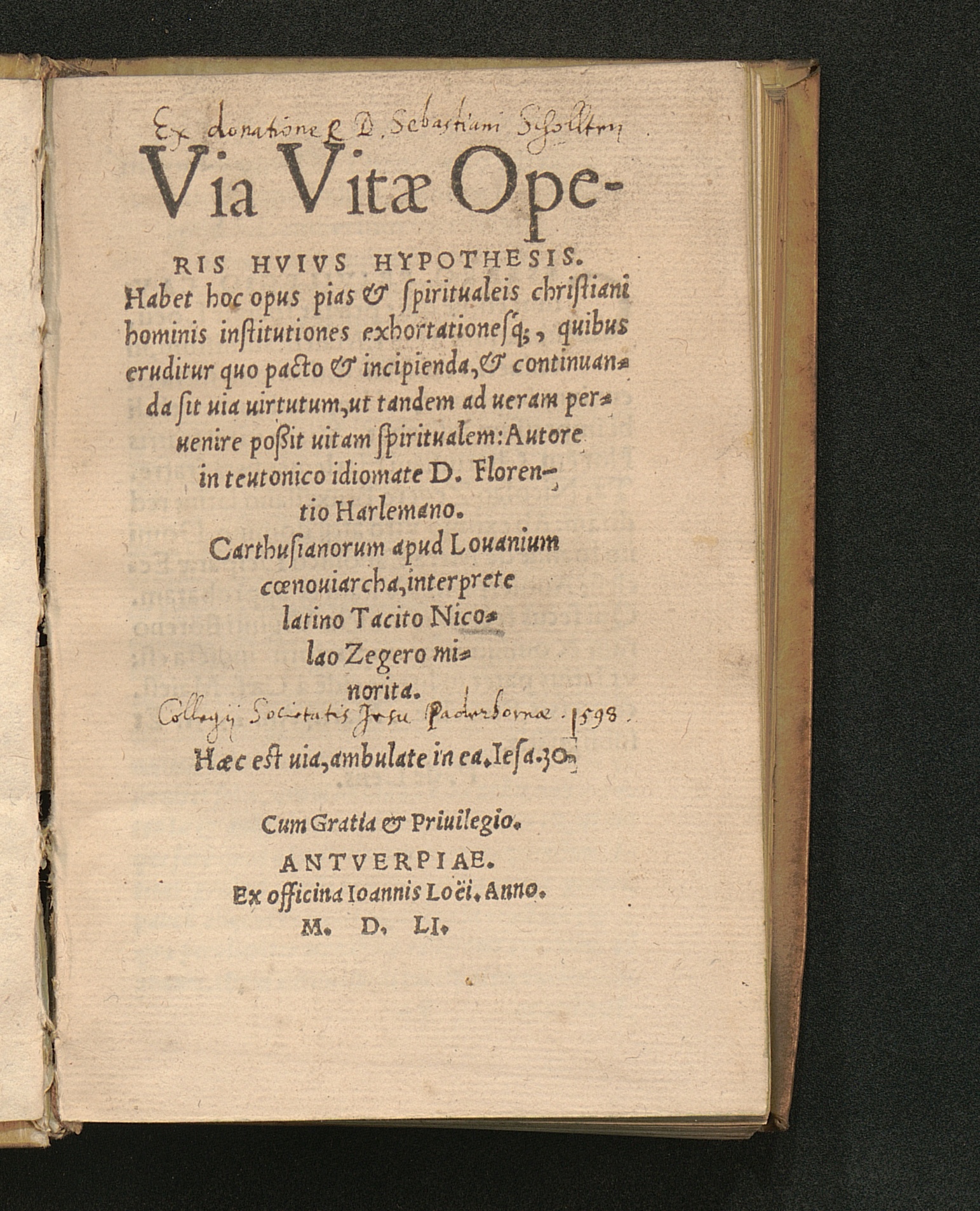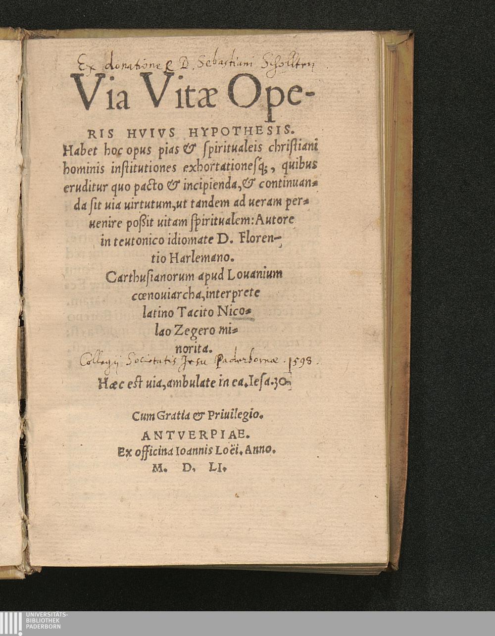 Via Vitæ Operis Hvivs Hypothesis : Habet hoc opus pias & spiritualeis christiani hominis institutiones exhortationesq[ue], quibus eruditur quo pacto & incipienda, & continuanda sit uia uirtutum, ut tandem ad ueram peruenire poßit uitam spiritualem / Autore in teutonico idiomate D. Florentio Harlemano. ... interprete latino Tacito Nicolao Zegero minorita