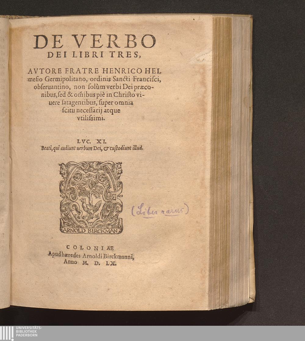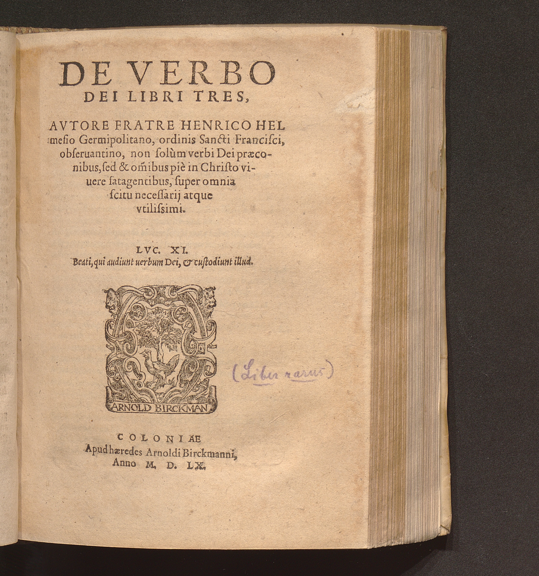 De Verbo Dei Libri Tres / Avtore Fratre Henrico Helmesio Germipolitano, ordinis Sancti Francisci, obseruantino, non solùm verbi Dei præconibus, sed & om[n]ibus piè in Christo viuere satagentibus, super omnia scitu necessarij atque vtilissimi