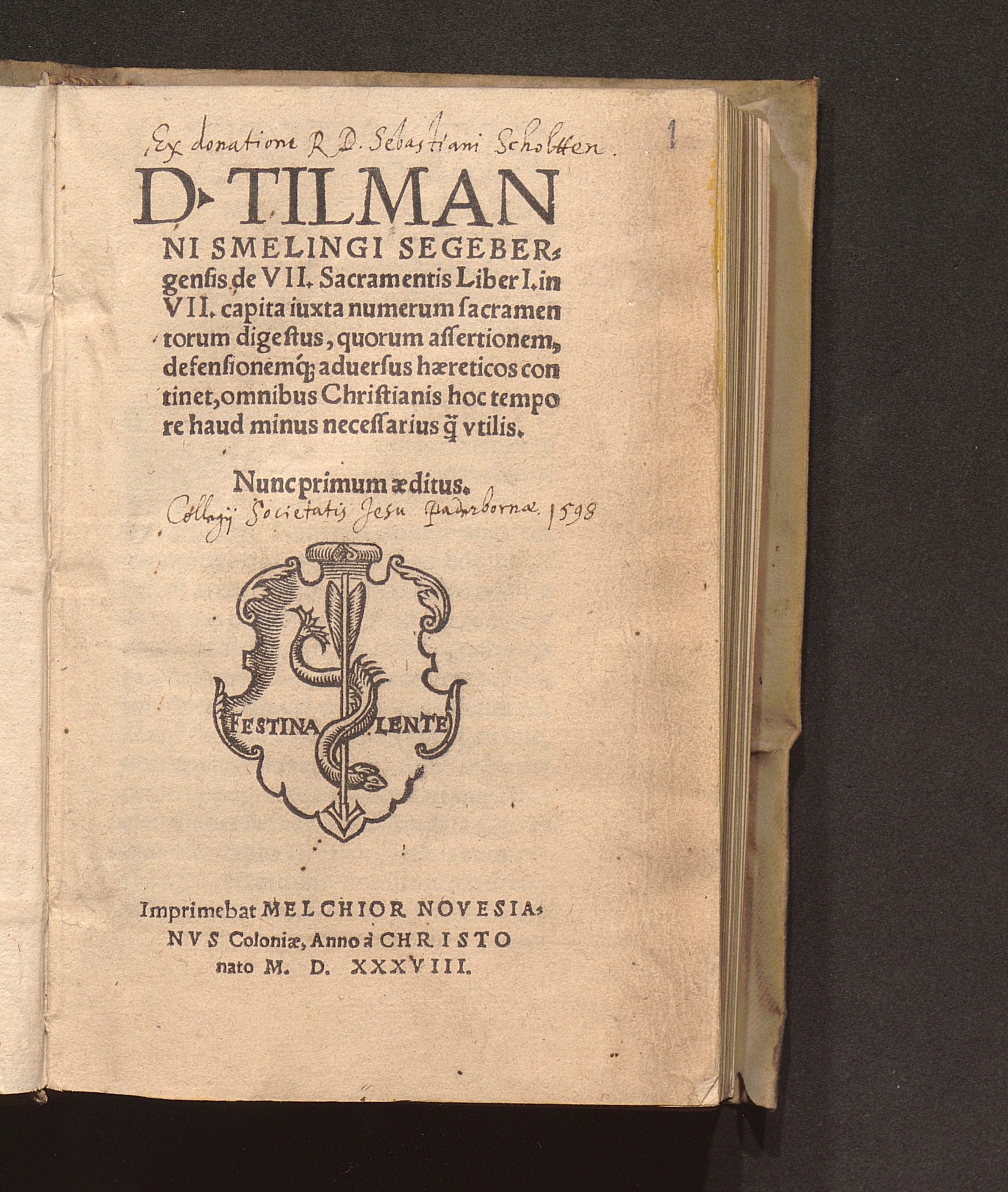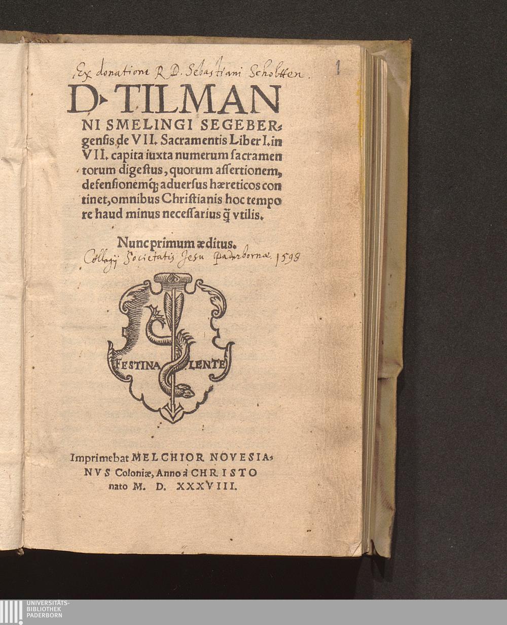 D. Tilman||ni Smelingi Segeber=||gensis de VII. Sacramentis Liber I. in || VII. capita iuxta numerum sacramen||torum digestus, quorum assertionem,|| defensionemq[ue] aduersus hæreticos con||tinet, omnibus Christianis hoc tempo||re haud minus necessarius q[uam] vtilis.||