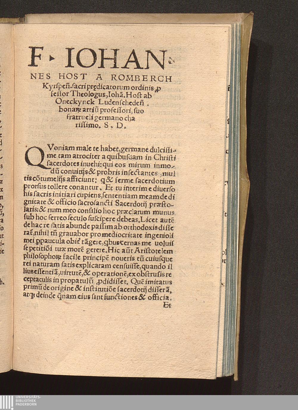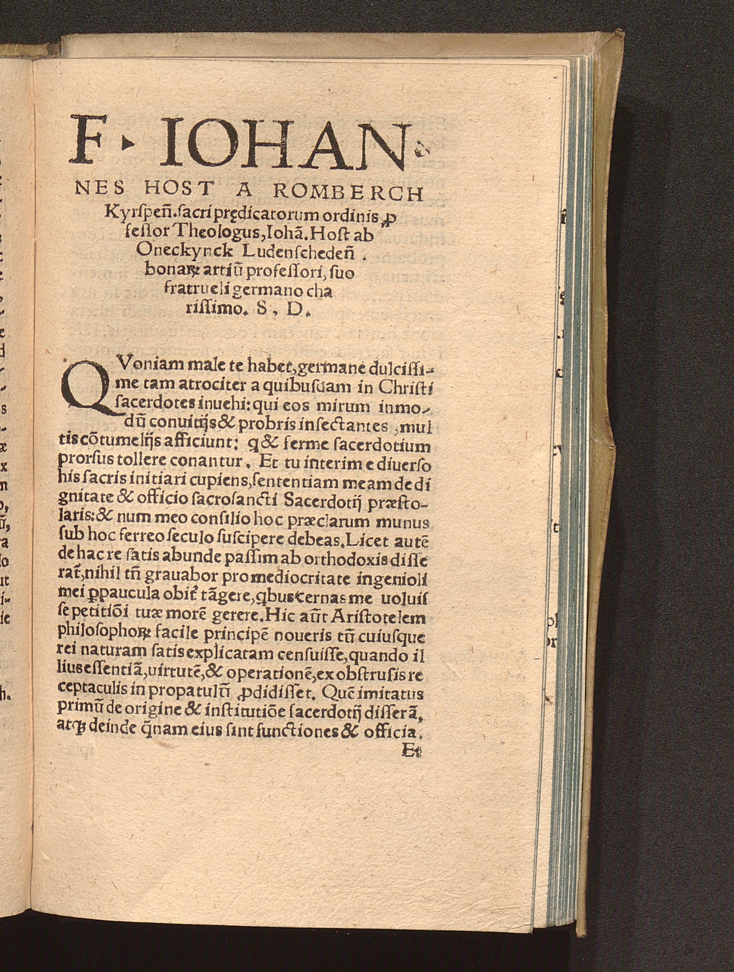 F. Iohannes Host A Romberch Kyrspen[sis] sacri pr[a]edicatorum ordinis p[ro]fessor Theologus, Ioha[nnes] Host ab Oneckynck Ludenscheden[sis] bona[rum] artiu[m] professori, suo fratrueli germano charissimo. S. D.