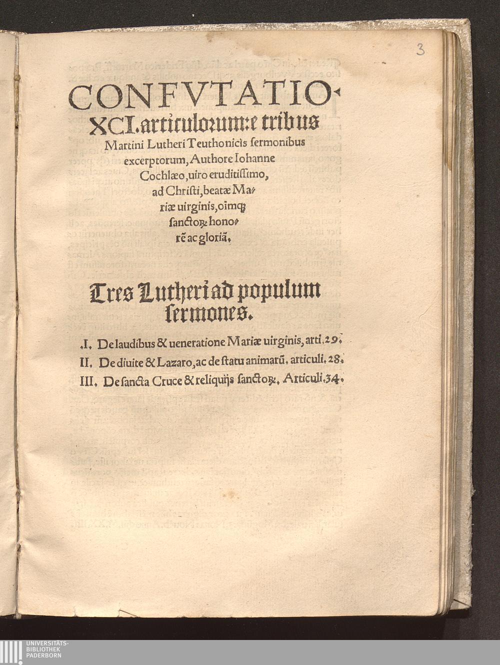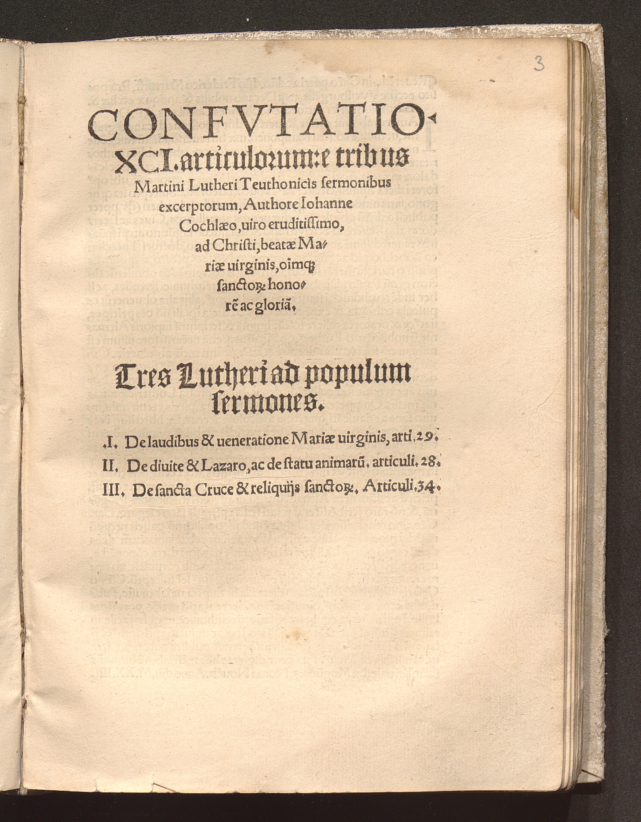 Confvtatio. XCI. articulorum: e tribus Martini Lutheri Teuthonicis sermonibus excerptorum / Authore Iohanne Cochlæo, uiro eruditissimo, ad Christi, beatæ Mariæ uirginis, o[mn]i[u]mq[ue] sanctor[um] honore[m] ac gloria[m]