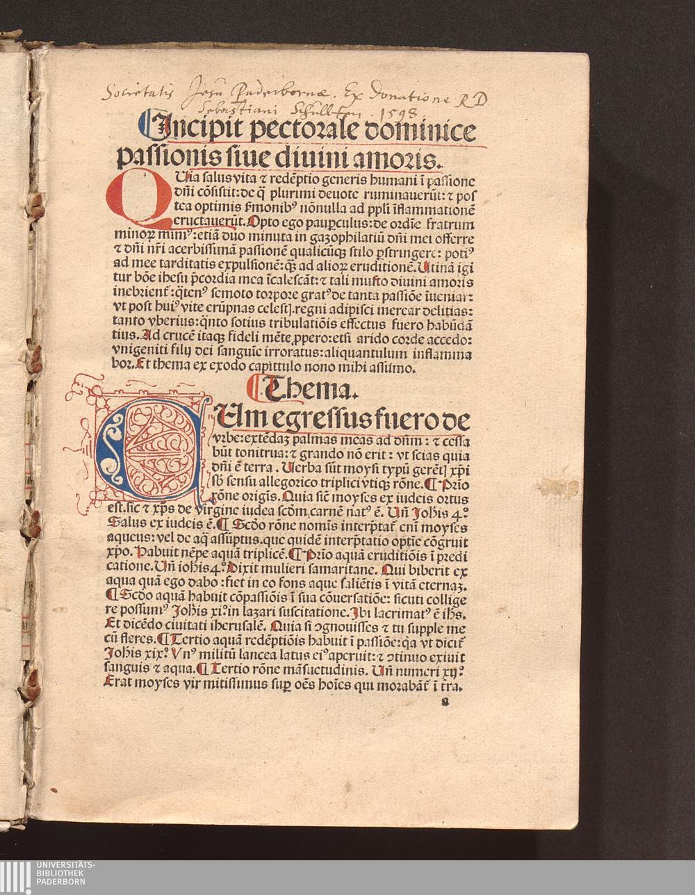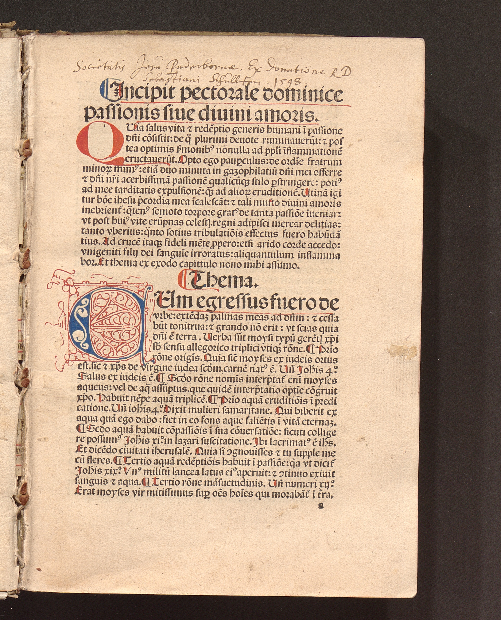 Jncipit pectorale dominice passionis siue diuini amoris. Quia salus vita [et] rede[m]ptio generis humani i[n] passione d[omi]ni co[n]sistit ...