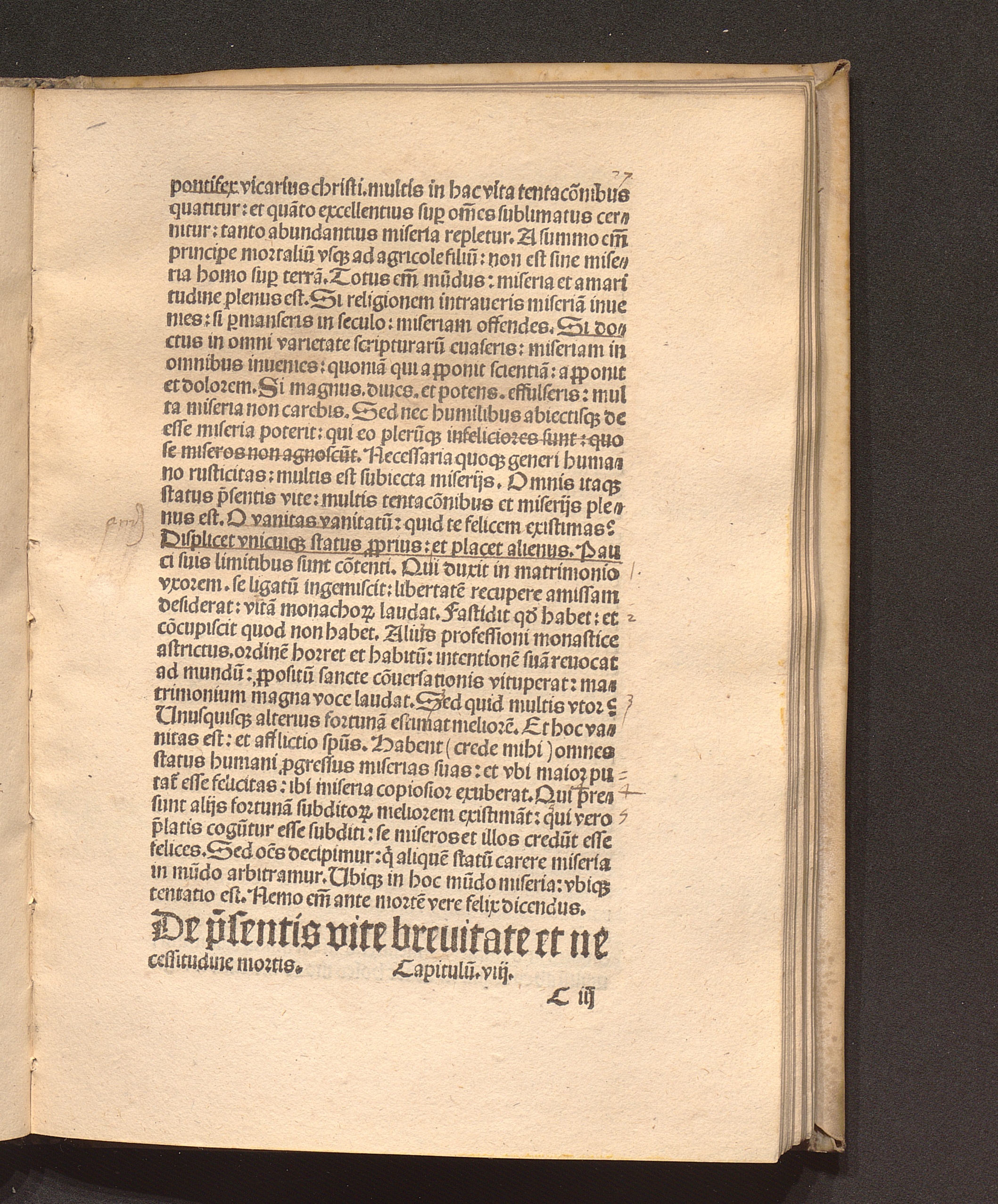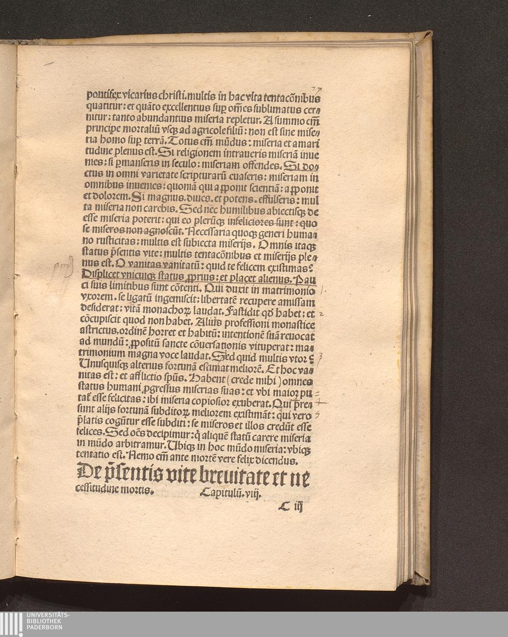 Q[uo]d in omni statu sexu etate et conditione huius vite nunq[uam] desit miseria et tentatio. Cap[itulum] vii.