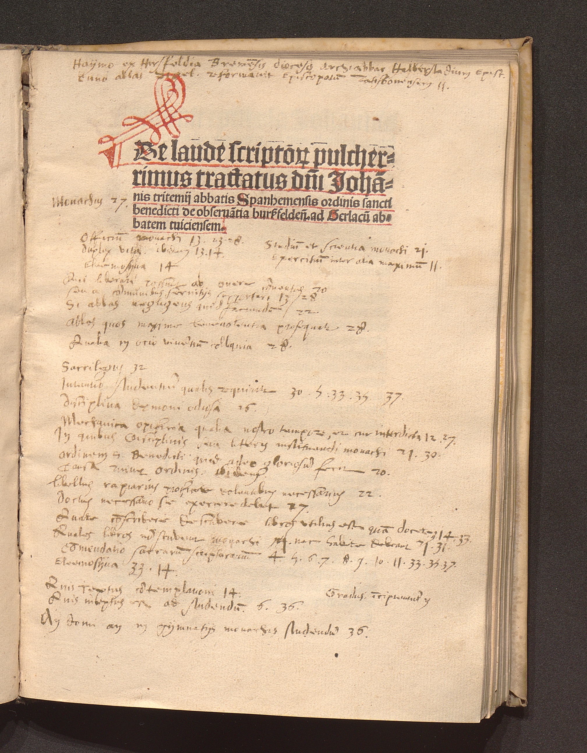 De laude scripto[rum] pulcherrimus tractatus d[omi]ni Joha[n]nis tritemij abbatis Spanhemensis ordinis sancti benedicti de obserua[n]tia burßfelden[sis] ad Gerlacu[m] abbatem tuiciesem