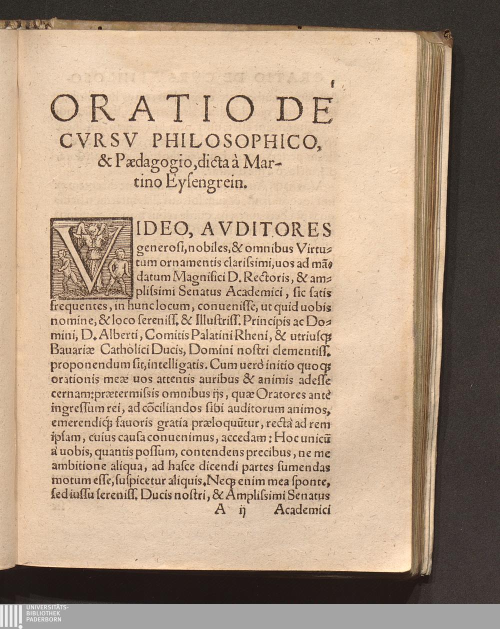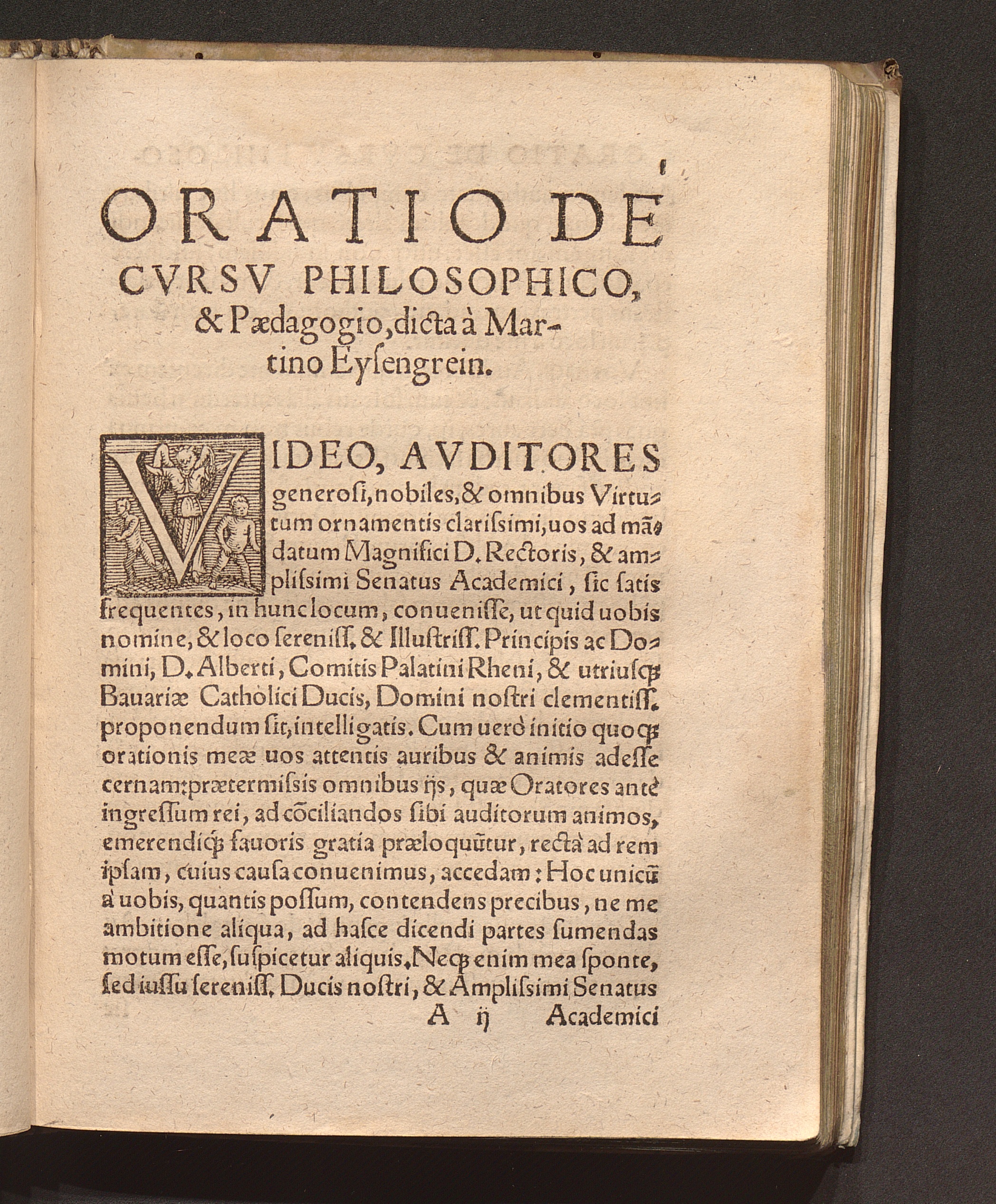Oratio,|| Qva Nomine,|| Loco, Et Avthoritate || Serenissimi, Ac Illvstrissimi || Principis & Domini, Domini Alberti, Comitis || Palatini Rheni, & Vtriusq[ue] Bauariæ Ducis &c. Cursus || Philosophici, ac Pædagogij in celeberrima Ingolstadi-||ensi Academia instauratio : eiusdemq[ue] causæ, ratio-||nes, atq[ue] utilitates, breuiter & luculenter pro-||ponuntur: coràm frequentissimo Pro-||fessorum ac auditorum consessu,|| XI. Cal. Martij. Anno|| M. D. LXXI.|| recitata || / A || Martino Eysengrein SS. Theo-||logiae Licentiato, Praeposito || Oetingensi, & Academiæ Ingolsta-||dianæ Procancellario.||