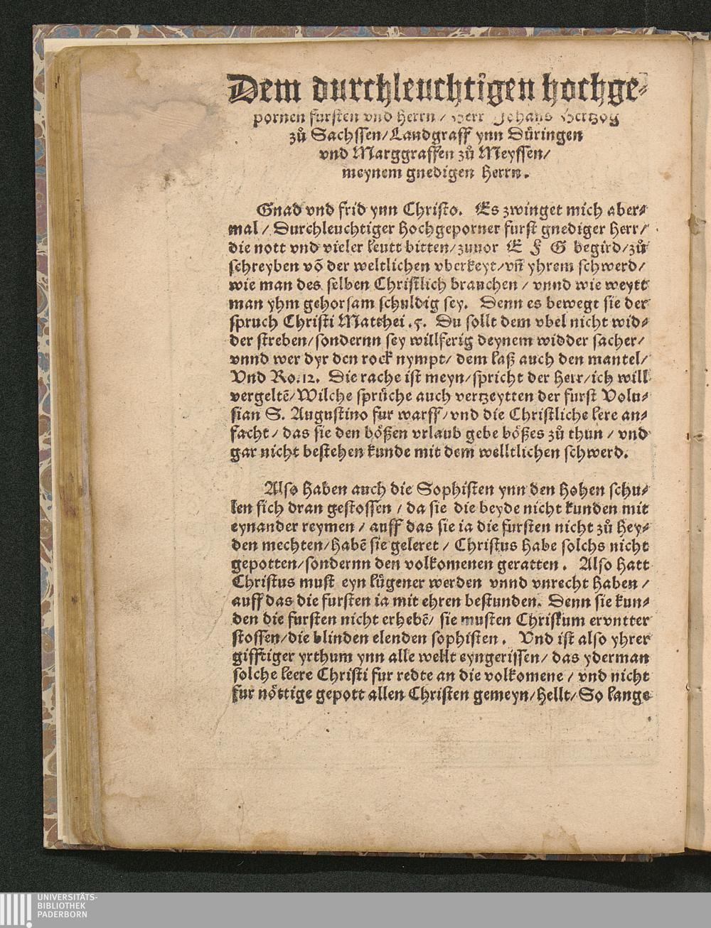 Dem durchleuchtigen hochgepornen fursten vnd herrn/ Herr Johans Hertzog zů Sachssen/ Landgraff ynn Düringen vnd Marggraffen zů Meyssen/ meynem gnedigen herrn.