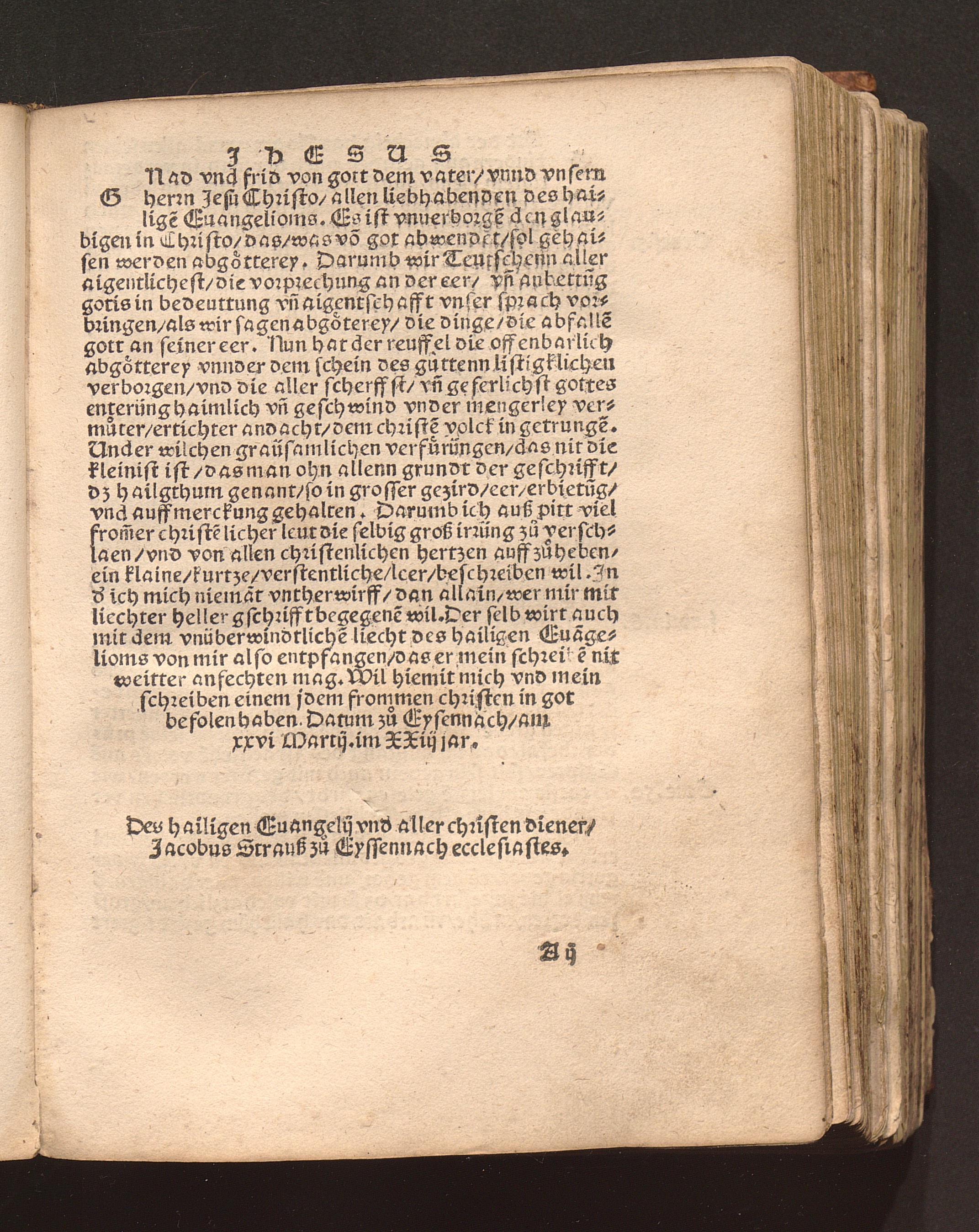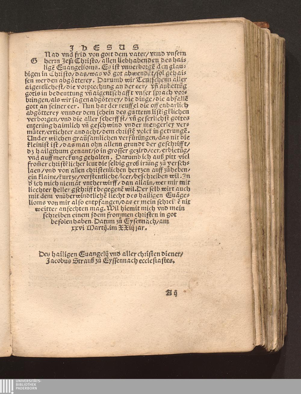 Ein kurtz Christenlich vnterricht des grossen jrrthumbs/ so im heiligthüm zů eren gehalten/ das dan nach gemainem gebrauch der abgoetterey gantz gleich ist / D. Jacobus Strauß zu Eysenach in Doringen Ecclesiastes