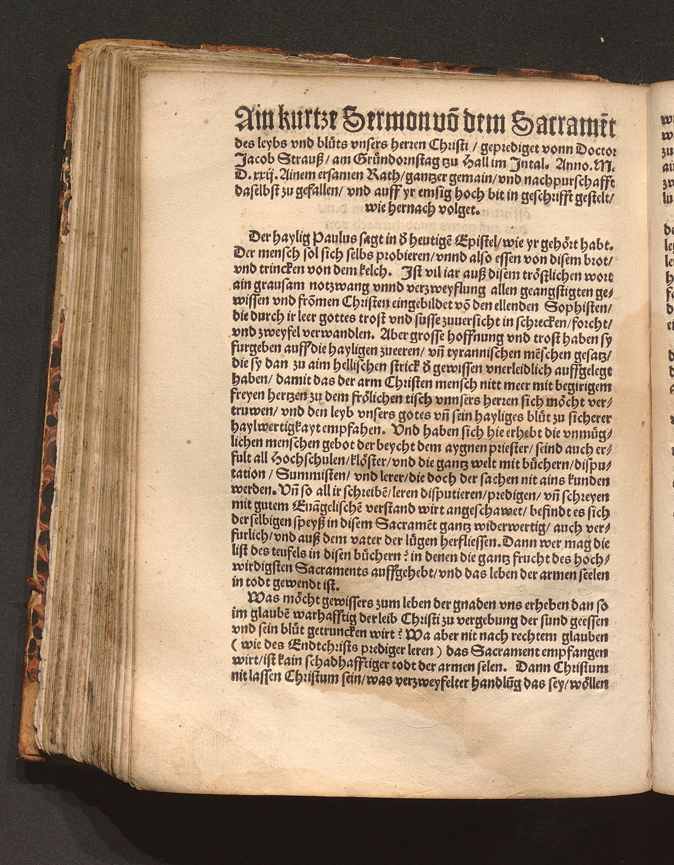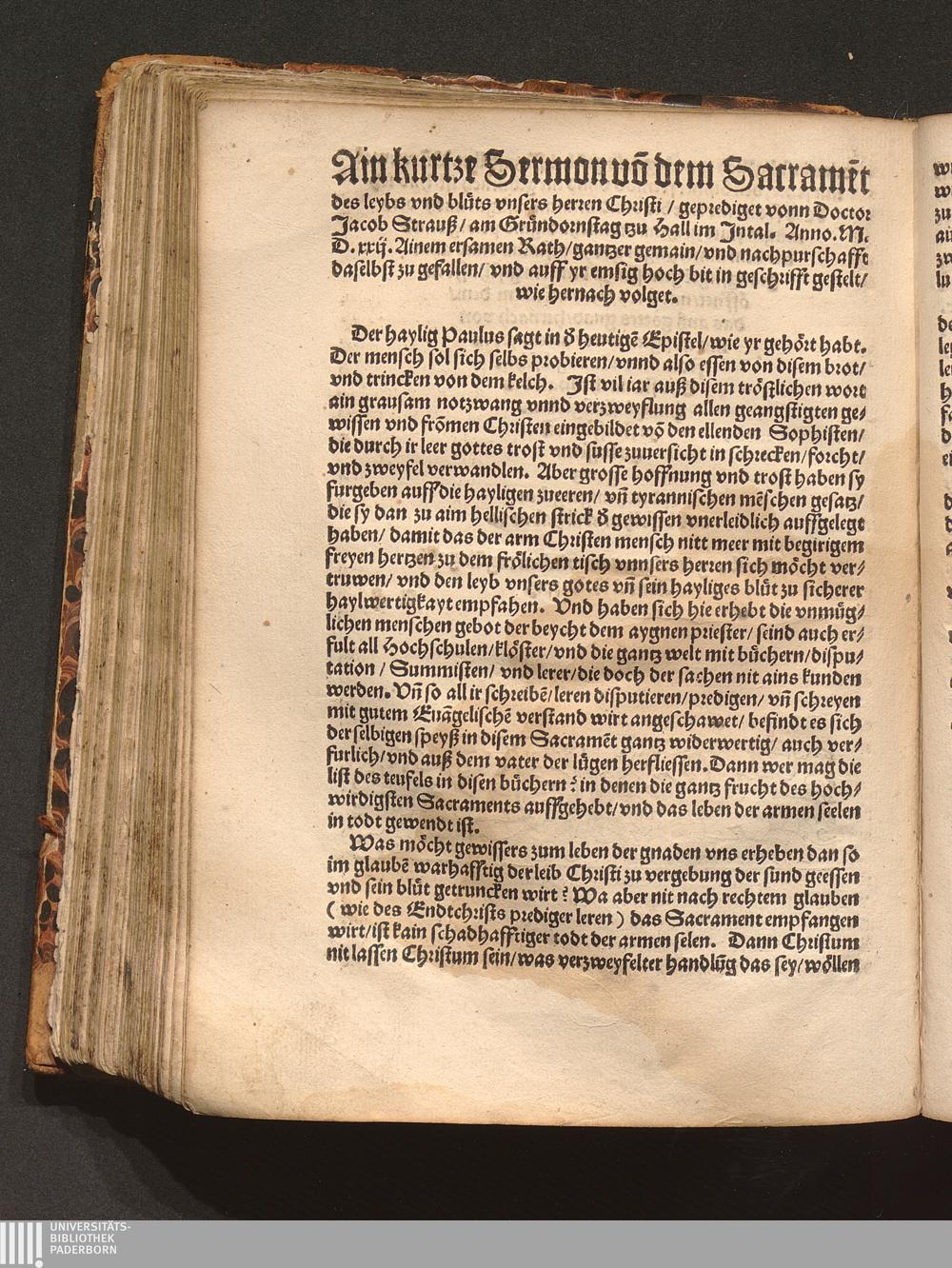 Ain trostliche verstendige leer ueber das Wort sancti Pauli. Der mensch soll sich selbs probieren/ vn[d] also von dem brot essen/ vn[d] von dem kelch trincken / Geprediget zue Hall im Jntal/ durch Doctor Jacob Strauß