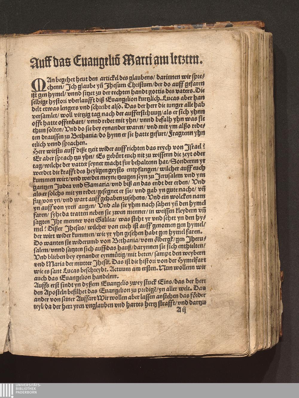 Eyn Sermon ann vnsers herrenn Hymelfarts tag : Marci am. 16. Von der summa des Euangelij/ das ist/ der Glawb / Martinus Luther. wittemberg