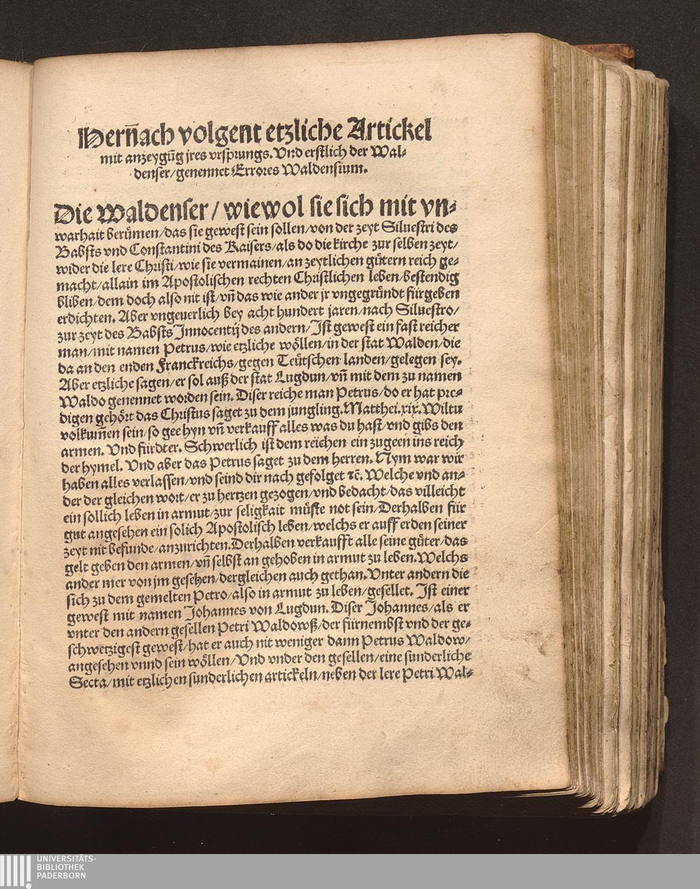 Hernach volgent etzliche Artickel mit anzeygu[n]g jres vrsprungs. Vnd erstlich der Waldenser/ genennet Errores Waldensium.