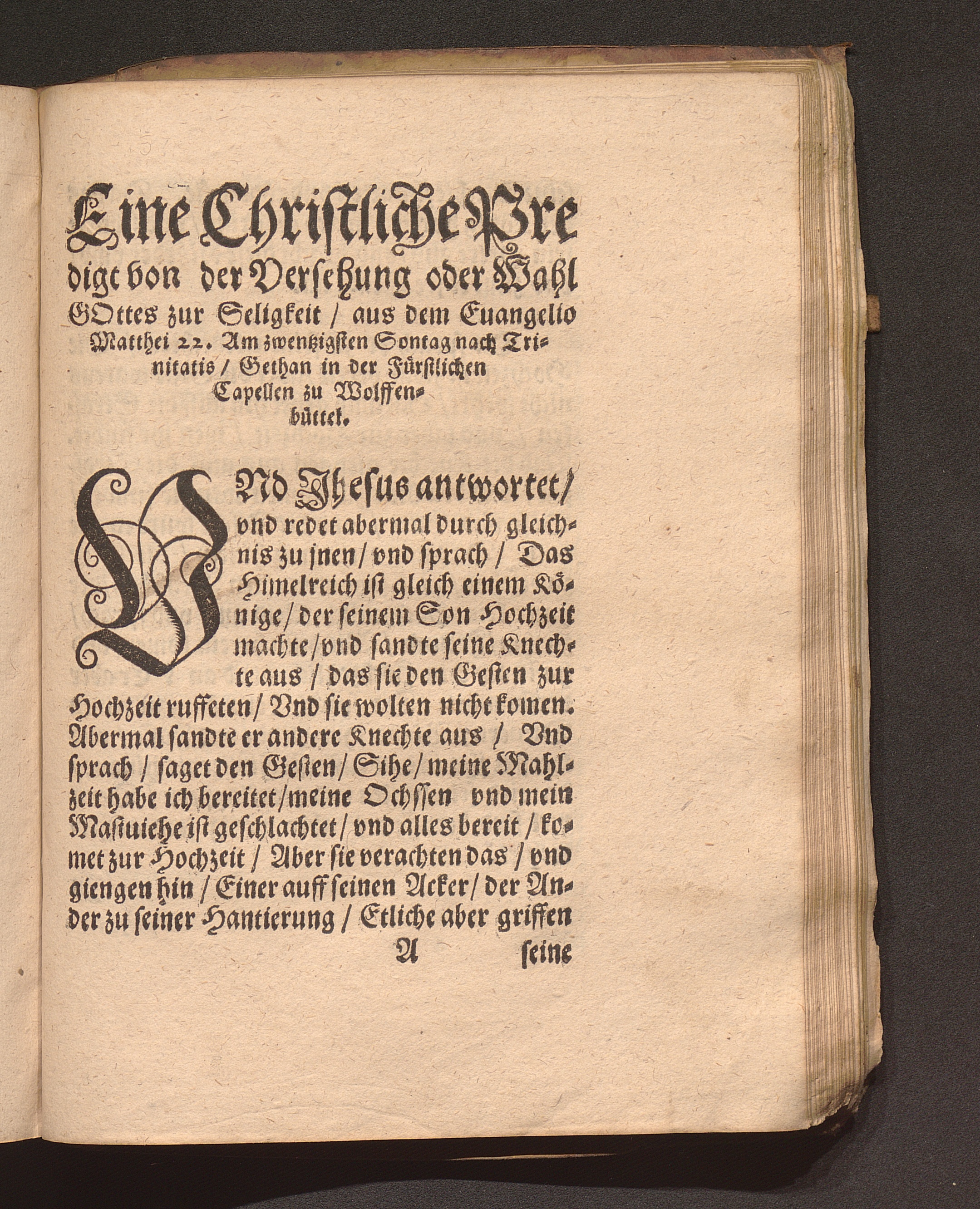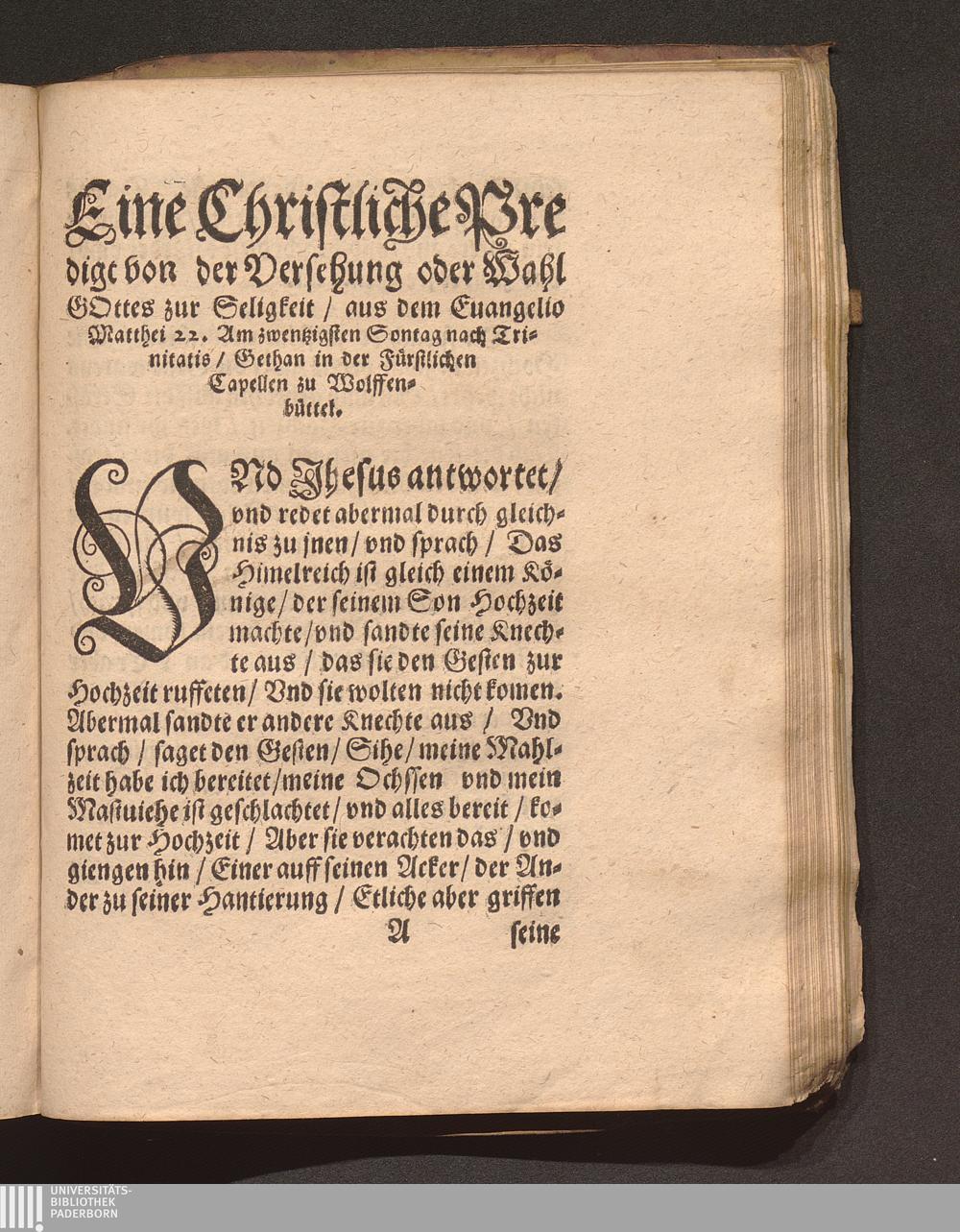 Eine Christliche Predigt von der Versehung oder Wahl Gottes zur Seligkeit/ aus dem Euangelio Matthei 22. Am zwentzigsten Sontag nach Trinitatis/ Gethan in der Fürstlichen Capellen zu Wolffenbüttel.