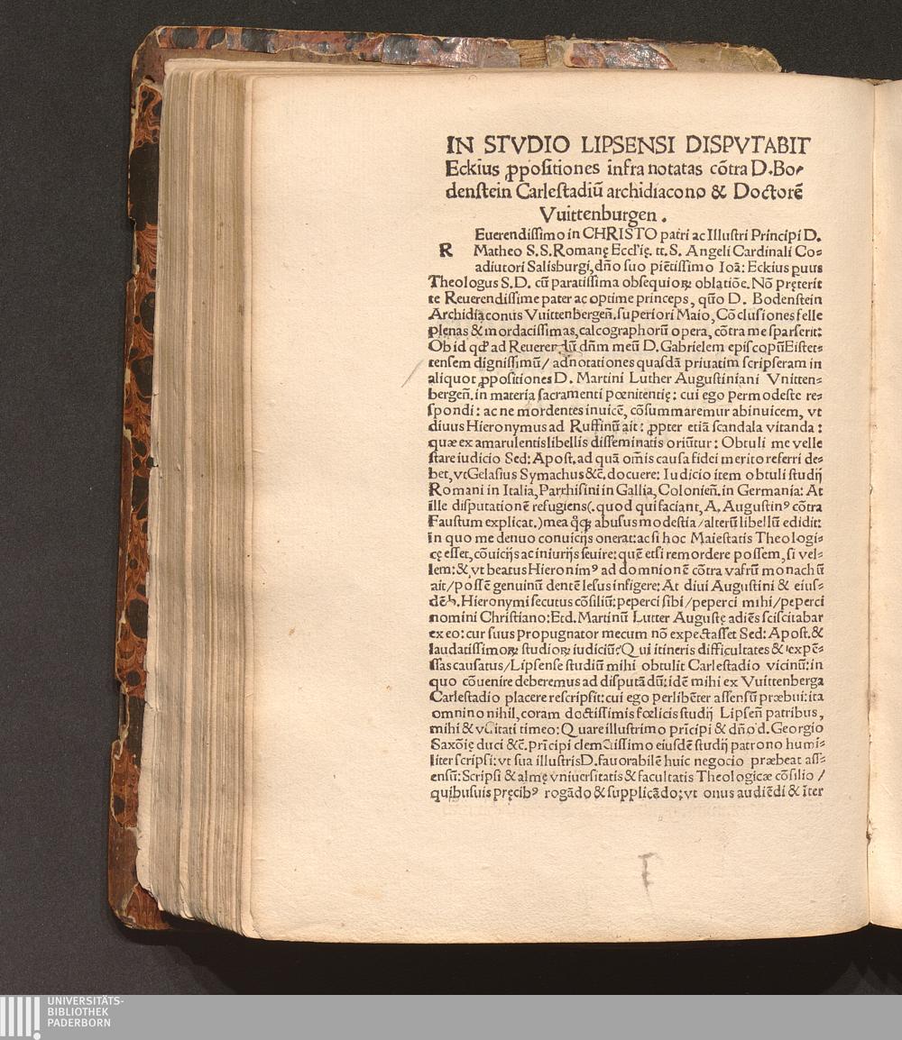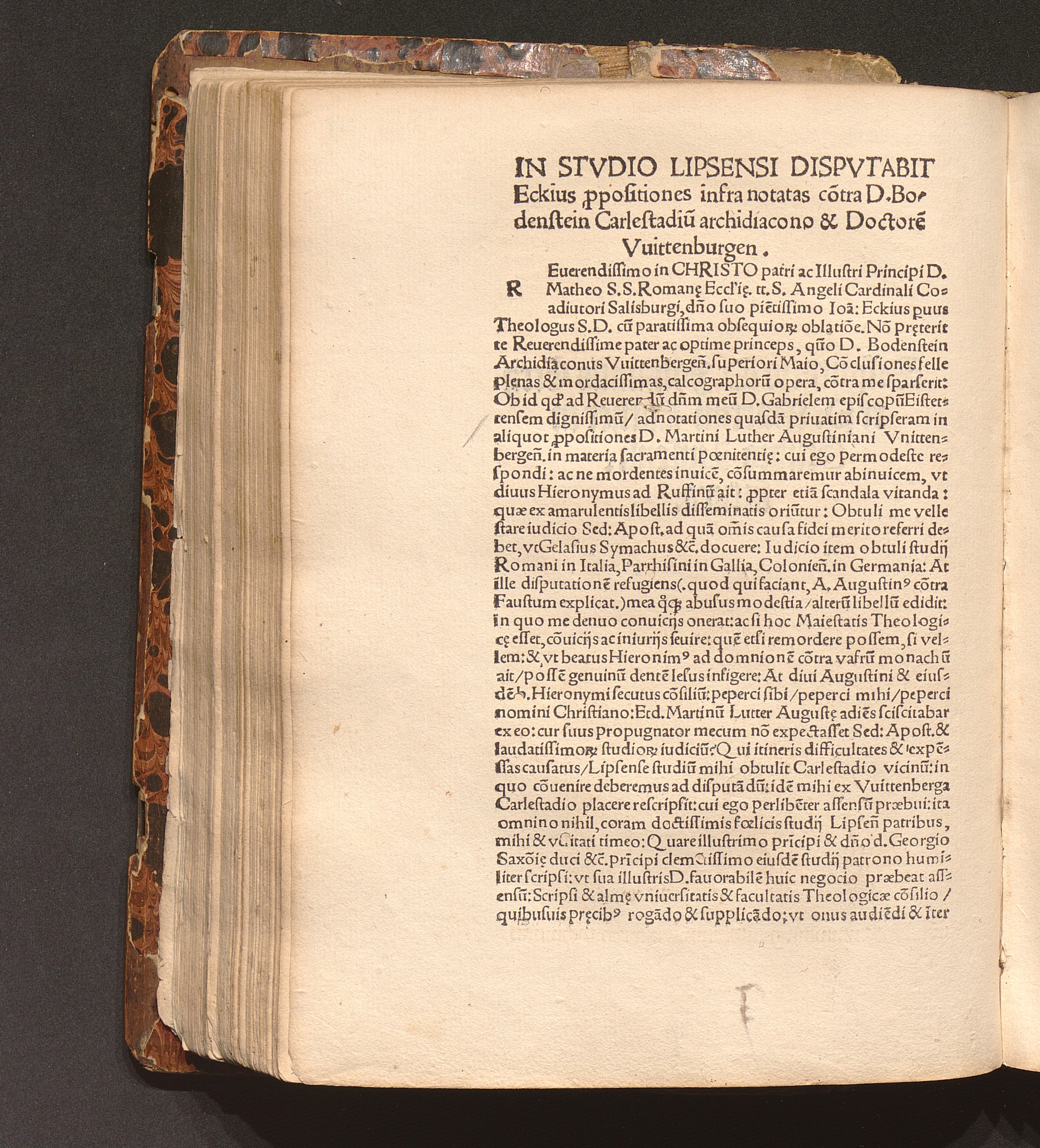 Ihesvs. Ervditissimo Viro Et Prestantissimo. D. Andre[a]e Bodenstein Carlstadio sync[a]erioris Theologi[a]e assertori facile primario. Archidiacono Vuittenbergen[sis]. pr[a]eceptori ac maiori suo in Chr[ist]o Martinus Luther August.