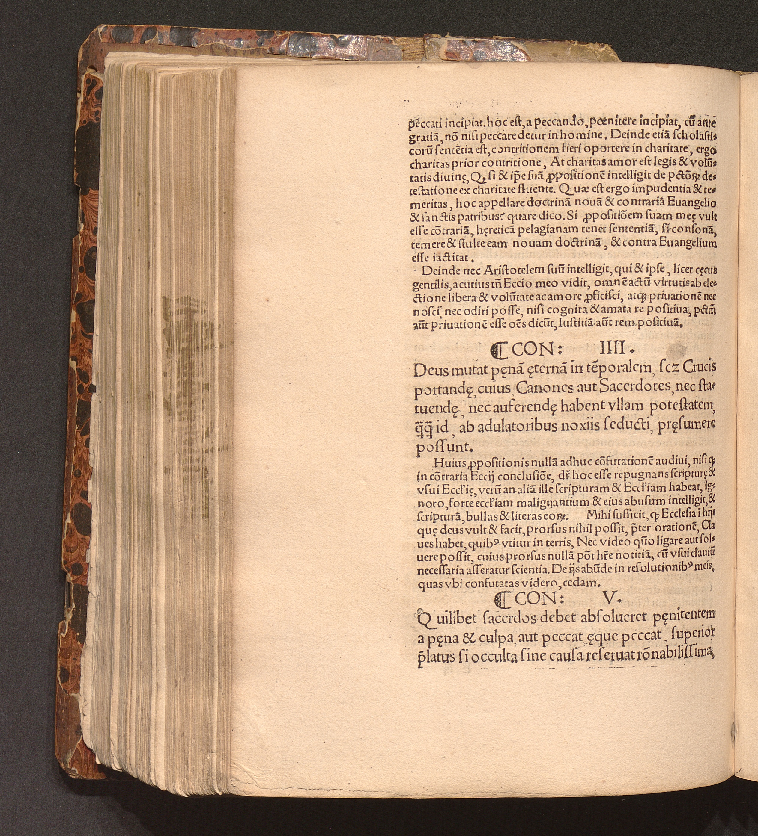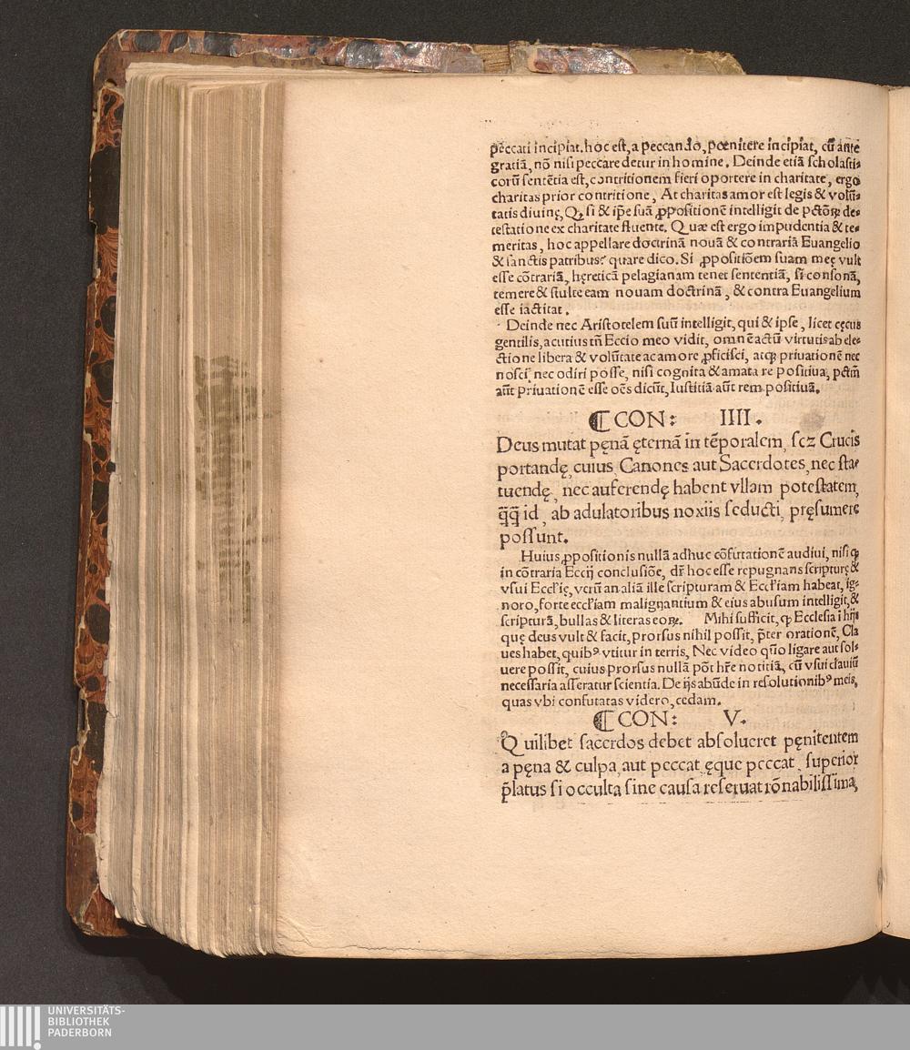 Con: IIII. Deus mutat p[o]ena[m] [a]eterna[m] in te[m]poralem, s[i]c[ut] Crucis portand[a]e, cuius, Canones aut Sacerdotes, nec statuend[a]e, nec auferend[a]e habent vllam potestatem, q[...] id, ab adulatoribus noxiis seducti, pr[a]esumere possunt.