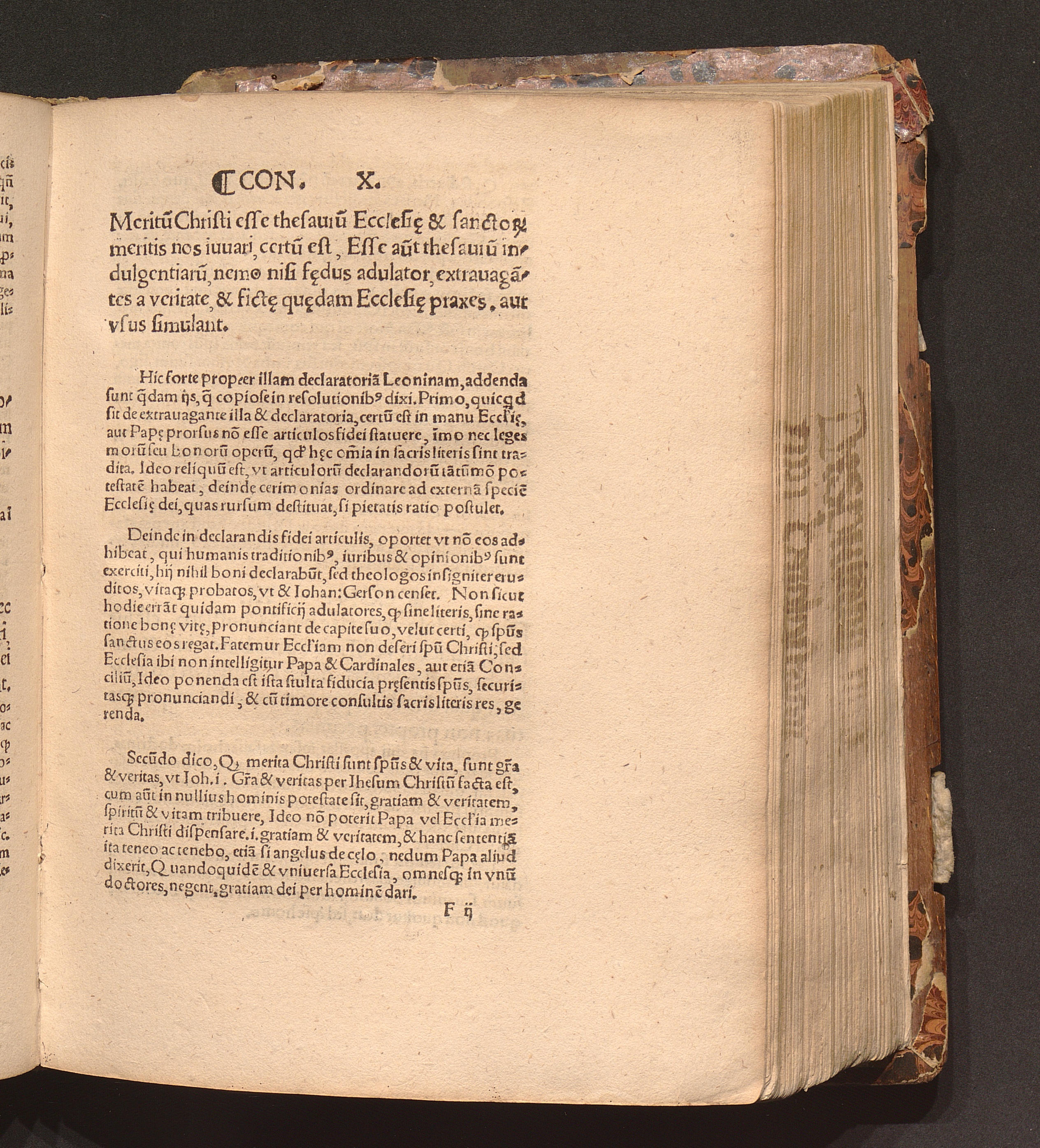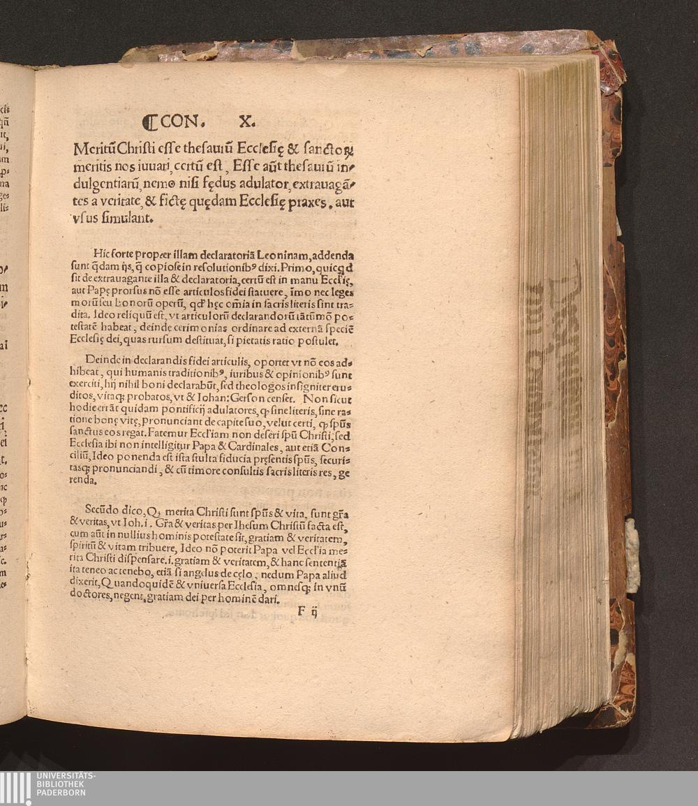 Con. X. Meritu[m] Christi esse thesauru[m] Ecclesi[a]e & sancto[rum] meritis nos iuuari, certu[m] est, Esse aut[...] thesauru[m] indulgentiaru[m], nemo nisi f[o]edus adulator, extrauaga[n]tes a veritate, & fict[a]e qu[a]edam Ecclesi[a]e praxes, aut vsus simulant.