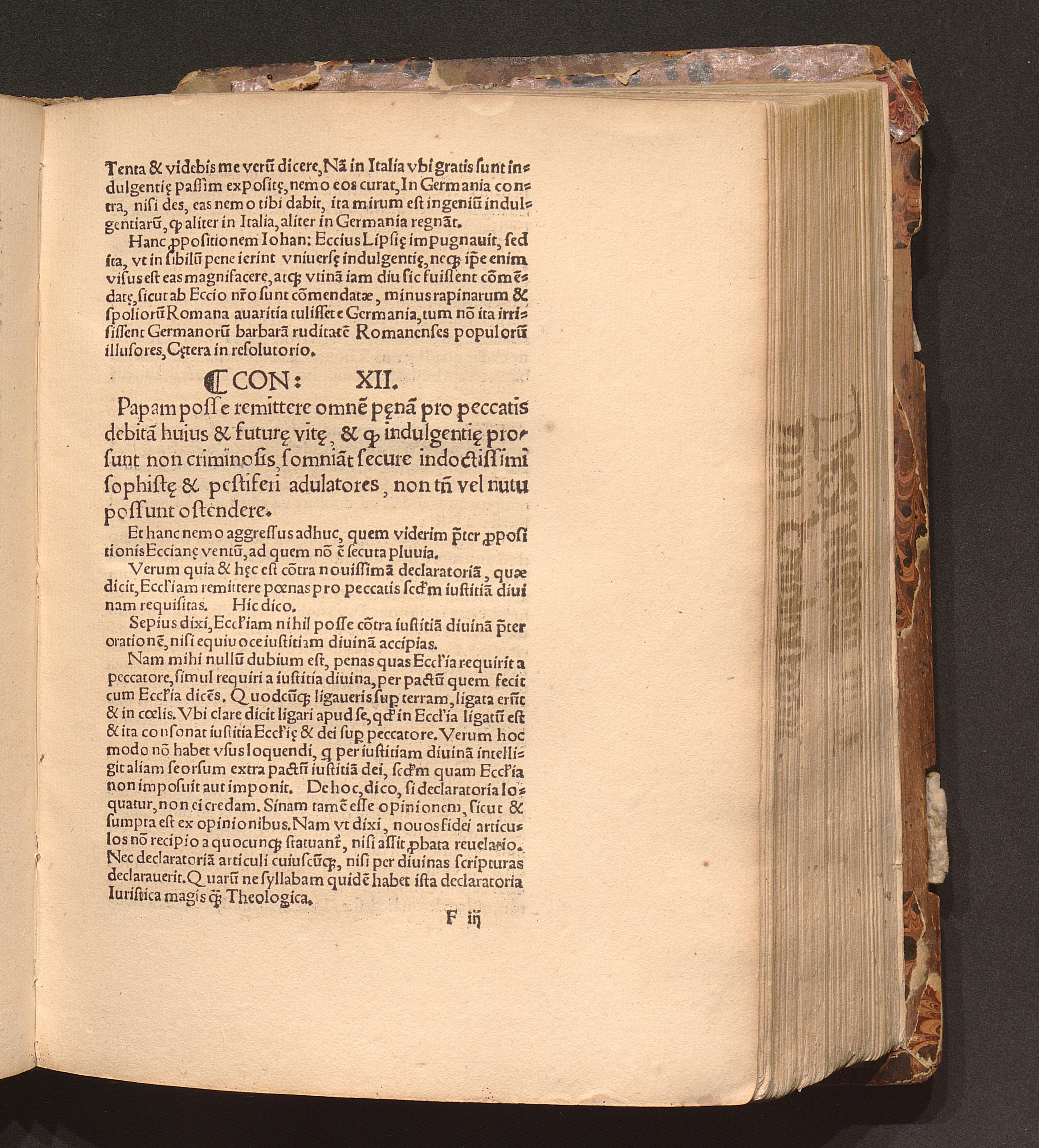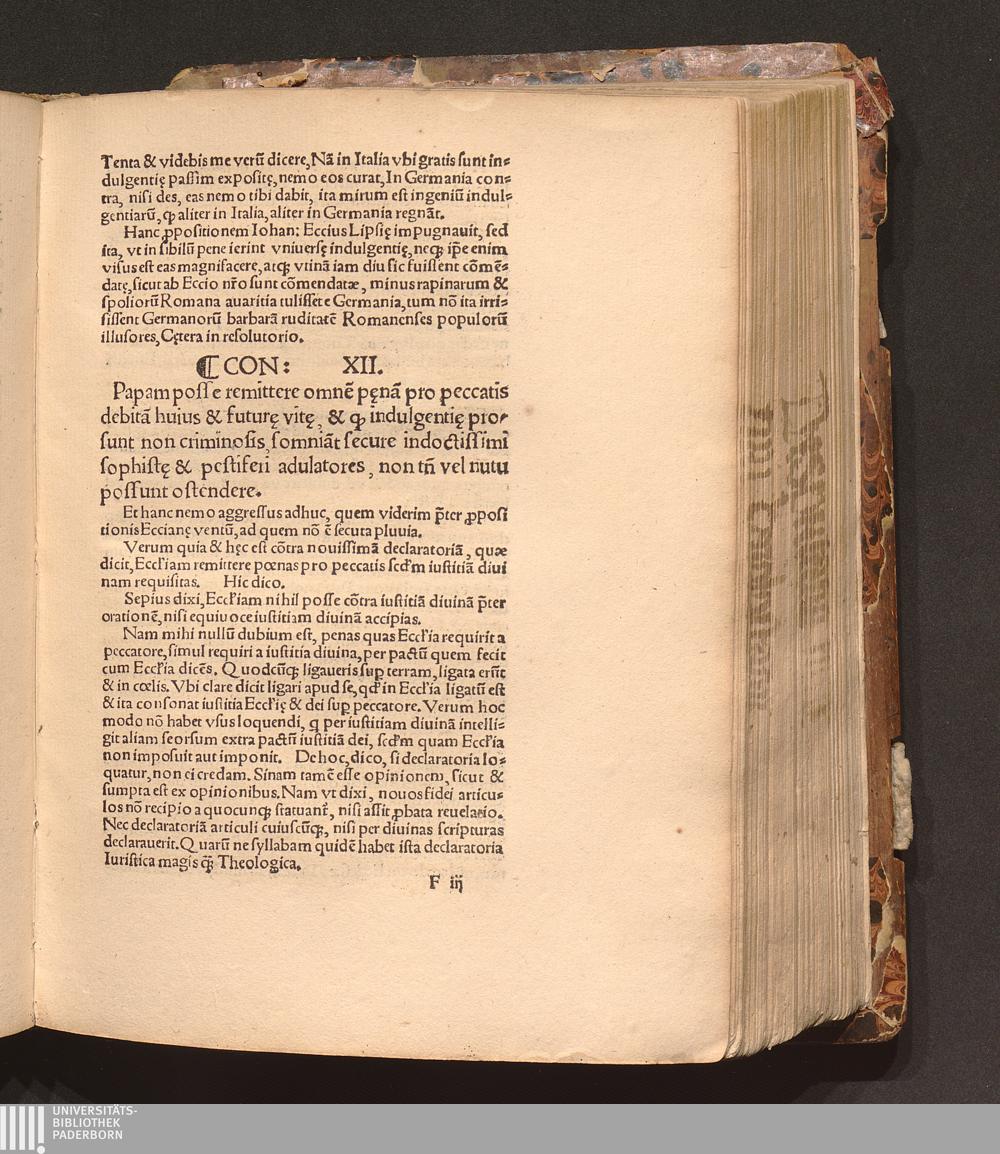 Con: XII. Papam posse remittere omne[m] p[o]ena[m] pro peccatis debita[m] huius & futur[a]e vit[a]e, & q[uod] indulgenti[a]e prosunt non criminosis, somnia[n]t secure indoctissimi sophist[a]e & pestiferi adulatores, non t[...] vel nutu possunt ostendere.