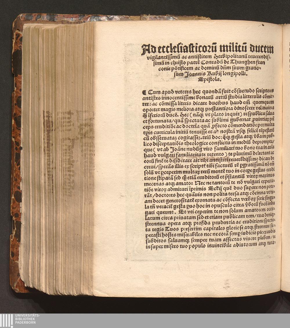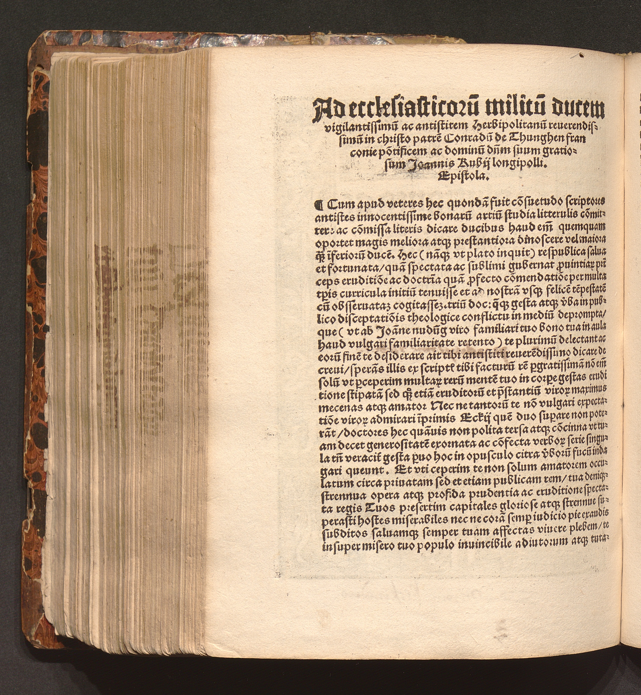 Ad ecclesiasticoru[m] militu[m] ducem vigilantissimu[m] ac antistitem Herbipolitanu[m] reuerendissimu[m] in christo patre[m] Conradu[m] de Thunghen franconie po[n]tificem ac dominu[m] d[omi]n[u]m suum gratiosum Joannis Rubij longipolli. Epistola.