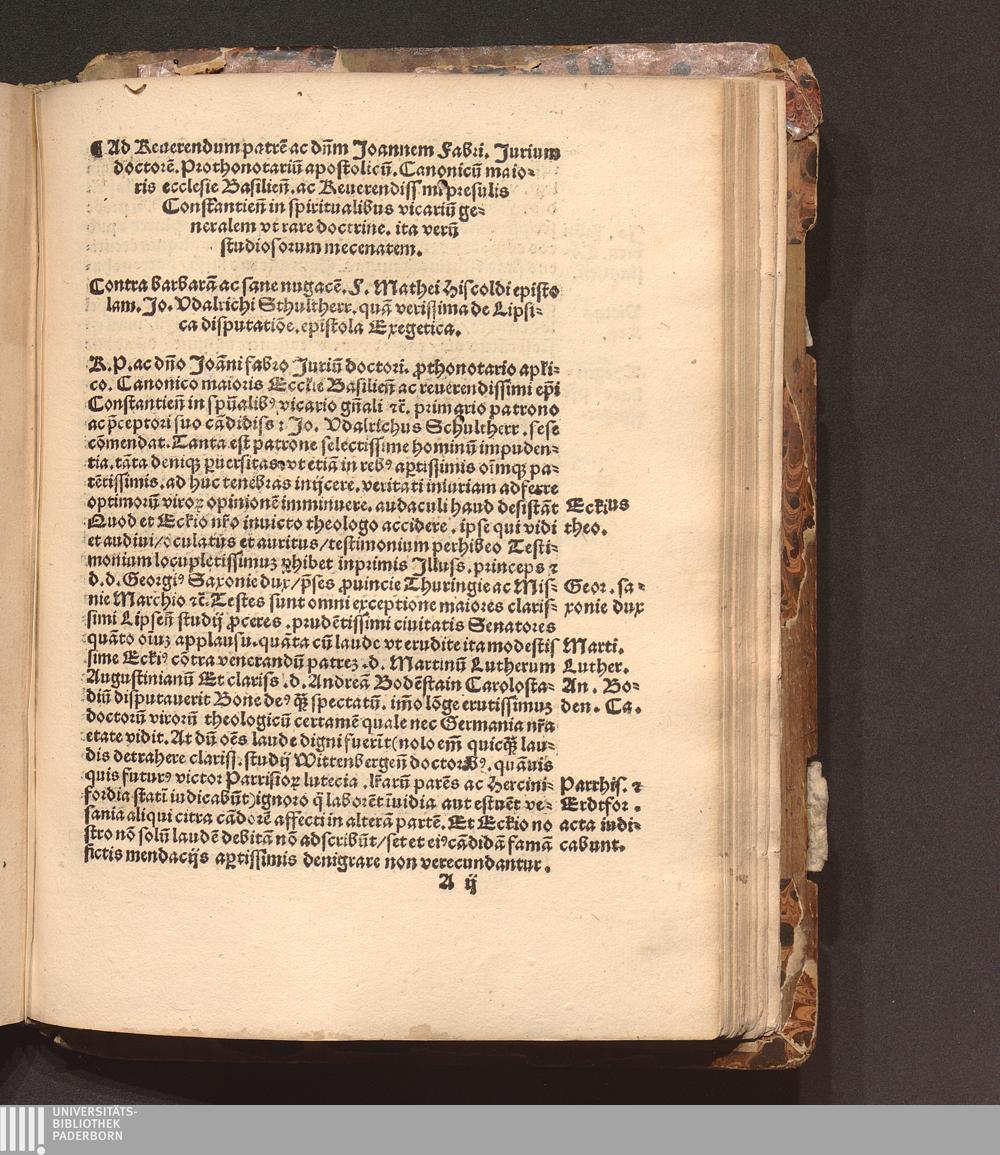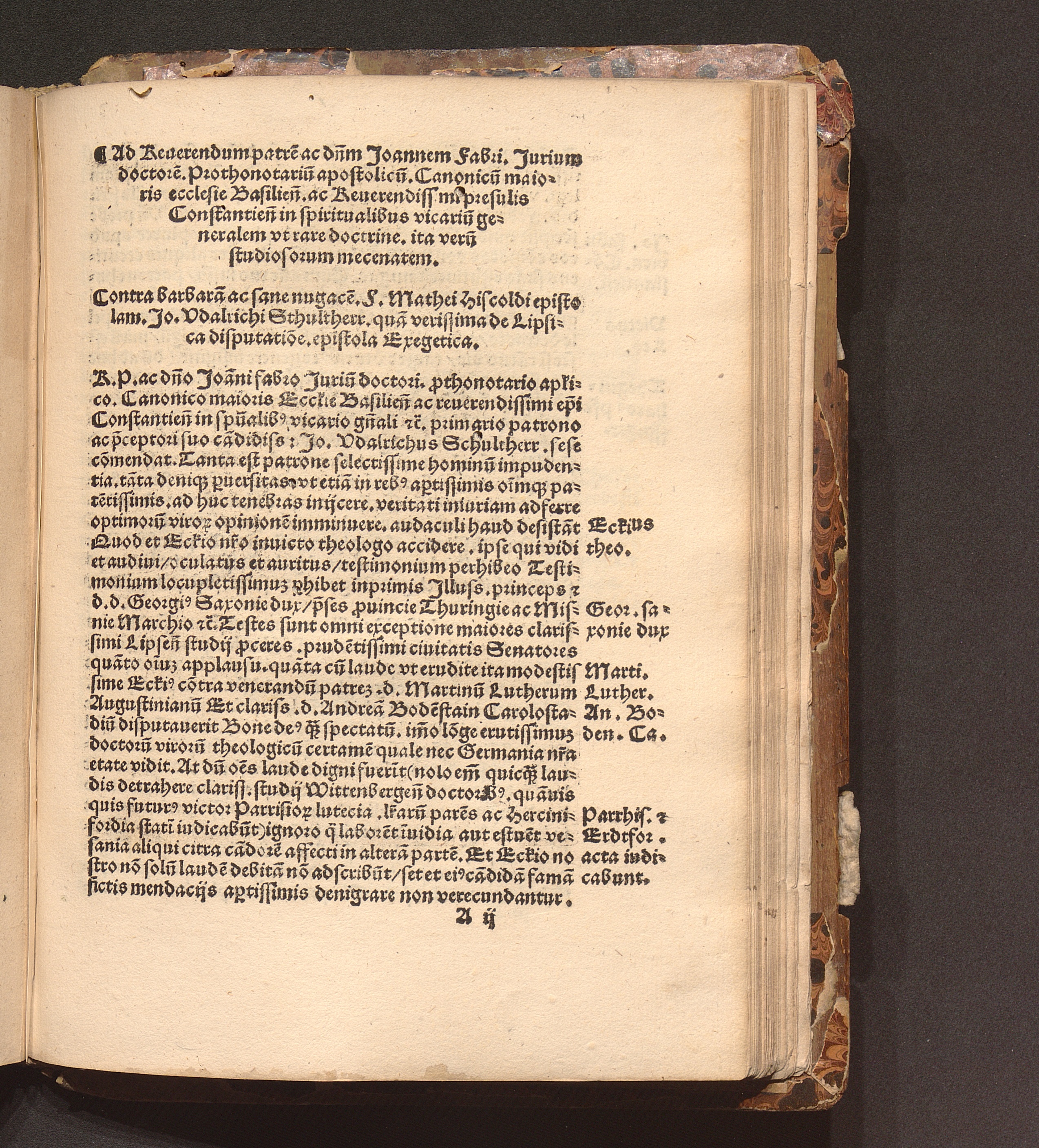 Ad Reuerendum patre[m] ac d[omi]n[u]m Joannem Fabri. Jurium doctore[m]. Prothonotariu[m] apostolicu[m]. Canonicu[m] maioris ecclesie Basilien[sis]. ac Reuerendissimi presulis Constantien[sis] in spiritualibus vicariu[m] generalem vt rare doctrine. ita veru[m] studiosorum mecenatem.