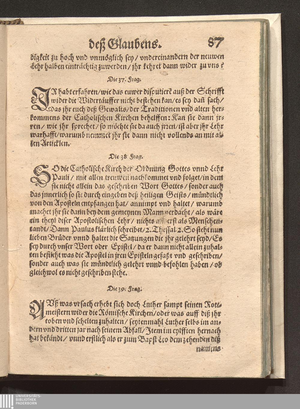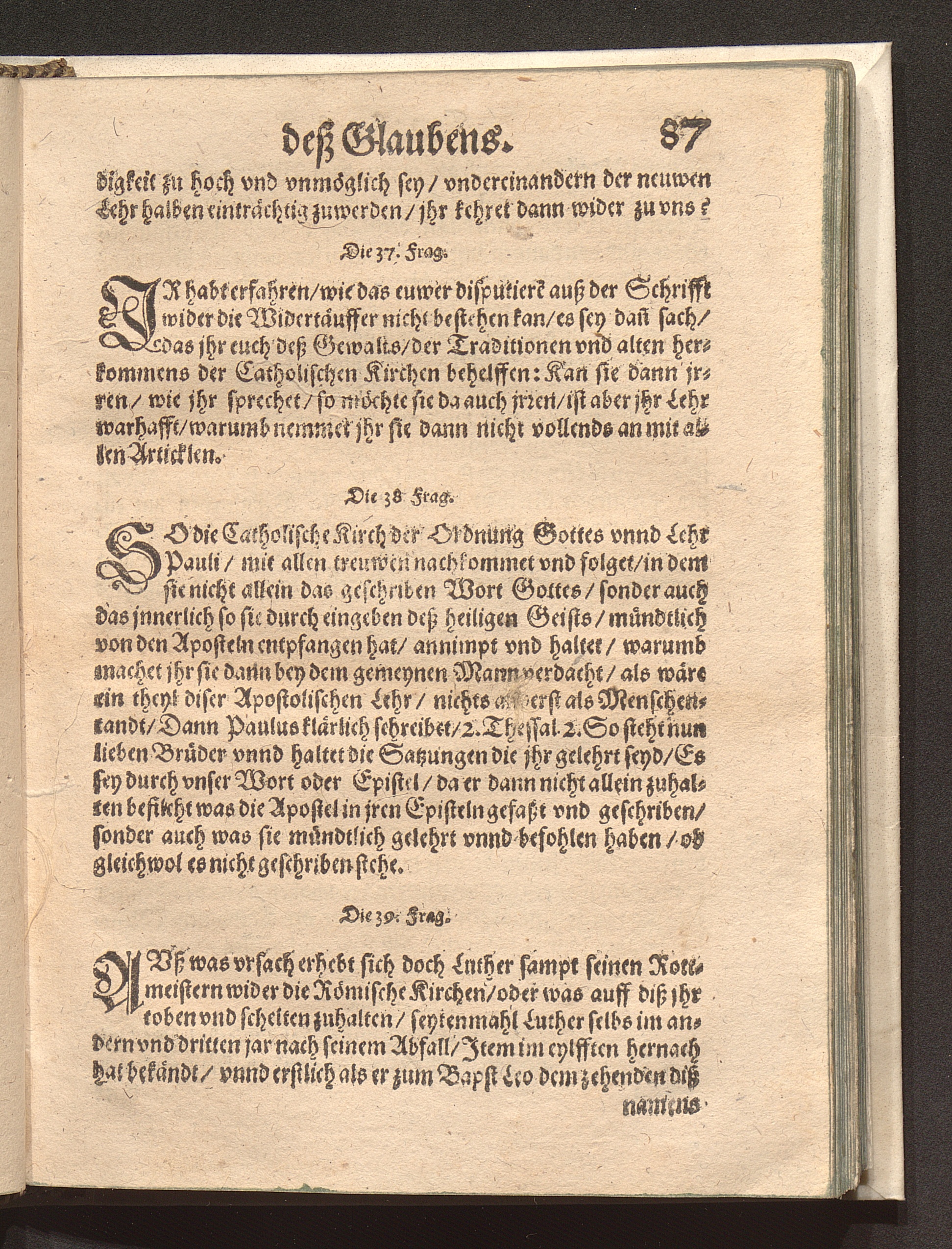 Fragstuck Des Christlichen Glaubens/ an die neuwe Sectische Predigkandten / Durch den Hochgelehrten H. Johann Hayum auß Schotten/ der Societet Jesu Theologum Frantzösisch beschriben/ Vnd folgends durch Sebastian Werro Pfarrherren zu Freyburg in der Eydgnoschafft/ in das Teutsch gebracht/ auch mit dem anderen Theyl vermehret/ vnd alles auff ein neuwes gebessert