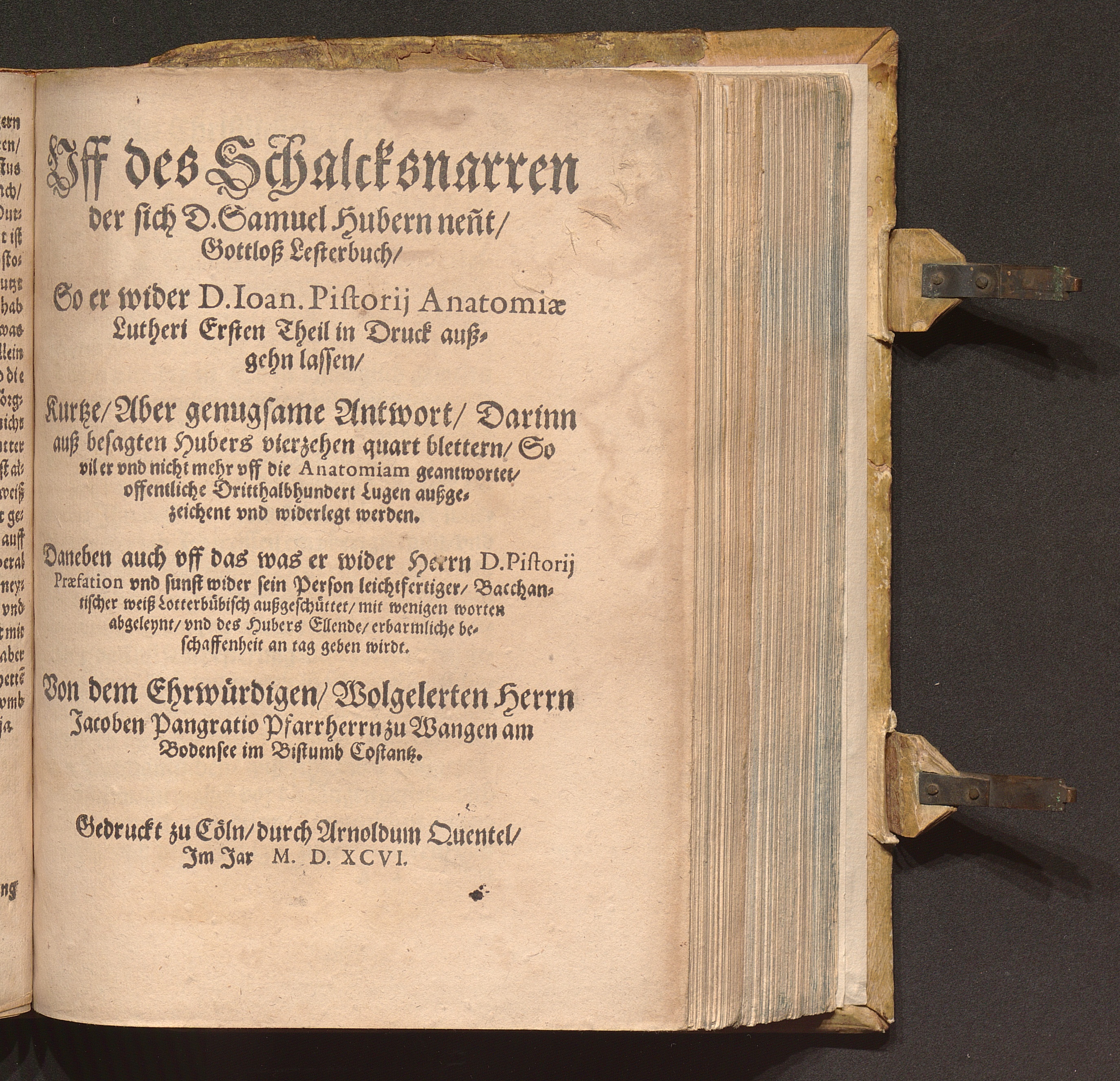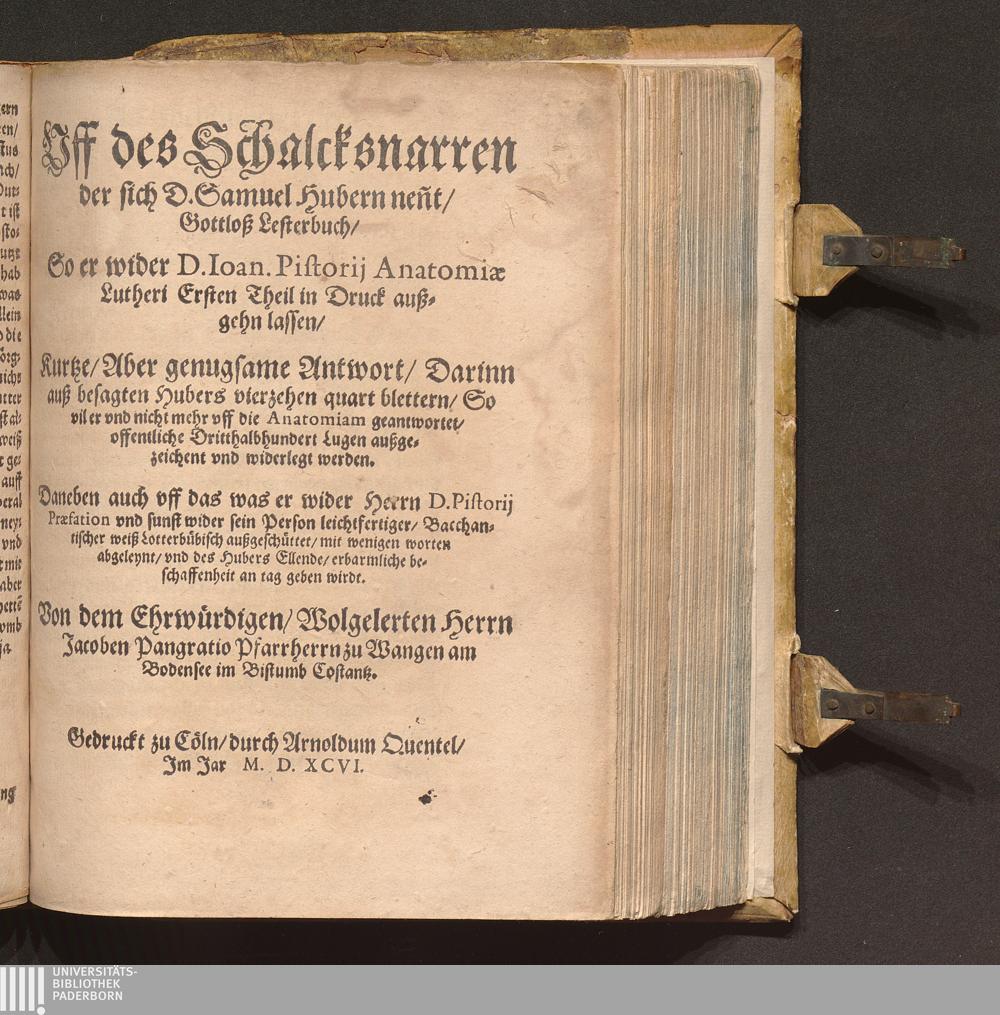 Vff des Schalcksnarren der sich D. Samuel Hubern nen[n]t/ Gottloß Lesterbuch/ So er wider D. Ioan. Pistorij Anatomiæ Lutheri Ersten Theil in Druck außgehn lassen/ Kurtze/ Aber genugsame Antwort/ Darinn auß besagten Hubers vierzehen quart blettern/ So vil er vnd nicht mehr vff die Anatomiam geantwortet/ offentliche Dritthalbhundert Lugen außgezeichent vnd widerlegt werden : Daneben auch vff das was er wider Herrn D. Pistorij Præfation vnd sunst wider sein Person leichtfertiger/ Bacchantischer weiß Lotterbuebisch außgeschuettet/ mit wenigen worten abgeleynt/ vnd des Hubers Ellende/ erbarmliche beschaffenheit an tag geben wirdt / Von dem Ehrwuerdigen/ Wolgelerten Herrn Jacoben Pangratio Pfarrherrn zu Wangen am Bodensee im Bistumb Costantz