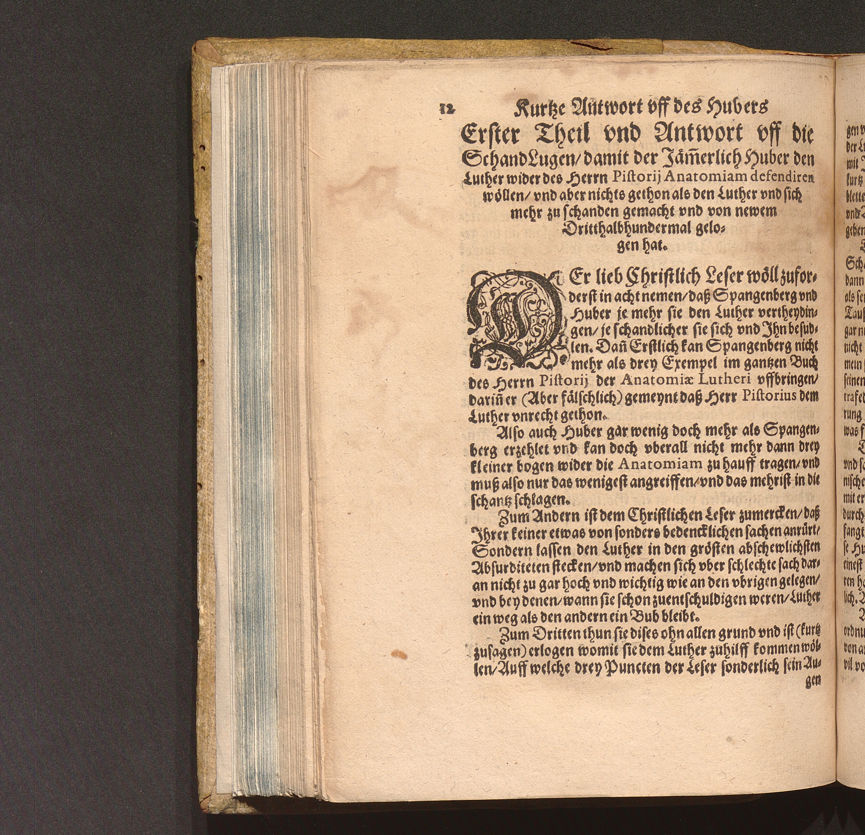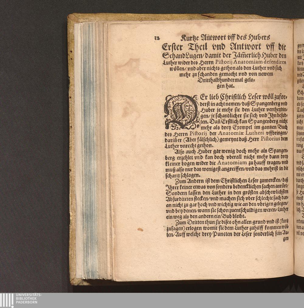 Vff des Schalcksnarren der sich D. Samuel Hubern nen[n]t/ Gottloß Lesterbuch/ So er wider D. Ioan. Pistorij Anatomiæ Lutheri Ersten Theil in Druck außgehn lassen/ Kurtze/ Aber genugsame Antwort/ Darinn auß besagten Hubers vierzehen quart blettern/ So vil er vnd nicht mehr vff die Anatomiam geantwortet/ offentliche Dritthalbhundert Lugen außgezeichent vnd widerlegt werden : Daneben auch vff das was er wider Herrn D. Pistorij Præfation vnd sunst wider sein Person leichtfertiger/ Bacchantischer weiß Lotterbuebisch außgeschuettet/ mit wenigen worten abgeleynt/ vnd des Hubers Ellende/ erbarmliche beschaffenheit an tag geben wirdt / Von dem Ehrwuerdigen/ Wolgelerten Herrn Jacoben Pangratio Pfarrherrn zu Wangen am Bodensee im Bistumb Costantz