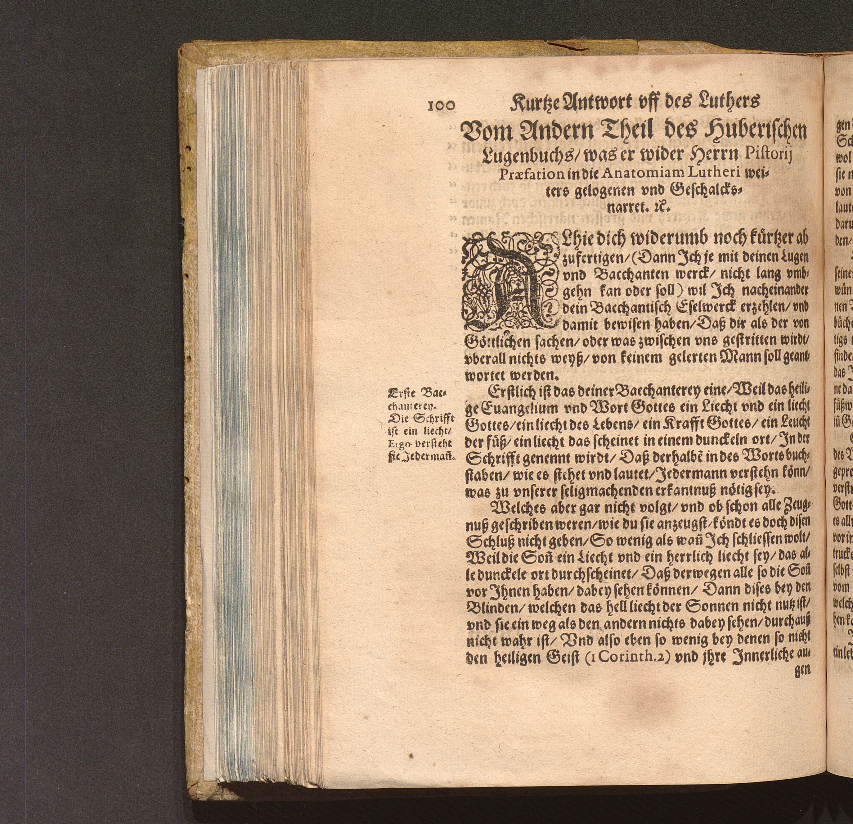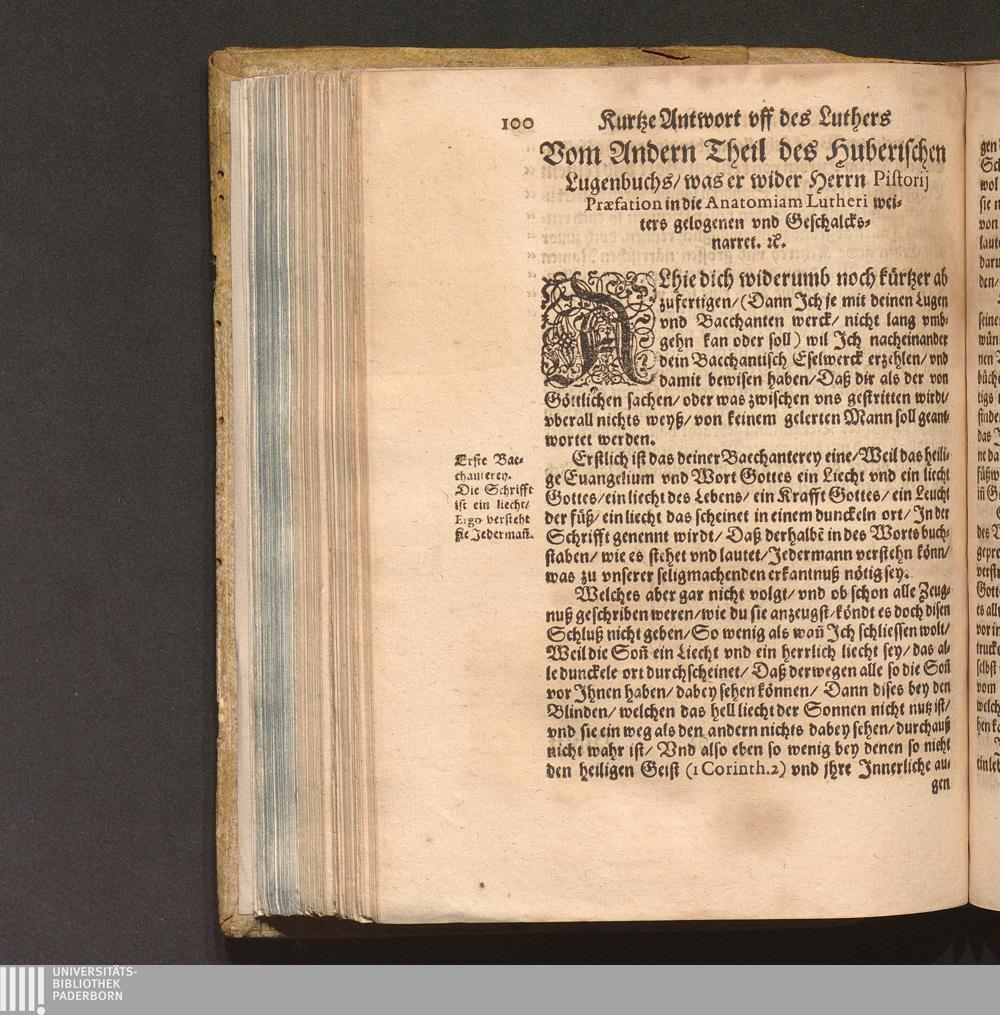 Vff des Schalcksnarren der sich D. Samuel Hubern nen[n]t/ Gottloß Lesterbuch/ So er wider D. Ioan. Pistorij Anatomiæ Lutheri Ersten Theil in Druck außgehn lassen/ Kurtze/ Aber genugsame Antwort/ Darinn auß besagten Hubers vierzehen quart blettern/ So vil er vnd nicht mehr vff die Anatomiam geantwortet/ offentliche Dritthalbhundert Lugen außgezeichent vnd widerlegt werden : Daneben auch vff das was er wider Herrn D. Pistorij Præfation vnd sunst wider sein Person leichtfertiger/ Bacchantischer weiß Lotterbuebisch außgeschuettet/ mit wenigen worten abgeleynt/ vnd des Hubers Ellende/ erbarmliche beschaffenheit an tag geben wirdt / Von dem Ehrwuerdigen/ Wolgelerten Herrn Jacoben Pangratio Pfarrherrn zu Wangen am Bodensee im Bistumb Costantz