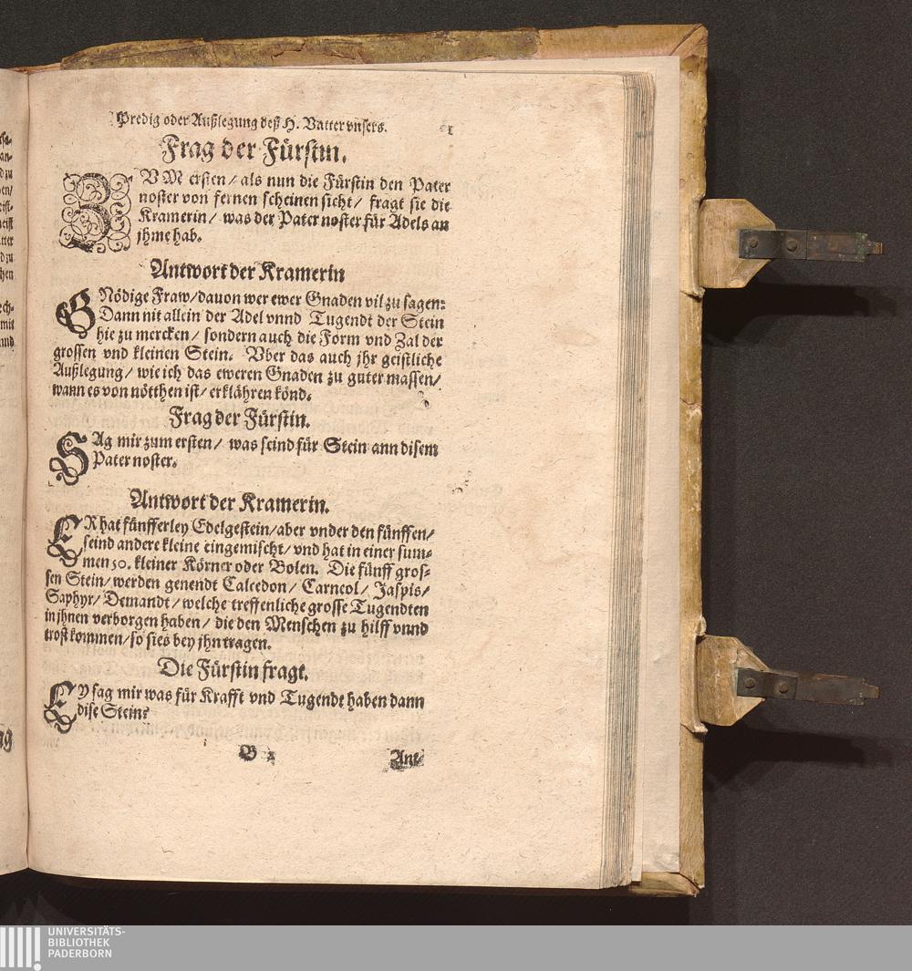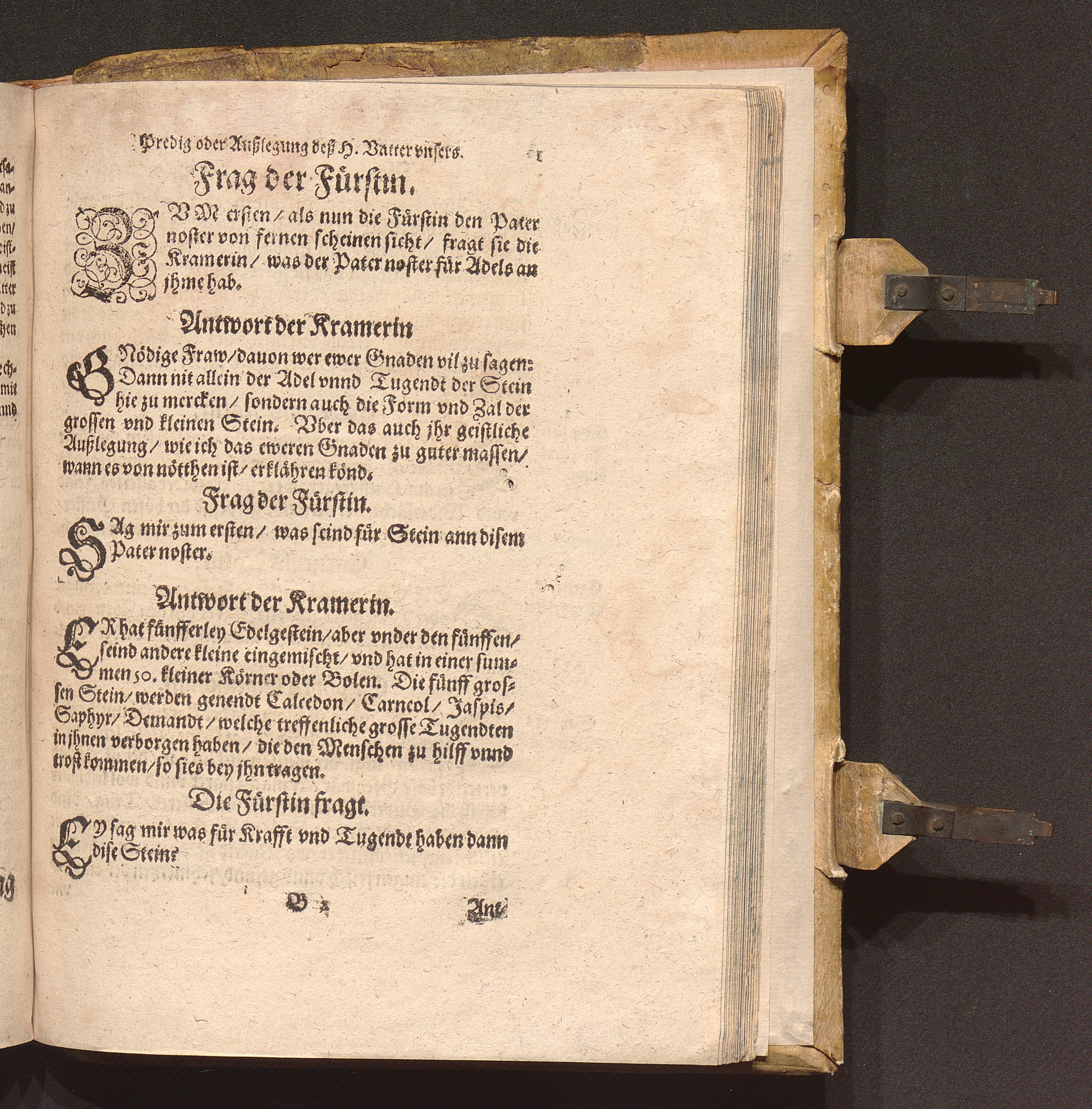 Christliche Catholische Predig vnd Außlegung vber das Pater noster/ oder Rosenkrantz/ in Gespraech weiß zweyer andaechtigen vnd Gottsfoerchtigen Personen : Darinnen der Rosenkrantz den fuenff fuertrefflichsten/ wie auch andern Edelgesteinen/ von wegen jhrer Tugendt vnd Eygenschafft/ so sie haben/ geistlicher vnd gleichfoermiger weiß/ allen Christglaubigen zu sonderm Trost vnd Vnderweisung/ verglichen wirdt / Durch Bartholomæum Wagner Augustanum, in Truck verfertiget