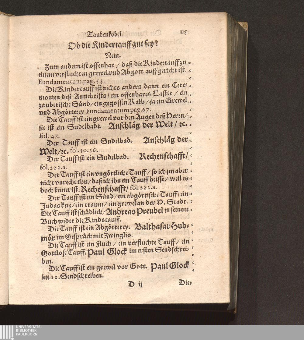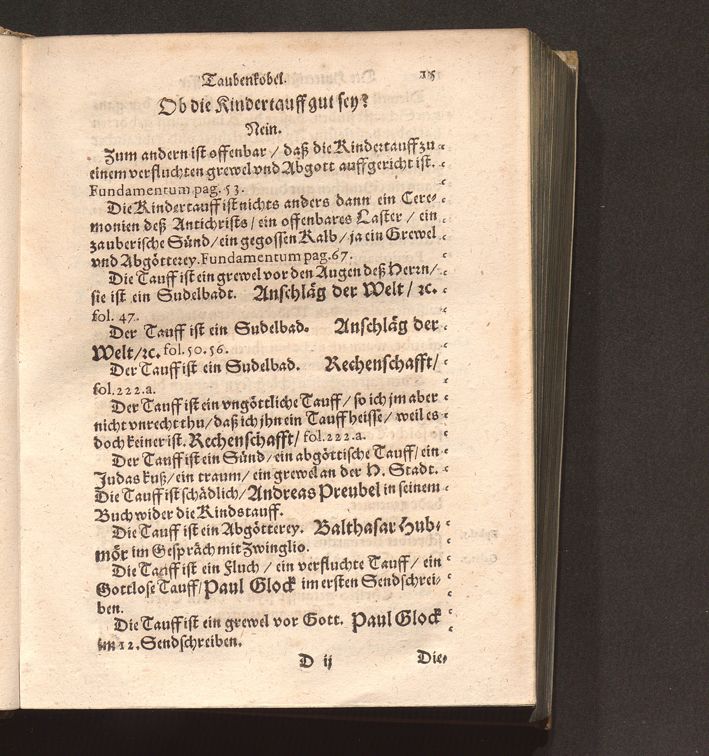 Der Hutterischen Widertauffer Taubenkobel : Jn welchem all jhr Wuest/ Mist/ Kott vnnd Vnflat/ das ist/ jhr falsche/ stinckende/ vnflaetige vnd abscheuliche Lehrn/ was sie nemblich von Gott/ von Christo/ von den H. Sacramenten vnd andern Artickeln deß Christlichen Glaubens halten/ werden erzaehlet/ alle kuertzlich vnd treulich auß jhren eygnen Buechern/ so wol getruckten als geschribnen/ mit Anzeygung deß Orths/ wo ein jedliche zufinden/ verfasset. Auch deß grossen Taubers deß Jacob Hutters Leben/ von welchem sich die Widertauffer Hutterisch nennen/ angehenckt / Durch Christophorvm Andream Fischer D. Pfarrherrn zu Velsperg