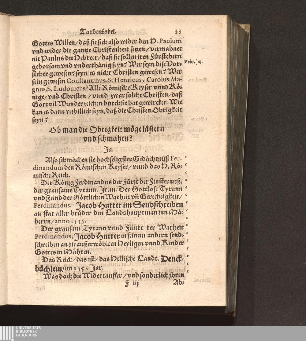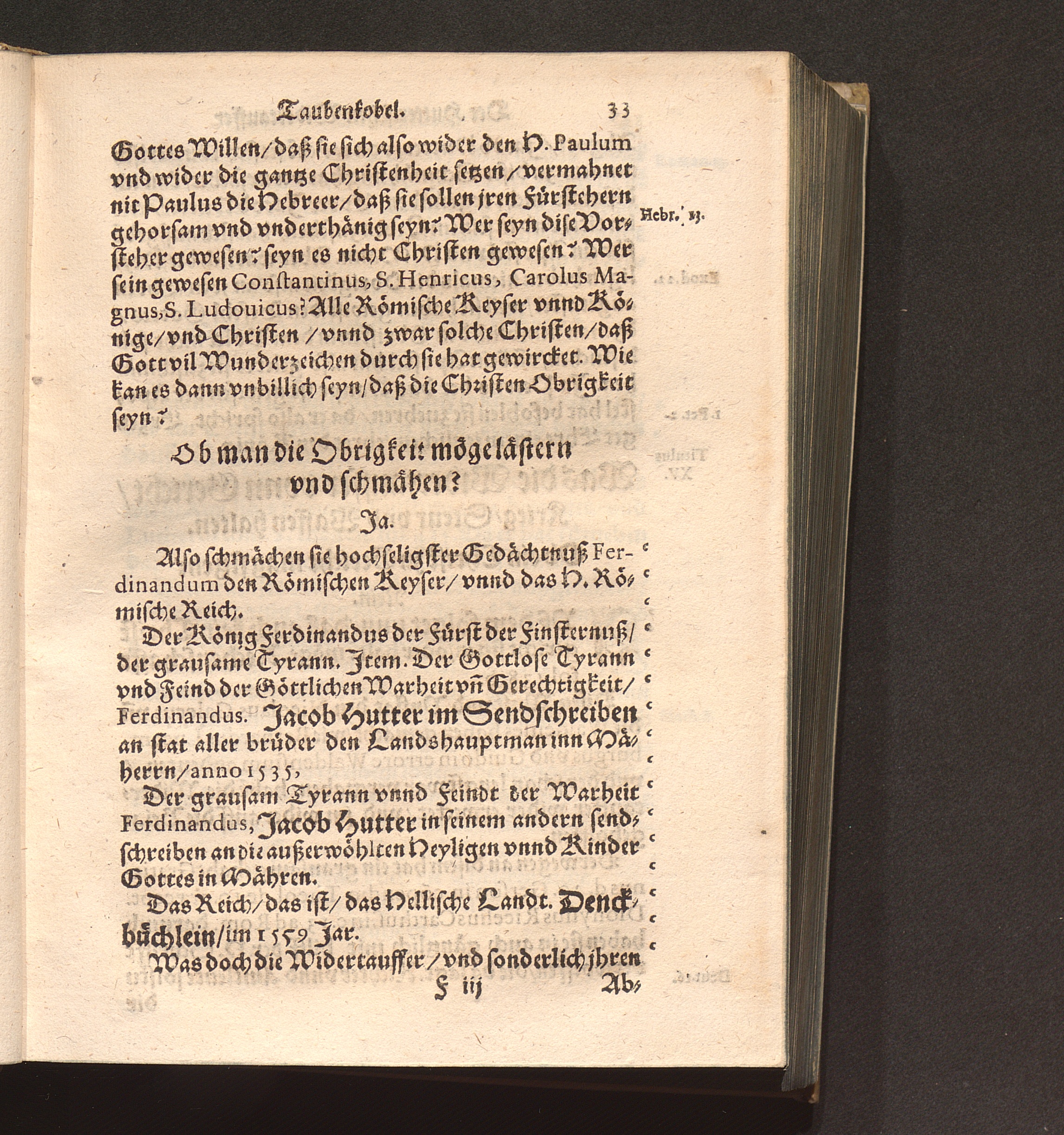 Der Hutterischen Widertauffer Taubenkobel : Jn welchem all jhr Wuest/ Mist/ Kott vnnd Vnflat/ das ist/ jhr falsche/ stinckende/ vnflaetige vnd abscheuliche Lehrn/ was sie nemblich von Gott/ von Christo/ von den H. Sacramenten vnd andern Artickeln deß Christlichen Glaubens halten/ werden erzaehlet/ alle kuertzlich vnd treulich auß jhren eygnen Buechern/ so wol getruckten als geschribnen/ mit Anzeygung deß Orths/ wo ein jedliche zufinden/ verfasset. Auch deß grossen Taubers deß Jacob Hutters Leben/ von welchem sich die Widertauffer Hutterisch nennen/ angehenckt / Durch Christophorvm Andream Fischer D. Pfarrherrn zu Velsperg