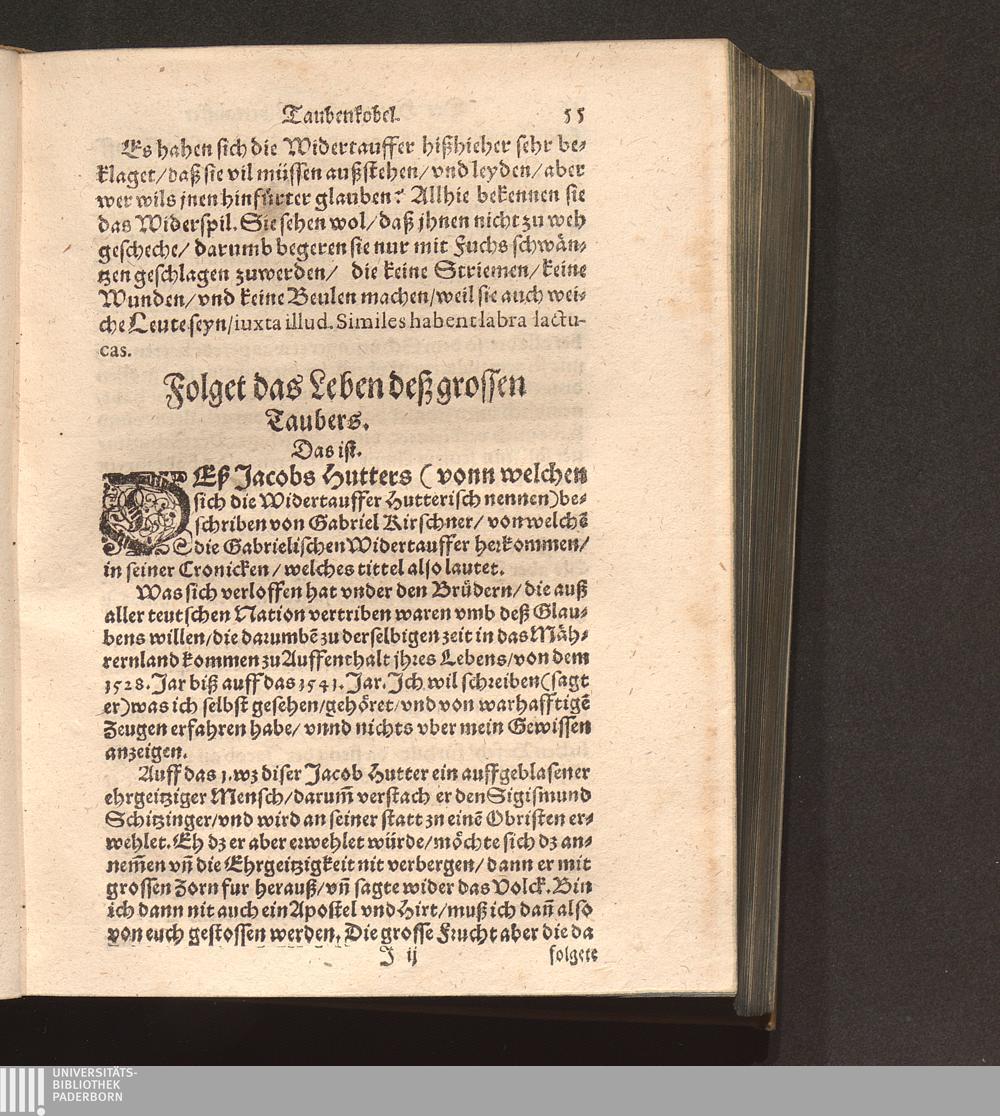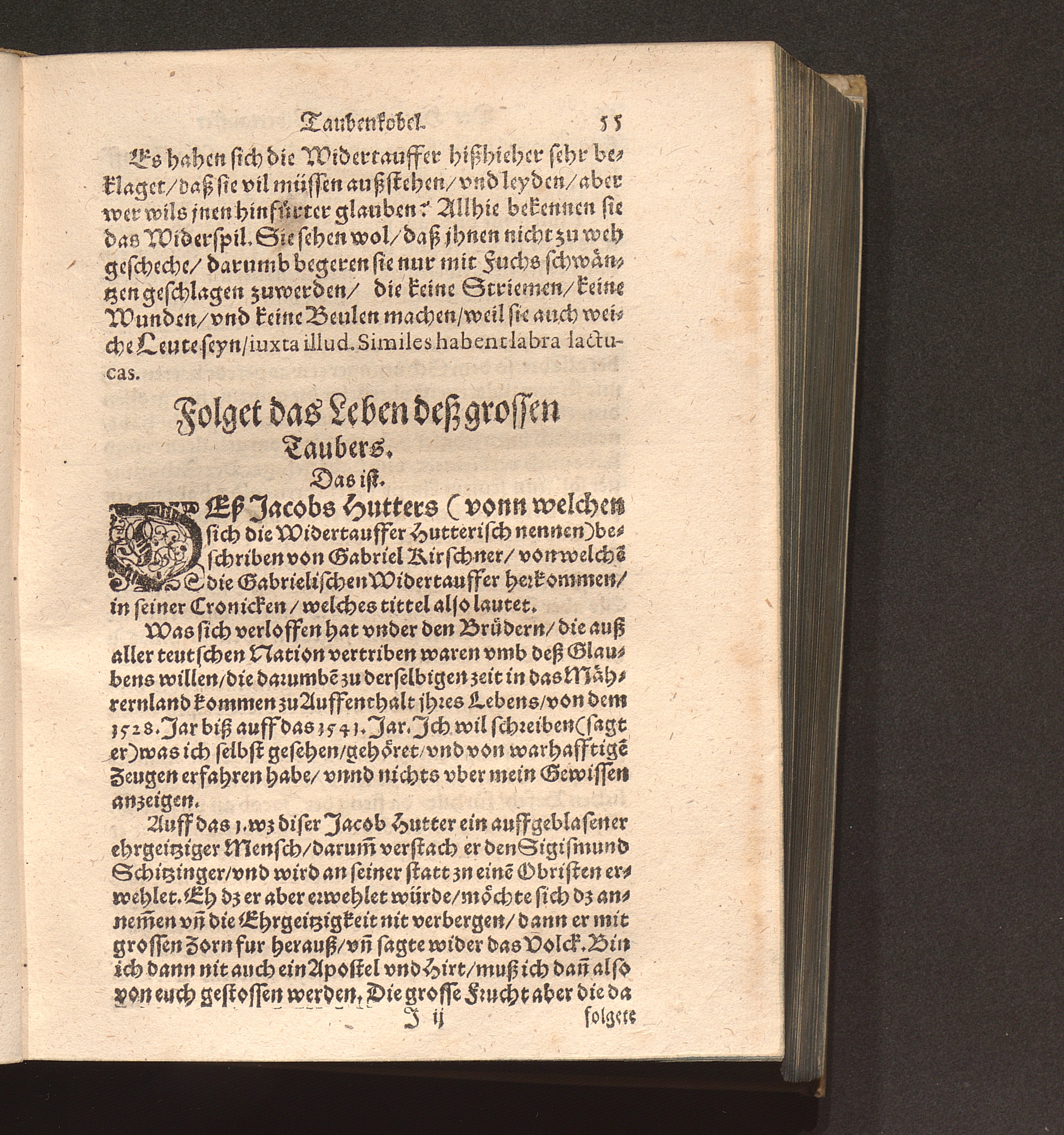 Der Hutterischen Widertauffer Taubenkobel : Jn welchem all jhr Wuest/ Mist/ Kott vnnd Vnflat/ das ist/ jhr falsche/ stinckende/ vnflaetige vnd abscheuliche Lehrn/ was sie nemblich von Gott/ von Christo/ von den H. Sacramenten vnd andern Artickeln deß Christlichen Glaubens halten/ werden erzaehlet/ alle kuertzlich vnd treulich auß jhren eygnen Buechern/ so wol getruckten als geschribnen/ mit Anzeygung deß Orths/ wo ein jedliche zufinden/ verfasset. Auch deß grossen Taubers deß Jacob Hutters Leben/ von welchem sich die Widertauffer Hutterisch nennen/ angehenckt / Durch Christophorvm Andream Fischer D. Pfarrherrn zu Velsperg