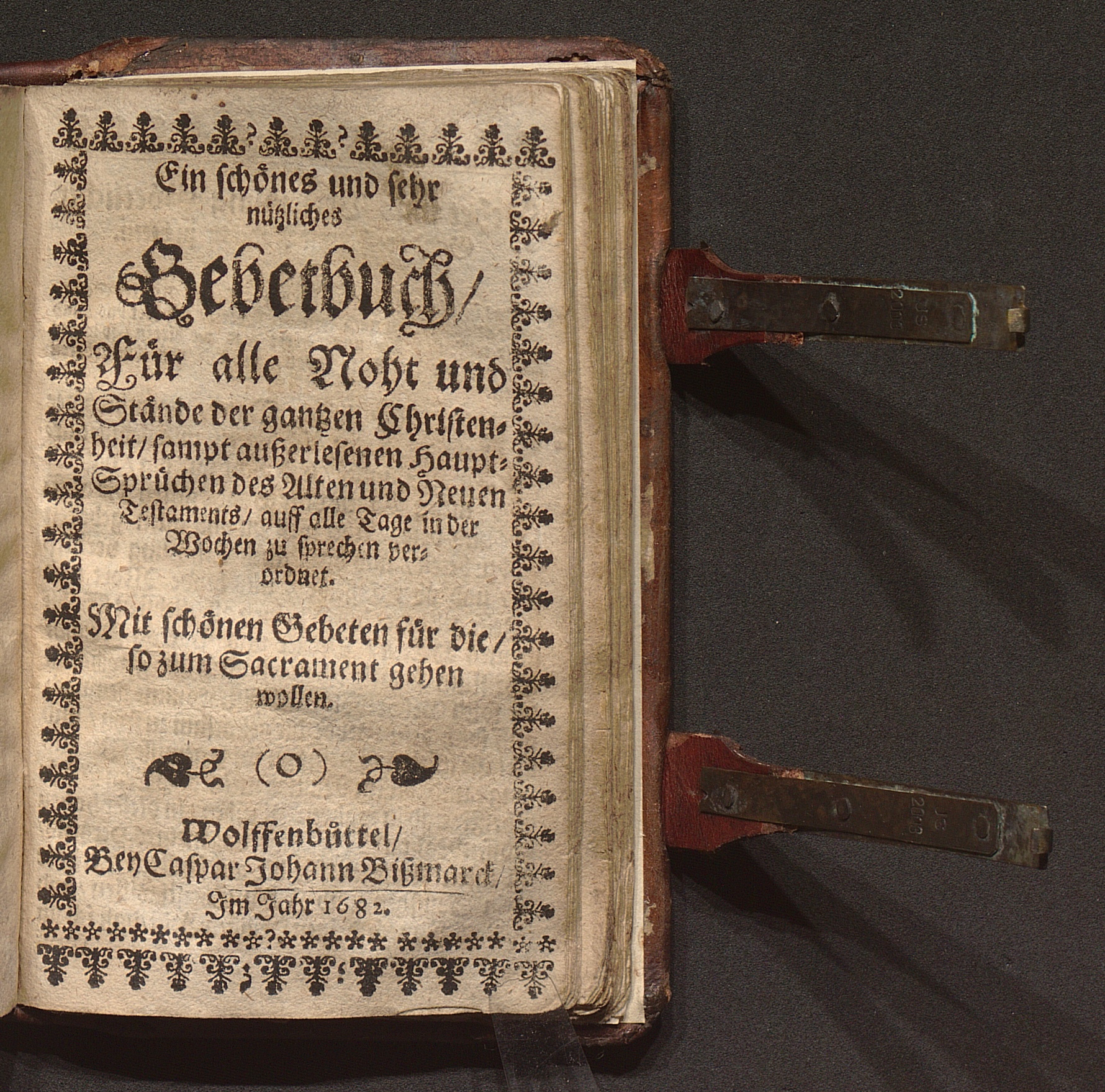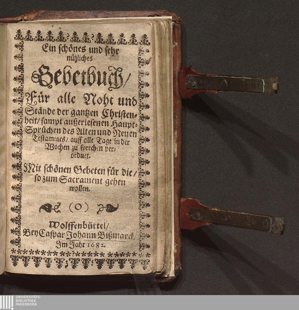 Ein schönes und sehr nützliches Gebetbuch/ Für alle Noht und Stände der gantzen Christenheit/ sampt außerlesenen Haupt-Sprüchen des Alten und Neuen Testaments/ auff alle Tage in der Wochen zu sprechen verordnet : Mit schönen Gebeten für die/ so zum Sacrament gehen wollen