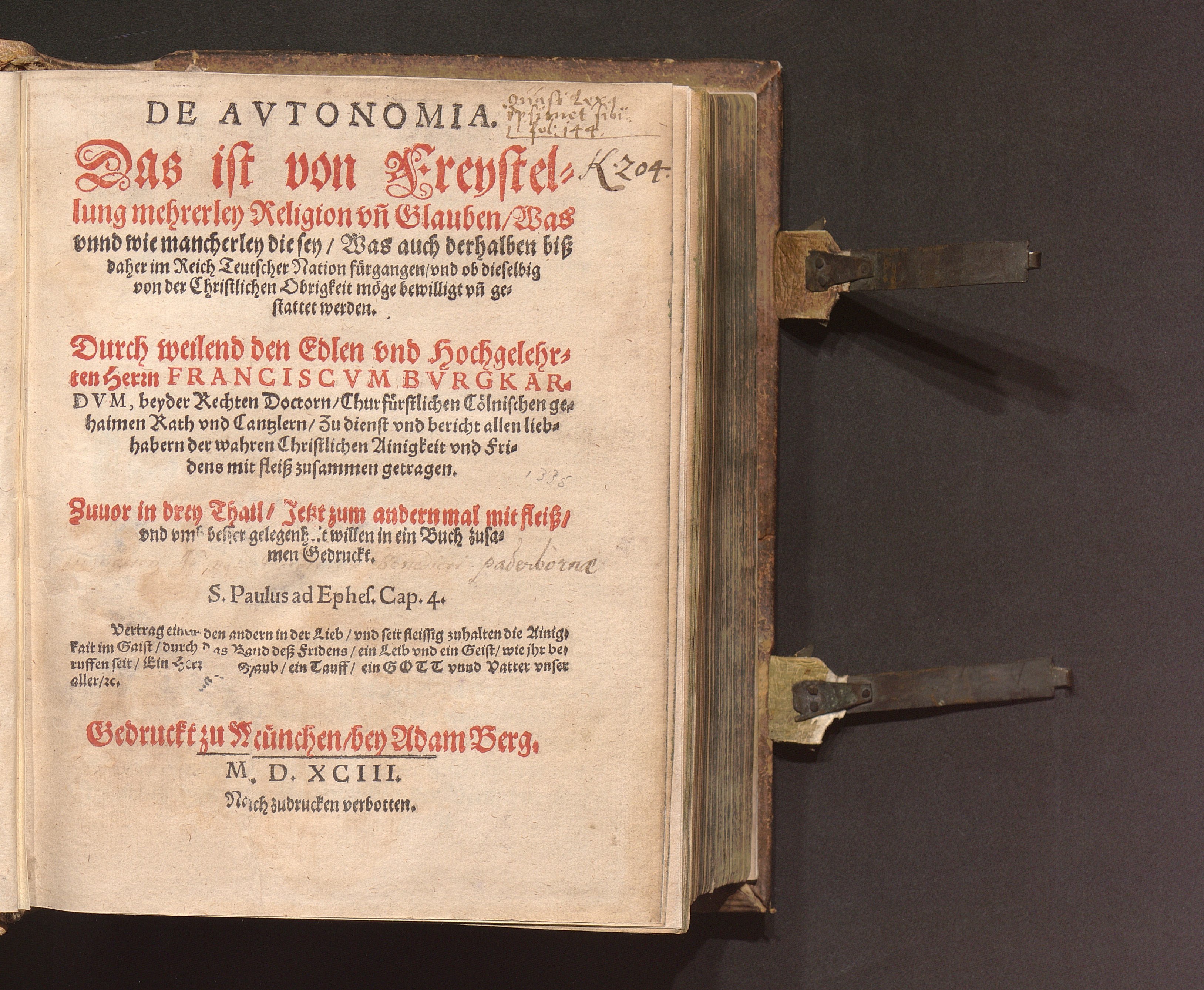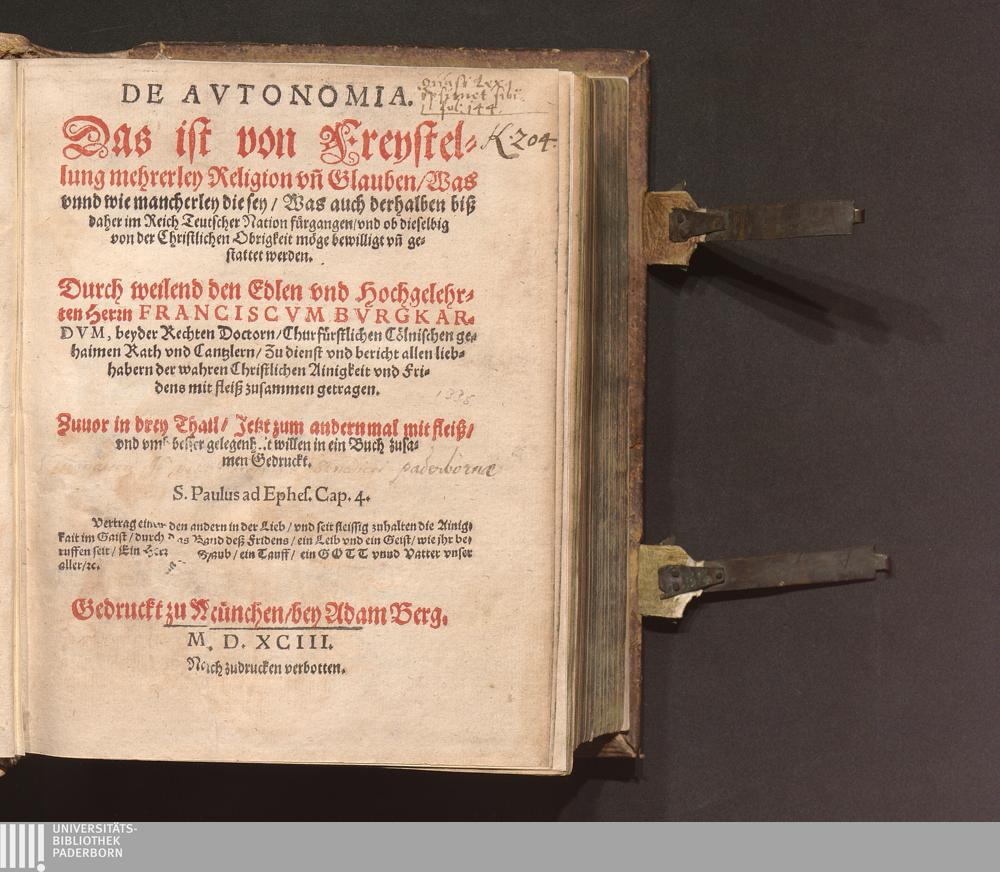 De Avtonomia. Das ist von Freystellung mehrerley Religion vn[d] Glauben/ Was vnnd wie mancherley die sey/ Was auch derhalben biß daher im Reich Teutscher Nation fürgangen/ vnd ob dieselbig von der Christlichen Obrigkeit möge bewilligt vn[d] gestattet werden / Durch weilend den Edlen vnd Hochgelehrten Herrn Franciscvm Bvrgkardvm, beyder Rechten Doctorn/ Churfürstlichen Cölnischen gehaimen Rath vnd Cantzlern ... mit fleiß zusammen getragen. [Hrsg. v. Adam Berg]